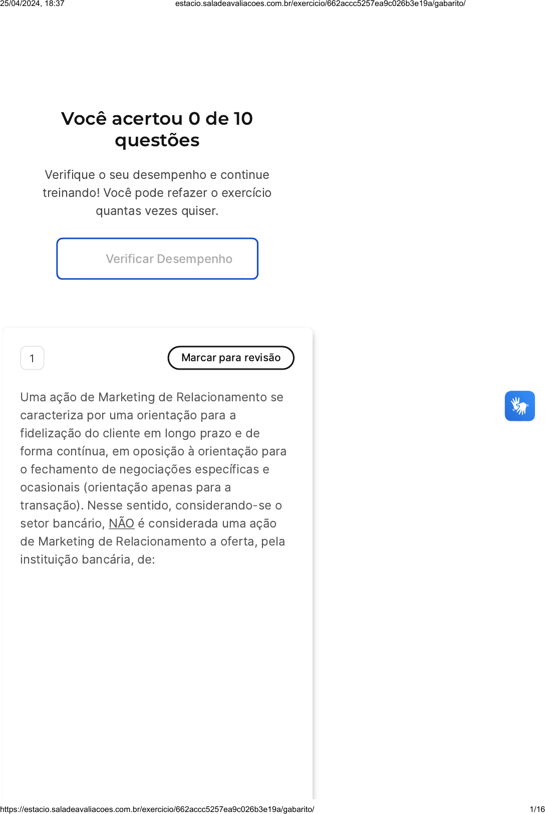 Você acertou 0 de 10 questões Verifique o seu desempenho e continue treinando! Você pode refazer o exercício quantas vezes quiser. Verificar Desempenho 1 Marcar para revisão Uma ação de Marketing de Relacionamento se caracteriza por uma orientação para a fidelização do cliente em longo prazo e de forma contínua, em oposição à orientação para o fechamento de negociações específicas e ocasionais (orientação apenas para a transação). Nesse sentido, considerando-se o setor bancário, NÃO é considerada uma ação de Marketing de Relacionamento a oferta, pela instituição bancária, de: 25/04/2024, 18:37 estacio.saladeavaliacoes.com.br/exercicio/662accc5257ea9c026b3e19a/gabarito/ https://estacio.saladeavaliacoes.com.br/exercicio/662accc5257ea9c026b3e19a/gabarito/ 1/16 A B C D E tarifas, proporcionalmente reduzidas a um cliente que, além da manutenção de uma conta corrente, mantenha aplicações financeiras e tenha adquirido outros produtos como, por exemplo, seguros, ou planos de capitalização. uma pontuação cumulativa sobre os gastos com cartões de crédito e a possível troca desses pontos por prêmios em mercadorias. uma tarifação mais baixa para manutenção de uma conta corrente, se comparada às instituições concorrentes, garantida pelo período de três meses, oferecida a um potencial novo correntista. uma remuneração mais atrativa para modalidades de poupança, conforme aumenta a variedade de aplicações e o montante aplicado pelo correntista. atendimento diferenciado em agências específicas, conforme o crescimento do número de produtos adquiridos pelo correntista junto à instituição (aplicações, seguros, previdência privada etc.) e o aumento do nível de renda desse correntista. Questão não respondida Opa! A alternativa correta é a letra C. Confira o gabarito comentado! 25/04/2024, 18:37 estacio.saladeavaliacoes.com.br/exercicio/662accc5257ea9c026b3e19a/gabarito/ https://estacio.saladeavaliacoes.com.br/exercicio/662accc5257ea9c026b3e19a/gabarito/ 2/16 Gabarito Comentado A alternativa correta é a C, que se refere à oferta de uma tarifação mais baixa para manutenção de uma conta corrente, se comparada às instituições concorrentes, garantida pelo período de três meses, oferecida a um potencial novo correntista. Esta opção não é considerada uma ação de Marketing de Relacionamento, pois é uma estratégia de curto prazo, focada em atrair novos clientes, e não em manter um relacionamento contínuo e de longo prazo com os clientes existentes, que é o objetivo principal do Marketing de Relacionamento. 2 Marcar para revisão Dadas as afirmações abaixo, que tratam da tentativa de retenção de clientes: 1ª � A "satisfação" é definida como a avaliação objetiva, com respeito a um bem ou serviço, contemplando ou não as necessidades e expectativas do cliente. PORQUE 2ª - a satisfação é influenciada pelas contrapartidas emocionais dos clientes, pelas causas percebidas para o resultado alcançado com o bem ou serviço e por suas percepções de ganho ou preço justo, podendo ou não acarretar fidelidade por parte do cliente. É correto afirmar que: 25/04/2024, 18:37 estacio.saladeavaliacoes.com.br/exercicio/662accc5257ea9c026b3e19a/gabarito/ https://estacio.saladeavaliacoes.com.br/exercicio/662accc5257ea9c026b3e19a/gabarito/ 3/16 A B C D E A primeira afirmação é falsa e a segunda é verdadeira. As duas afirmações são verdadeiras e a segunda não justifica a primeira. A primeira afirmação é verdadeira e a segunda é falsa. As duas afirmações são verdadeiras e a segunda justifica a primeira. As duas afirmações são falsas. Questão não respondida Opa! A alternativa correta é a letra A. Confira o gabarito comentado! Gabarito Comentado A alternativa correta é a "A". A primeira afirmação é falsa porque a satisfação não é apenas uma avaliação objetiva, mas também envolve aspectos subjetivos, como as emoções e percepções do cliente. A segunda afirmação é verdadeira, pois a satisfação do cliente é influenciada por diversos fatores, incluindo as contrapartidas emocionais, as causas percebidas para o resultado alcançado com o bem ou serviço e suas percepções de ganho ou preço justo. Esses fatores podem ou não levar à fidelidade do cliente. 25/04/2024, 18:37 estacio.saladeavaliacoes.com.br/exercicio/662accc5257ea9c026b3e19a/gabarito/ https://estacio.saladeavaliacoes.com.br/exercicio/662accc5257ea9c026b3e19a/gabarito/ 4/16 A B C D E 3 Marcar para revisão Para determinar as compensações justas para a recuperação de um serviço, a empresa pode se fazer três perguntas: I � Qual é o posicionamento da empresa no mercado? II � Qual a gravidade da falha de serviço? III � Quem é o cliente afetado? Avalie as afirmativas a seguir: I � Empresas que possuem reputação de excelência em serviços e que cobram valores mais altos, devem se esforçar mais para recuperar as falhas que ocorram. II � Independente do tamanho da falha no serviço, os clientes esperam uma compensação significativa sobre seu tempo, esforço, aborrecimento e ansiedade sofrida. III � Os clientes que consomem um serviço ocasional tendem a ser menos exigentes e representam menor importância econômica para a empresa. É (são) correta (s): I, apenas II, apenas III, apenas II e III, apenas I e III, apenas 25/04/2024, 18:37 estacio.saladeavaliacoes.com.br/exercicio/662accc5257ea9c026b3e19a/gabarito/ https://estacio.saladeavaliacoes.com.br/exercicio/662accc5257ea9c026b3e19a/gabarito/ 5/16 Questão não respondida Opa! A alternativa correta é a letra E. Confira o gabarito comentado! Gabarito Comentado As afirmativas I e III estão corretas. A afirmativa I está correta porque empresas com reputação de excelência em serviços e que cobram valores mais altos têm uma expectativa maior de qualidade por parte dos clientes, portanto, devem se esforçar mais para recuperar falhas. A afirmativa III também