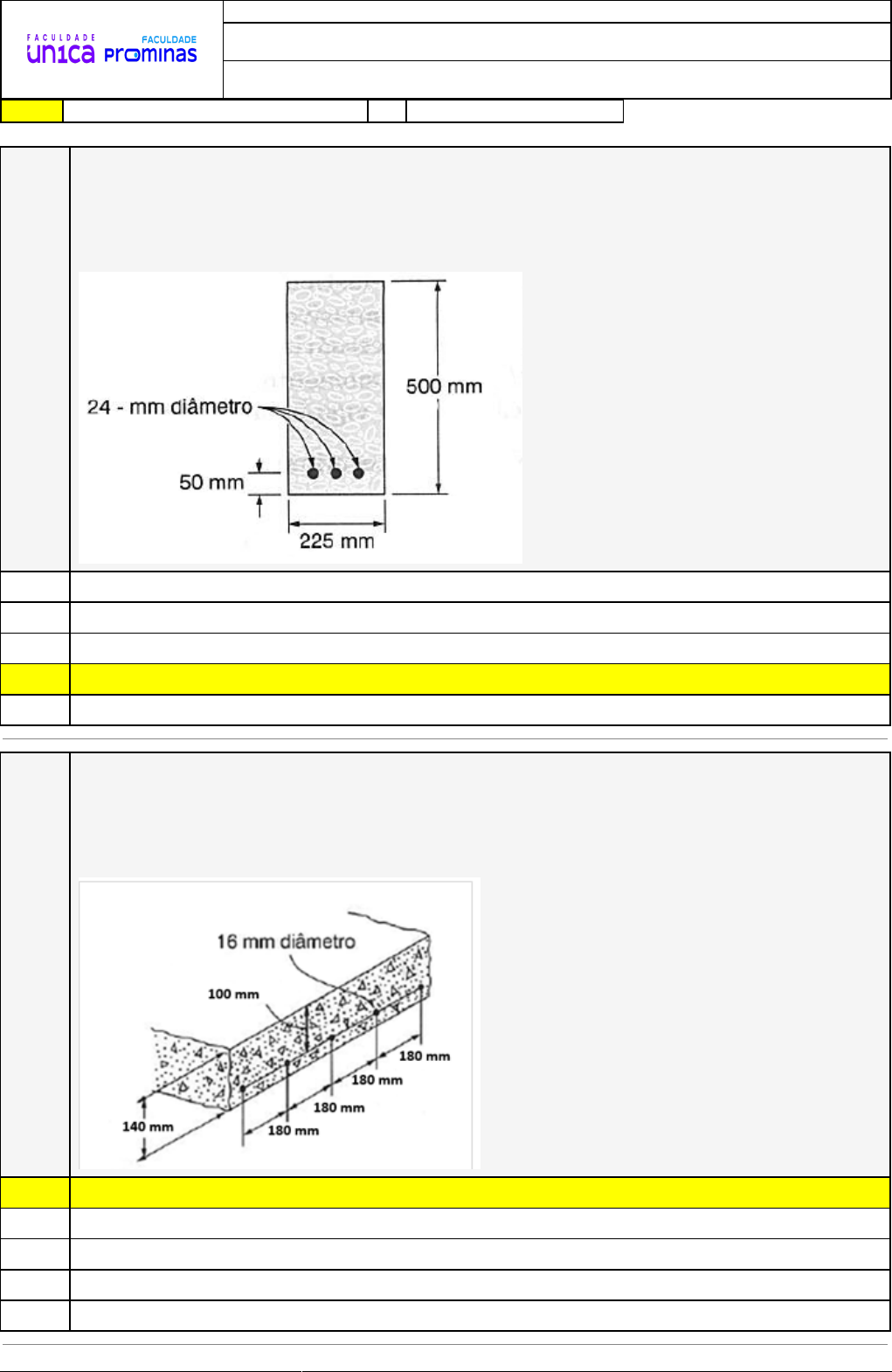 03/03/2024 23:25:20 1/3 REVISÃO DE SIMULADO Nome: LEONARDO OLIVEIRA SOUZA Disciplina: Mecânica dos Sólidos I Respostas corretas são marcadas em amarelo X Respostas marcardas por você. Questão 001 (Adaptada de BEER, 1995). Uma viga de concreto é reforçada por três barras de aço, colocadas como indicado na figura. Os módulos de elasticidade são 20 GPa para o concreto e 200 GPa para o aço. Usando uma atenção admissível de 10 MPa para o concreto e 150 MPa para o aço, determinar o maior momento fletor que pode ser aplicado à viga. A) M=37,8 kNm B) M=1,02 MNm C) M=29,2 kNm X D) M=79,1 kNm E) M=76,4 kNm Questão 002 (Adaptada de BEER, 1995). Uma laje de concreto é reforçada por hastes de aço de 16 mm de diâmetro colocadas a 180 mm de centro a centro como mostrado na figura abaixo. O módulo de elasticidade é de 20 GPa para o concreto e 200 GPa para o aço. Usando uma tensão admissível de 9 MPa para o concreto e de 120 MPa para o aço, determine o maior momento fletor por metro de largura que pode ser aplicado à laje. X A) M=11,73 kNm B) M=24,92 kNm C) M=43,09 kNm D) M=23,46 kNm E) M=5,86 kNm 03/03/2024 23:25:20 2/3 Questão 003 Para a viga e o carregamento mostrados na figura a seguir, determine a tensão normal máxima provocada pelo momento fletor na seção transversal C. Autor (2021) A) Tensão normal máxima = 8Mpa B) Tensão normal máxima = 9 Mpa X C) Tensão normal máxima = 89 Mpa D) Tensão normal máxima = 200 Mpa E) Tensão normal máxima = 10,89 Mpa Questão 004 Sabendo que a inércia de um círculo vale π.d4/64, calcule o módulo resistente da seção a seguir: Autor (2020) X A) W=π.(d4 )/(32.D) B) W=π.(D4)/(16.D) C) W=π.(D4-d4 )/(32) D) W=(D4-d4 )/(32.D) E) W=π.(D4-d4)/(32.D) 03/03/2024 23:25:20 3/3 Questão 005 (Adaptada de BEER, 1995). Uma viga de madeira simplesmente apoiada, seção transversal retangular e comprimento vão de 1,2 m está submetida a uma carga concentrada em seu ponto médio, além de seu próprio peso conforme a figura abaixo. A seção transversal tem largura de 140 mm e altura de 240 mm. O peso específico da madeira é 5,4 kN/m3. Qual o máximo valor permissível da carga P se a tensão fletora a permitida é de 8,5 MPa? A) P=28,0 kN B) P=22,0 kN C) P=45,0 kN D) P=34,0 kN X E) P=38,0 kN
