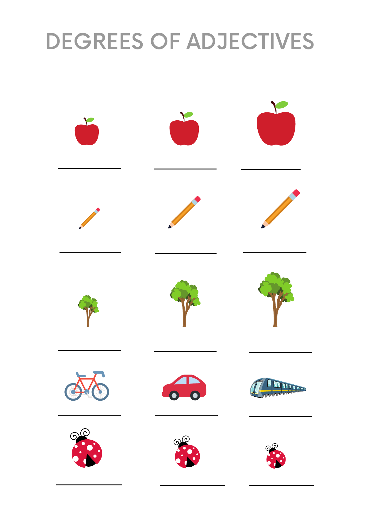 Directions: Complete each set by writing the appropriate degrees of comparison. big biggest longer tall taller longest faster fastest small smallest DEGREES OF ADJECTIVESDEGREES OF ADJECTIVES COMPARATIVES & SUPERLATIVES A comparison between two nouns. Eg. This dog is bigger than the other. A comparison of a noun with other nouns in a group. Eg. This dog is the biggest. COMPARATIVE SUPERLATIVE FILL THE GAPS tall taller brave bravest new newer ADJECTIVE SUPERLATIVECOMPARATIVE kind kindest When the adjective has two or more syllables, and doesn't end in 'y', use more and most. short shorter famous more famous most famous wonderful more wonderful interesting most interesting Comparatives and superlatives Uses of the comparative adjectives: We use comparative adjectives to show change or make comparisons: This car is certainly better, but is much more expensive. I'm feeling happier now. We need a bigger house for the family. We use "than" when we want to compare one thing with another: Mom is 3 years younger than my dad. My current city is bigger than the last one. An elephant is way bigger than a rat. Form and syllables: Adjectives with one syllable: We usually add -er to the adjective: Old - Older. Clean - Cleaner. Slow - Slower. If an adjective ends with -e, we add an -r: Safe - Safer. Nice - Nicer. If an adjective ends in a vowel and a consonant, we usually double the consonant: Big - Bigger. Hot - Hotter. Adjectives with two or more syllables: If it ends in a consonant and -y, we change -y for -i and add -er: Noisy - Noisier. Happy - Happier. Easy - Easier. We use "more" to make comparative forms for most two-syllable adjective and for all three-syllable adjectives: Beautiful - More beautiful. Dangerous - More dangerous. Stressful - More stressful. Uses of the superlative adjectives: We use it in comparisons to describe something as being of the highest degree or extreme. I'm the happiest I've ever been. That boy is the tallest in his class. Everest is the highest mountain. We use superlative adjectives when making comparisons of three or more people or things. Between Brazil, Chile and Argentina, Brazil is the warmest country. If we talk about Mars, Jupiter and the Earth, Jupiter is the biggest. Between the three planets, Jupiter has the most moons. Form and syllables: Adjectives with one syllable: We usually add -est to the adjective: Small - Smallest. Fast - Fastest. Clean - Cleanest. If an adjective ends with -e, we add -st: Large - Largest. Nice - Nicest. If an adjective ends in a vowel and a consonant, we usually double the consonant: Big - Biggest. Hot - Hottest. Adjectives with two or more syllables: If it ends in a consonant and -y, we change -y for -i and add -est:Silly - Silliest. Happy - Happiest. We use "most" to make superlative forms for most two-syllable adjective and for all three-syllable adjectives: Careful - More careful. Interesting - More interesting. We use "the" with superlative adjectives: That's the best film I've ever seen. Irregular comparatives and superlatives: These very common adjectives have completely irregular comparative and superlative forms. Good Better Best Bad Worse Worst Little Less Least Much More Most Far Further / Farther Furthest / Farthest Adjective Comparative Superlative Exercises: Complete the chart with the correct adjectives. Good Sad Prettiest Calm Happier Adjective Comparative Superlative Cleanest Dark Quickest Stronger Complete the following sentences with the correct use of the adjective. In the UK, streets are generally (narrow) than in the USA. My latin class is (boring) than my English class. Amanda is (ambitious) than her classmates. My garden is a lot (colorful) than this park. This house is (comfortable) than a hotel. Nothing could be (absurd) than such an idea. small tall bright old fuzzy firty funny noisy boring beautiful dangerous interesting good bad many far 1 Comparative & Superlative Adjectives Adjective Comparative Superlative describes a noun compares two nouns compares more than two nouns syllable -y 2+ ending syllables irregular Fill in the comparative and superlative forms of the adjectives below. Comparatives and superlatives Complete the sentences using the comparative form of each adjective. He is than his sister. (Young) Action movies are than the romantic ones. (Good) His pullover is than his jeans. (Dark) Her parents are than mine. (Strict) This jacket is than the blue one. (Comfortable) 1 2 Create any type of text using comparatives and superlatives adjectives.