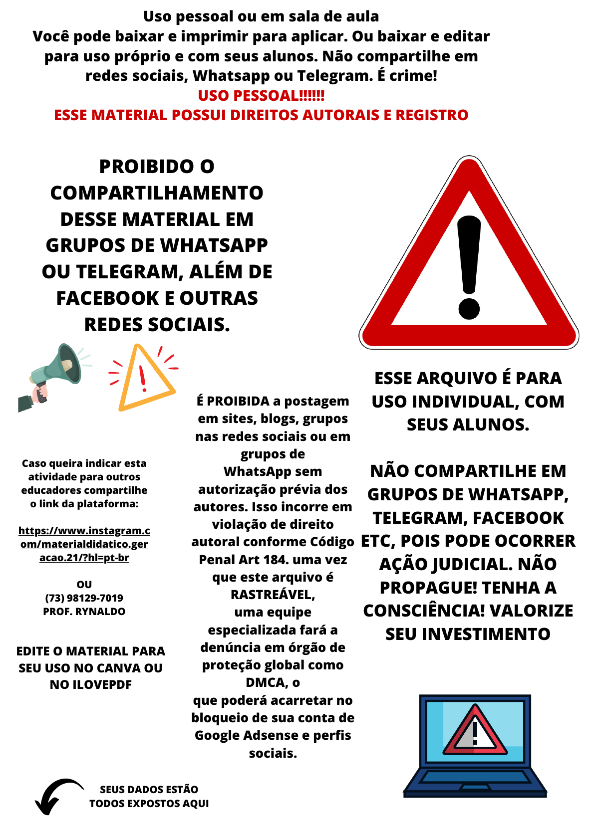 Uso pessoal ou em sala de aula Você pode baixar e imprimir para aplicar. Ou baixar e editar para uso próprio e com seus alunos. Não compartilhe em redes sociais, Whatsapp ou Telegram. É crime! USO PESSOAL!!!!!! ESSE MATERIAL POSSUI DIREITOS AUTORAIS E REGISTRO PROIBIDO O COMPARTILHAMENTO DESSE MATERIAL EM GRUPOS DE WHATSAPP OU TELEGRAM, ALÉM DE FACEBOOK E OUTRAS REDES SOCIAIS. ESSE ARQUIVO É PARA USO INDIVIDUAL, COM SEUS ALUNOS. NÃO COMPARTILHE EM GRUPOS DE WHATSAPP, TELEGRAM, FACEBOOK ETC, POIS PODE OCORRER AÇÃO JUDICIAL. NÃO PROPAGUE! TENHA A CONSCIÊNCIA! VALORIZE SEU INVESTIMENTO SEUS DADOS ESTÃO TODOS EXPOSTOS AQUI EDITE O MATERIAL PARA SEU USO NO CANVA OU NO ILOVEPDF É PROIBIDA a postagem em sites, blogs, grupos nas redes sociais ou em grupos de WhatsApp sem autorização prévia dos autores. Isso incorre em violação de direito autoral conforme Código Penal Art 184. uma vez que este arquivo é RASTREÁVEL, uma equipe especializada fará a denúncia em órgão de proteção global como DMCA, o que poderá acarretar no bloqueio de sua conta de Google Adsense e perfis sociais. Caso queira indicar esta atividade para outros educadores compartilhe o link da plataforma: https://www.instagram.c om/materialdidatico.ger acao.21/?hl=pt-br OU (73) 98129-7019 PROF. RYNALDO Licença para uso somente de: Natália Balestrin - 3109 / 2024-02-06 14:46:15 - https://www.historialudica.com.br 20242024 VOL. 1VOL. 1 RECOMPOSIÇÃO DAS APRENDIZAGENSRECOMPOSIÇÃO DAS APRENDIZAGENS Profº Rynaldo Andrade 8º ANO8º ANO Licença para uso somente de: Natália Balestrin - 3109 / 2024-02-06 14:46:15 - https://www.historialudica.com.br Todos os direitos reservados a @materialdidatico.geracao.21 - 2024 Proibida a reprodução em redes sociais. Autor Rynaldo Andrade Licenciado em Geografia e Especialista em Ensino de Geografia pela Universidade Estadual de Santa Cruz (UESC-BA); Membro da Comunidade Professor Autor (CPA); Professor da rede pública no Estado da Bahia. Licença para uso somente de: Natália Balestrin - 3109 / 2024-02-06 14:46:15 - https://www.historialudica.com.br CONTEÚDOSCONTEÚDOS 8º ano - Vol.18º ano - Vol.1 Objeto de conhecimento: Iluminismo Objeto de conhecimento: Revolução Francesa Objeto de conhecimento: Revolução Industrial Objeto de conhecimento: A formação dos Estados Unidos Objeto de conhecimento: Os libertadores da América e os movimentos de libertação Objeto de conhecimento: A Independência do Haiti Objeto de conhecimento: Revoluções na América Espanhola Objeto de conhecimento: Revoltas e conjurações na América Portuguesa Objeto de conhecimento: A chegada da família real ao Brasil - O período joanino Objeto de conhecimento: Brasil Império: I Reinado Objeto de conhecimento: Brasil Império: período regencial Objeto de conhecimento: Brasil Império: revoltas regenciais Todos os direitos reservados a @materialdidatico.geracao.21 - 2024 Proibida a reprodução em redes sociais. Licença para uso somente de: Natália Balestrin - 3109 / 2024-02-06 14:46:15 - https://www.historialudica.com.br TEXTO-BASE O Iluminismo, um movimento intelectual e filosófico que dominou o mundo das ideias na Europa durante o século XVIII, é frequentemente caracterizado como uma época de grande avanço na compreensão humana e na aplicação da razão. Princípios Fundamentais do Iluminismo Racionalismo: O Iluminismo promovia a ideia de que a razão humana poderia ser usada para combater a ignorância, a superstição e a tirania. Era vista como a chave para alcançar o conhecimento e melhorar a sociedade. 1. Empirismo e Ciência: O movimento valorizava o conhecimento científico baseado na observação e na experiência, o que levou a avanços significativos em várias ciências. 2. Humanismo Secular: Embora não necessariamente anti-religioso, o Iluminismo enfatizava abordagens seculares para entender o mundo, diminuindo a influência da religião na governança e na ciência. 3. Liberdade e Igualdade: As ideias de liberdade individual, igualdade perante a lei e o direito de participar no governo foram centrais, influenciando futuras formas democráticas de governo. 4. Filósofos e Contribuições Importantes Immanuel Kant: Um dos pensadores mais influentes do Iluminismo, Kant argumentou que as pessoas deveriam ser livres para usar sua própria razão em todas as questões. 1. Adam Smith: Em economia, Smith promoveu a ideia do livre mercado e da mão invisível, argumentando que a riqueza das nações derivava do trabalho e da produção, e não apenas da acumulação de ouro e prata. 2. Denis Diderot: Editor da famosa "Enciclopédia", que visava reunir todo o conhecimento do mundo e torná-lo acessível ao público. 3. Impactos e Consequências Revoluções Políticas: As ideias iluministas foram uma força motriz por trás da Revolução Americana (1776) e da Revolução Francesa (1789), ambas buscando estabelecer sociedades baseadas em princípios de igualdade, liberdade e fraternidade. 1. Desafio às Estruturas de Poder: O Iluminismo desafiou as estruturas tradicionais de poder, como a monarquia absolutista e a Igreja Católica, promovendo ideias de governança baseada em leis racionais. 2. Educação e Ilustração: Havia um grande foco na educação e no conhecimento como meios de emancipar indivíduos e sociedades. 3. HABILIDADE (S) BNCC: EF08HI01 NOME: ...................................................................................................................... SÉRIE/TURMA:................PROFESSOR (A): .......................................................... DATA:......./......./.......... ATIVIDADE DE HISTÓRIA Objeto de conhecimento: Iluminismo Licença para uso somente de: Natália Balestrin - 3109 / 2024-02-06 14:46:15 - https://www.historialudica.com.br Legado do Iluminismo Modernidade: O Iluminismo é frequentemente visto como o início da era moderna, com suas ideias formando a base de muitos aspectos da vida contemporânea, incluindo democra