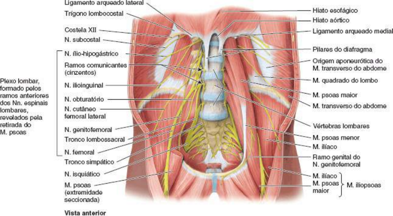 *Os músculos psoas maior e ilíaco fundem-se inferiormente e formam coletivamente o músculo iliopsoas. Figura 2.97 Músculos e nervos da parede posterior do abdome. A maior parte do músculo psoas maior direito foi removida para mostrar que o plexo nervoso lombar é formado pelos ramos anteriores dos quatro primeiros nervos espinais lombares e que está na substância do músculo psoas maior. MÚSCULO QUADRADO DO LOMBO O músculo quadrado do lombo, quadrilateral, forma uma lâmina muscular espessa na parede posterior do abdome (Figuras 2.94A e B, 2.96 e 2.97). Situa-se adjacente aos processos transversos lombares e é mais largo inferiormente. Próximo da costela XII, o ligamento arqueado lateral cruza o músculo quadrado do lombo. O nervo subcostal passa posteriormente a esse ligamento e segue em sentido inferolateral sobre o músculo quadrado do lombo. Os ramos do plexo lombar seguem inferiormente sobre a face anterior deste músculo. Nervos da parede posterior do abdome Os componentes dos sistemas nervosos somático e autônomo (visceral) estão associados à parede posterior do abdome. Os nervos subcostais (ramos anterior de T12) originam-se no tórax, passam posteriormente aos ligamentos arqueados laterais até o abdome, e seguem em sentido inferolateral na face anterior do músculo quadrado do lombo (Figura 2.97). Eles atravessam os músculos transverso do abdome e oblíquo interno do abdome para inervar o músculo oblíquo externo do abdome e a pele da parede anterolateral do abdome. Os nervos espinais lombares (L1–L5) saem da medula espinal através dos forames IV inferiormente às vértebras correspondentes, onde se dividem em ramos posterior e anterior. Cada ramo tem fibras sensitivas e motoras. Os ramos posteriores seguem posteriormente para inervar os músculos do dorso e a pele sobrejacente, enquanto os ramos anteriores seguem lateral e inferiormente, para suprir a pele e os músculos da parte inferior do tronco e os membros inferiores. As partes iniciais dos ramos anteriores dos nervos espinais L1, L2 e, às vezes, L3 dão origem aos ramos comunicantes brancos, que conduzem fibras simpáticas pré-ganglionares para os troncos simpáticos lombares. A parte abdominal dos troncos simpáticos (troncos simpáticos lombares), formada por quatro gânglios simpáticos paravertebrais lombares e os ramos interganglionares que os unem, é contínua com a parte torácica dos troncos profundamente aos ligamentos arqueados mediais do diafragma. Os troncos lombossacrais descem nas faces anterolaterais dos corpos das vértebras lombares em um sulco formado pelo músculo psoas maior adjacente. Inferiormente, eles cruzam o promontório da base do sacro e continuam em sentido inferior até a pelve como a parte sacral dos troncos. Para a inervação da parede do abdome e dos membros inferiores, as sinapses entre as fibras pré-ganglionares e pós-- ganglionares ocorrem nos troncos simpáticos. As fibras simpáticas pós-ganglionares seguem da face lateral dos troncos através dos ramos comunicantes cinzentos até os ramos anteriores. Tornam-se os nervos toracoabdominais e subcostais e o plexo lombar (nervos somáticos), que propiciam estimulação vasomotora, sudomotora e pilomotora na parte inferior do tronco e no membro inferior. Os nervos esplâncnicos lombares originados na face medial dos troncos simpáticos lombares conduzem fibras simpáticas pré-ganglionares para a inervação das vísceras pélvicas. O plexo nervoso lombar forma-se anteriormente aos processos transversos lombares, dentro da fixação proximal do músculo psoas maior. Essa rede nervosa é formada pelos ramos anteriores dos nervos L1 a L4. Os nervos a seguir são ramos • • • • • • • • do plexo lombar; os três maiores são citados primeiro: O nervo femoral (L2–L4) emerge da margem lateral do músculo psoas maior, inerva o músculo ilíaco e passa profundamente ao ligamento inguinal/trato iliopúbico até a face anterior da coxa, suprindo os músculos flexores do quadril e extensores do joelho O nervo obturatório (L2–L4) emerge da margem medial do músculo psoas maior e segue até a pelve menor, passando inferiormente ao ramo superior do púbis (através do forame obturado) até a face medial da coxa, suprindo os músculos adutores O tronco lombossacral (L4, L5) passa sobre a asa do sacro e desce até a pelve para participar na formação do plexo sacral com os ramos anteriores dos nervos S1–S4 Os nervos ilioinguinal e ílio-hipogástrico (L1) originam-se do ramo anterior de L1, entrando no abdome posteriormente ao ligamento arqueado medial e seguindo inferolateralmente, anteriormente ao músculo quadrado do lombo. Seguem superior e paralelamente à crista ilíaca, perfurando o músculo transverso do abdome perto da EIAS. A seguir, eles atravessam os músculos oblíquos interno e externo do abdome para suprir os músculos abdominais e a pele das regiões inguinal e púbica. A divisão do ramo anterior de L1 pode ocorrer tão distalmente quanto a EIAS, de modo que muitas vezes apenas um nervo (L1) cruza a parede posterior do abdome em vez de dois O nervo genitofemoral (L1, L2) perfura o músculo psoas maior e segue inferiormente sobre sua face anterior, profundamente à fáscia do músculo iliopsoas; divide-se lateralmente às artérias ilíacas comum e externa em ramos femoral e genital O nervo cutâneo femoral lateral da coxa (L2, L3) segue inferolateralmente sobre o músculo ilíaco e entra na coxa profundamente ao ligamento inguinal/trato iliopúbico, logo medialmente à EIAS; inerva a pele na face anterolateral da coxa Um nervo obturatório acessório (L3, L4) é encontrado em quase 10% das pessoas. É paralelo à margem medial do músculo psoas, anterior ao nervo obturatório, cruzando superiormente ao ramo superior do púbis, bem próximo da veia femoral. Embora os ramos maiores (femoral, obturatório e tronco lombossacral) tenham posições regulares, deve-se prever a variação na disp