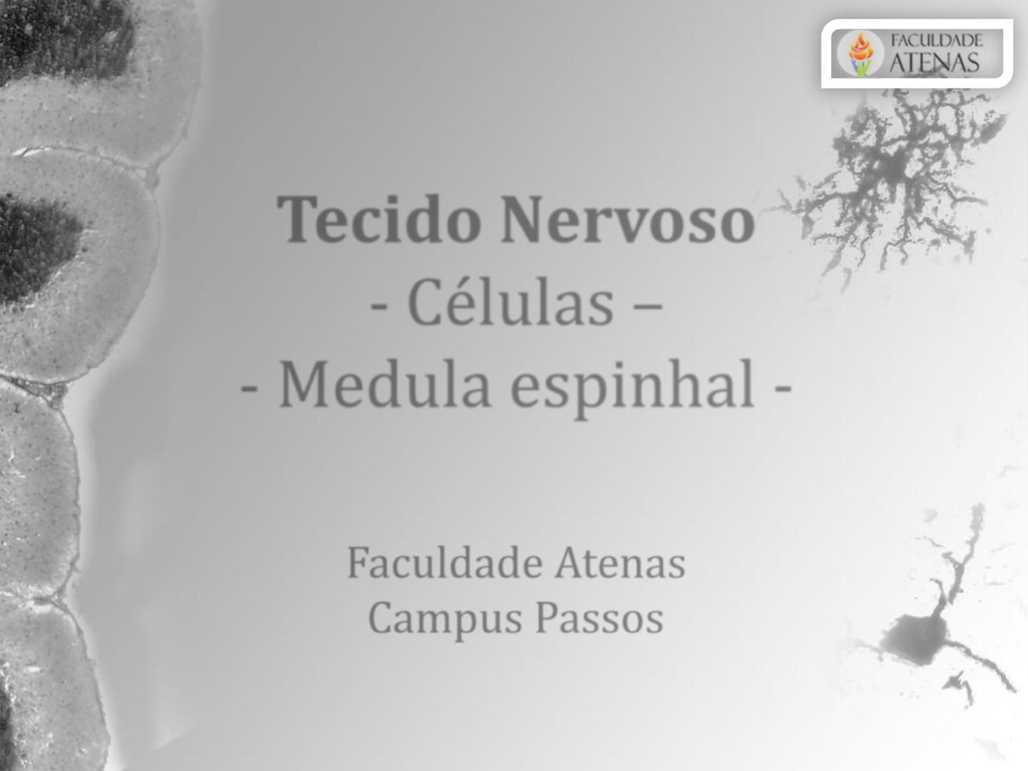 Tecido Nervoso - Células – - Medula espinhal - Faculdade Atenas Campus Passos Sistema Nervoso Divisão Partes Funções Gerais Sistema Nervoso Central (SNC) Encéfalo e Medula Espinhal Processamento e Integração de informações Sistema Nervoso Periférico (SNP) Nervos e gânglios Condução de informações entre órgão receptores de estímulos, o SNC e órgãos efetores (ex. músculos) Sistema Nervoso Divisão funcional • Sistema Nervoso Somático • Componente aferente (sensitivo) • Componente efererente (motor) • Sistema Nervoso Visceral (vegetativa) • Componente aferente (sensitivo) • Leva informações das vísceras para o SNC • Componente eferente (autônomo) • Sistema Nervoso Simpático • Sistema Nervoso Parassimpático Sistema Nervoso Sistema Nervoso Autônomo Controla: Músculo liso Músculo cardíaco Glândulas exócrinas Algumas glândulas endócrinas Parte do tecido adiposo Diferença fundamental entre o Simpático e Parassimpático Tipo de mediadores químicos que são liberados Neurônios colinérgicos - Parassimpáticos e simpáticos pré-ganglionares Neurônios adrenérgicos - Simpáticos pós-ganglionares Sistema Nervoso Impulso nervoso • Neurônio aferente • Conduz o impulso nervoso do receptor para o SNC • Responsável por levar informações da superfície do corpo para o interior • Relaciona o meio interno com o meio externo. • Neurônio eferente • Conduz o impulso nervoso do SNC ao efetuador (músculo ou glândula) • Neurônio de associação • Faz a união entre n. aferentes e n. eferentes • Corpo celular localiza-se dentro do SNC Sistema Nervoso Organização funcional do Sistema Nervoso Sistema nervoso Componentes • DESCREVER AS CÉLULAS: Sistema nervoso Componentes Neurônios Transmissão da informação Diferença de potencial elétrico Células da neuróglia Ou glia Função: sustentação, defesa, etc Componentes: - astrócitos - oligodendrócitos - células da micróglia - células ependimárias - células satélites - células de Schwann SNP SNC Neurônio Morfologia • Corpo celular • Ou soma, ou pericário • Contém: - núcleo - várias organelas - inclusões citoplasmáticas - componentes do citoesqueleto Neurônio Morfologia • Núcleo • Grande • Esférico • Coloração pálida • Centralmente localizado no pericário da maioria dos neurônios • Abundante eucromatina • Nucléolo grande Pontos de seta – núcleo (claro e formado por eucromatina e nucléolos volumosos Seta - prolongamentos espesso s de neurônios Neurônio Morfologia • Organelas e inclusões citoplasmáticas • Corpos de Nissl: polissomos e retículo endoplasmático rugoso(RER) • Aglomerados • Abundantes • Em grandes neurônios motores • Complexo de Golgi • Próximo ao núcleo • Mitocôndrias dispersas Neurônio Morfologia • Organelas e inclusões citoplasmáticas • Grânulos de melanina • Em neurônios no SNC e raiz dorsal e nos gânglios simpáticos • Grânulos de lipofuscina • Aumento do número com a idade • Gotículas de límpidos ocasionalmente presentes Neurônio Morfologia • Cistoesqueleto • Neurofilamentos • 10 nm diâmetro • Abundantes • Ao longo do citoplasma • Microtúbulos • 24 nm diâmetro • Presentes no citoplasma • Microfilamentos • Filamentos de actina • 6 nm de diâmetro • Associados à membrana plasmática Neurônio motor da medula espinal. Citoplasma com muitos grânulos de Nissl. Núcleo grande, com um nucléolo esférico, fortemente corado. Neurônio Morfologia • Dendritos • Recebem estímulos de células sensoriais, axônios ou outros neurônios • Convertem sinais em impulsos elétricos • Potenciais de ação • Citoplasma não possui um complexo de Golgi • Organelos em número reduzidos ou ausentes perto dos terminais Setas - neurônios e prolongamentos principais Pontas de seta -prolongamentos secundários Coloração pro impregnação argêntica Neurônio Morfologia • Dendritos • Mitocôndrias abundantes • Processos espinhosos aumentam a área para a formação de sinapse • Diminuem com a idade e má nutrição Setas - neurônios e prolongamentos principais Pontas de seta -prolongamentos secundários Coloração pro impregnação argêntica Neurônio Morfologia • Bipolares: • Apresentam um único axônio e um único dendrito • Local: gânglios coclear e vestibular, na retina e na mucosa olfatória • Multipolares: • Apresentam um único axônio e vários dendritos • Maioria Neurônio Morfologia • Pseudounipolares: • Apresentam um único axônio com uma só neurofibra • Local: gânglios espinais, e gânglios cranianos Neurônio Classificação funcional • Neurônios motores • Controlam órgãos efetores, tais como glândulas exócrinas e endócrinas e fibras musculares Neurônios sensoriais Recebem estímulos sensoriais do meio ambiente e do próprio organismo Interneurônios Estabelecem conexões entre outros neurônios, formando circuitos complexos Comunicação sináptica Sinapse • Sinapse: transmissão unidirecional dos impulsos nervosos • Contato: neurônio ↔ neurônio neurônio ↔ células musculares neurônio ↔ células glandulares • Terminais axônicos de neurônios em contato com o pericário • Função: transforma sinais elétricos em químicos Comunicação sináptica Sinapse • Terminal terminal pré-sináptico • Terminal axônico que produz impulso • Terminal pós-sináptico • Região da superfície da célula • Geração de novo sinal • Fenda pós -sináptica • Espaço de novo sinal 1. Axônio 2. Vesículas sinápticas 3. Terminal pré-sináptico 4. Terminal pós-sináptico 5. membrana externa da mitocôndria 6. Crista da mitocôndria Comunicação sináptica Tipos de sinapse • Axossomática • Axônio ↔ Corpo celular • Axodendrítica • Axônio ↔ Dendrito • Axoaxônica • Axônio ↔ Axônio Comunicação sináptica Vesículas sinápticas • Vesículas contendo