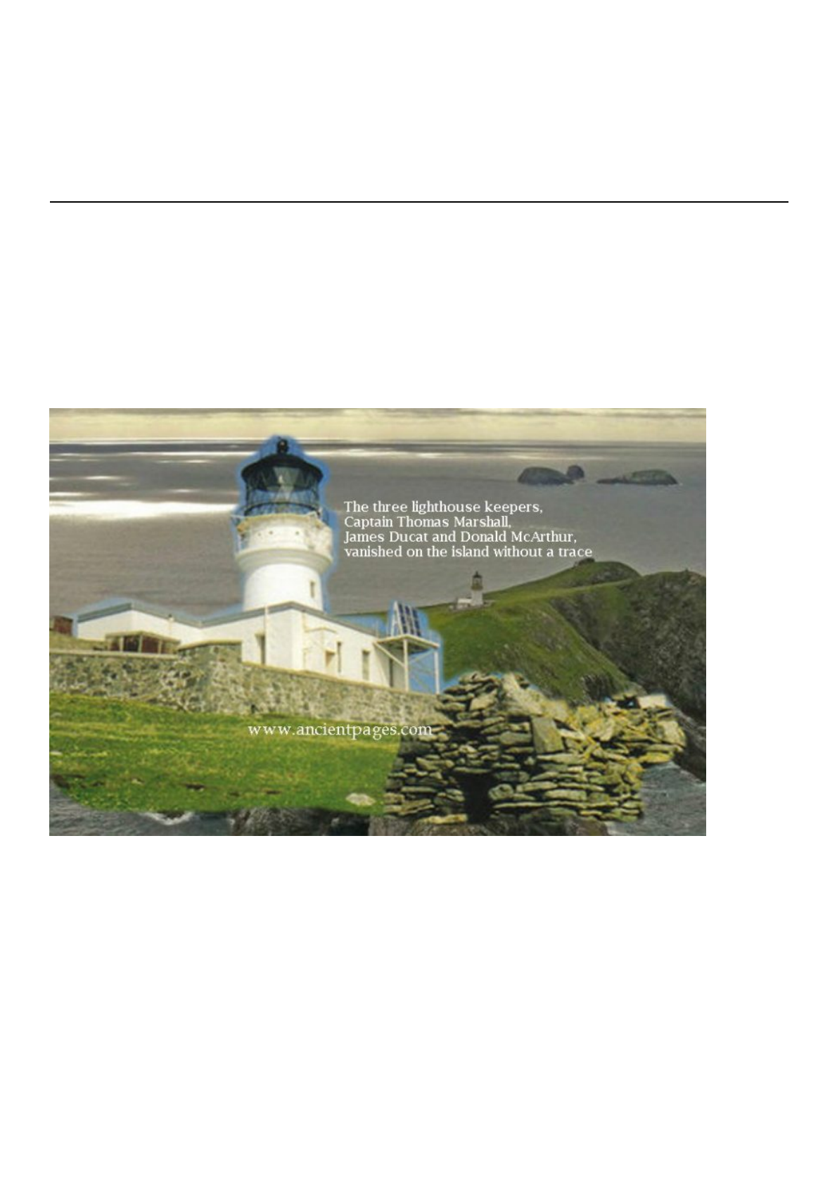 1/4 Desaparecimento misterioso do farol Eilean Mor permanece sem solução Em 26 de dezembro de 1900, algo estranho e inexplicável aconteceu na maior das Ilhas Flannan, Eilean Mor, Escócia. Três faroleiros desapareceram durante a noite, para nunca mais serem vistos. Seu misterioso desaparecimento ainda confunde historiadores e cientistas. Os três faroleiros, o capitão Thomas Marshall, James Ducat, e Donald McArthur, desapareceram na ilha sem deixar vestígios, deixando apenas especulações para trás. Nas remotas Hébridas Exteriores, um pequeno navio foi enviado para as Ilhas Flannan. Seu destino era o farol de Eilean Mor. Nomeado após St. Flannen, um bispo irlandês do século VI que mais tarde se tornou um santo, a ilha estava completamente desabitada, além de seus faroleiros. O navio transportava suprimentos e uma mudança de tripulação, mas devido à tempestade, isso foi atrasado. Quando o navio chegou a Eilean Mor, não havia sinal dos três faroleiros. O capitão James Harvey, que estava no comando do navio de abastecimento, soprou sua buzina e enviou um sinalizador de aviso para atrair a atenção, mas não houve resposta. Em circunstâncias normais, alguém deveria estar esperando na frente do farol para receber o navio. https://www.ancientpages.com/wp-content/uploads/2018/12/lightkeeprsvanished161.jpg 2/4 Tudo parecia muito estranho. O interior do farol era como deveria ser, com óleo nas lâmpadas esperando para ser aceso e cinzas na grade. A única coisa que apareceu fora do comum foram os dois conjuntos de peles a óleo que faltavam - o equipamento ao ar livre que os guardiões vestiam. Restava apenas um conjunto, pertencente a Donald McArthur. Obviamente, ele tinha saído em uma tempestade feroz apenas em suas roupas. Isso não foi apenas inédito, mas também ilegal. Uma das regras do Conselho do Farol do Norte era que um homem deve sempre permanecer dentro do farol. Então, porque é que ele deixou o farol? O capitão James Harvey rapidamente enviou de volta um telegrama para o continente, que por sua vez foi encaminhado para a sede do Conselho do Farol do Norte em Edimburgo. O telégrafo lê-se: Um acidente terrível aconteceu em Flannans. Os três Guardiões, Ducat, Marshall e o ocasional, desapareceram da ilha. Na nossa chegada lá esta tarde, nenhum sinal de vida era para ser visto na Ilha. O farol de Eilean Mor das Ilhas Flannan. Crédito da imagem: Marc Calhoun - CC BY-SA 2.0 Disparar um foguete, mas, como nenhuma resposta foi feita, conseguiu pousar Moore, que foi até a Estação, mas não encontrou Guardiões lá. Os relógios foram parados e outros sinais indicaram que o acidente deve ter acontecido há cerca de uma semana. Os pobres devem ter sido derrubados sobre os penhascos ou se afogado tentando garantir um guindaste ou algo assim. Noite chegando, mal podíamos esperar para fazer algo quanto ao seu destino. Deixei Moore, MacDonald, Buoymaster e dois Marinheiros na ilha para manter a luz acesa até que você faça outros arranjos. Não voltarei a Oban até que eu ouça de ti. Repeti este arame para Muirhead no https://www.ancientpages.com/wp-content/uploads/2018/12/eilenamorlighthouse.jpg 3/4 caso de não estares em casa. Eu vou ficar no escritório do telégrafo esta noite até que ele feche se você quiser me ligar. Alguns dias depois, Robert Muirhead, o sobrenadante do conselho que recrutou e conhecia os três homens pessoalmente, partiu para a ilha para investigar os desaparecimentos. Sua investigação sobre o farol não encontrou nada além do que Moore já havia relatado. Ou seja, exceto pelo tronco do farol... Muirhead rapidamente notou que os últimos dias de entradas eram incomuns. Em 12 de dezembro, Thomas Marshall, o segundo assistente, escreveu sobre os ventos tão longos como nunca vi em vinte anos. Ele também notou que James Ducat, o Guardião Principal, estava “muito quieto” e que o terceiro assistente, William McArthur, estava chorando. O que é estranho sobre a observação final foi que William McArthur era um marinheiro experiente e era conhecido no continente escocês como um brawler duro. Por que ele choraria por causa de uma tempestade? As entradas de login no dia 13 de dezembro afirmaram que a tempestade ainda estava em fúria e que todos os três homens estavam orando. Mas por que três farol experientes, situados com segurança em um farol novo que estava a 150 pés acima do nível do mar, estariam orando para que uma tempestade parasse? Deviam estar perfeitamente seguros. Ainda mais peculiar é que não houve tempestades relatadas na área nos dias 12, 13 e 14 de dezembro. Na verdade, o tempo estava calmo, e as tempestades que deveriam atingir a ilha não atingiram até 17 https://www.ancientpages.com/wp-content/uploads/2018/12/flannanisle.jpg 4/4 de dezembro. A entrada final do registro foi feita no dia 15 de dezembro. Ele simplesmente dizia: “Atorm terminou, o mar calmo. Deus está sobre tudo”. O que se entende por “Deus está acima de tudo”? Os investigadores concluíram que dois dos homens devem ter estado fora durante a tempestade e foram varridos pelas ondas. Donald McArthur, em seguida, correu para o seu socorro, mas também foi varrido. Mas mesmo a investigação oficial foi mera especulação, já que nenhuma prova dessa história jamais apareceu, e a explicação deixou algumas pessoas no Conselho do Farol do Norte não convencidos. Muitos ainda se perguntam por que nenhum dos corpos chegou à costa? É simplesmente como se os três homens saíssem da ilha, para nunca mais serem vistos. Ao longo das décadas seguintes, os guardiões do farol subsequentes em Eilean Mor relataram vozes estranhas ao vento, chamando os nomes dos três homens mortos. Várias especulações surgiram, mas o fato permanece - o misterioso desaparecimento dos três faroleiros permanece sem solução. Atualizado em 7 de outubro, 2023 Escrito por A. Sutherland - AncientPages.com Escritor de Pessoal Sênior Direitos autorais ? A