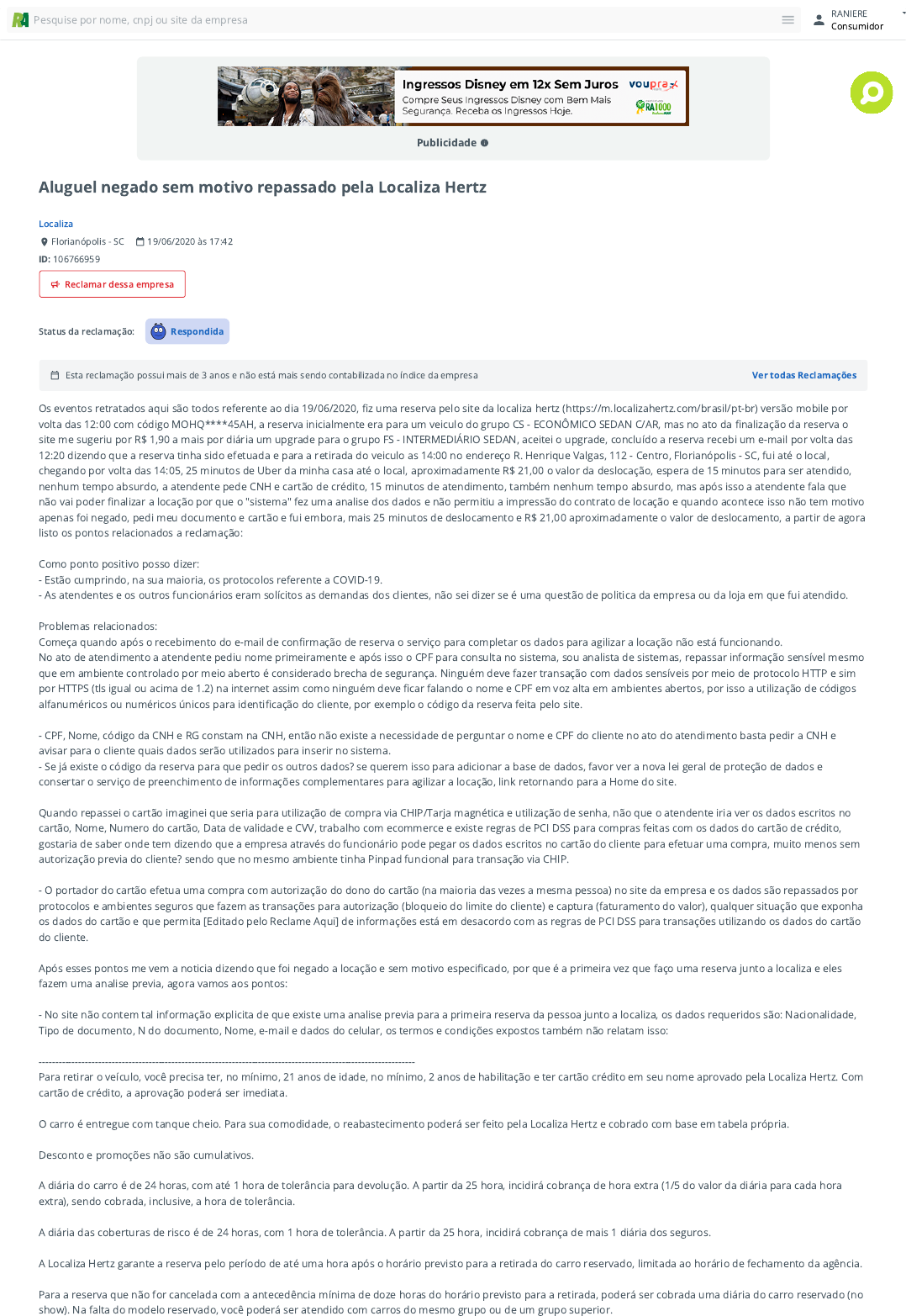 20/12/2023, 16:49 Aluguel negado sem motivo repassado pela Localiza Hertz - Localiza - Reclame Aqui https://www.reclameaqui.com.br/localiza-aluguel-de-carros/aluguel-negado-sem-motivo-repassado-pela-localiza-hertz_IpGerEftSHLKNgjA/ 1/5 Publicidade Aluguel negado sem motivo repassado pela Localiza Hertz Localiza Florianópolis - SC 19/06/2020 às 17:42 ID: 106766959 Status da reclamação: Esta reclamação possui mais de 3 anos e não está mais sendo contabilizada no índice da empresa Ver todas Reclamações Os eventos retratados aqui são todos referente ao dia 19/06/2020, �z uma reserva pelo site da localiza hertz (https://m.localizahertz.com/brasil/pt-br) versão mobile por volta das 12:00 com código MOHQ****45AH, a reserva inicialmente era para um veiculo do grupo CS - ECONÔMICO SEDAN C/AR, mas no ato da �nalização da reserva o site me sugeriu por R$ 1,90 a mais por diária um upgrade para o grupo FS - INTERMEDIÁRIO SEDAN, aceitei o upgrade, concluído a reserva recebi um e-mail por volta das 12:20 dizendo que a reserva tinha sido efetuada e para a retirada do veiculo as 14:00 no endereço R. Henrique Valgas, 112 - Centro, Florianópolis - SC, fui até o local, chegando por volta das 14:05, 25 minutos de Uber da minha casa até o local, aproximadamente R$ 21,00 o valor da deslocação, espera de 15 minutos para ser atendido, nenhum tempo absurdo, a atendente pede CNH e cartão de crédito, 15 minutos de atendimento, também nenhum tempo absurdo, mas após isso a atendente fala que não vai poder �nalizar a locação por que o "sistema" fez uma analise dos dados e não permitiu a impressão do contrato de locação e quando acontece isso não tem motivo apenas foi negado, pedi meu documento e cartão e fui embora, mais 25 minutos de deslocamento e R$ 21,00 aproximadamente o valor de deslocamento, a partir de agora listo os pontos relacionados a reclamação: Como ponto positivo posso dizer: - Estão cumprindo, na sua maioria, os protocolos referente a COVID-19. - As atendentes e os outros funcionários eram solícitos as demandas dos clientes, não sei dizer se é uma questão de politica da empresa ou da loja em que fui atendido. Problemas relacionados: Começa quando após o recebimento do e-mail de con�rmação de reserva o serviço para completar os dados para agilizar a locação não está funcionando. No ato de atendimento a atendente pediu nome primeiramente e após isso o CPF para consulta no sistema, sou analista de sistemas, repassar informação sensível mesmo que em ambiente controlado por meio aberto é considerado brecha de segurança. Ninguém deve fazer transação com dados sensíveis por meio de protocolo HTTP e sim por HTTPS (tls igual ou acima de 1.2) na internet assim como ninguém deve �car falando o nome e CPF em voz alta em ambientes abertos, por isso a utilização de códigos alfanuméricos ou numéricos únicos para identi�cação do cliente, por exemplo o código da reserva feita pelo site. - CPF, Nome, código da CNH e RG constam na CNH, então não existe a necessidade de perguntar o nome e CPF do cliente no ato do atendimento basta pedir a CNH e avisar para o cliente quais dados serão utilizados para inserir no sistema. - Se já existe o código da reserva para que pedir os outros dados? se querem isso para adicionar a base de dados, favor ver a nova lei geral de proteção de dados e consertar o serviço de preenchimento de informações complementares para agilizar a locação, link retornando para a Home do site. Quando repassei o cartão imaginei que seria para utilização de compra via CHIP/Tarja magnética e utilização de senha, não que o atendente iria ver os dados escritos no cartão, Nome, Numero do cartão, Data de validade e CVV, trabalho com ecommerce e existe regras de PCI DSS para compras feitas com os dados do cartão de crédito, gostaria de saber onde tem dizendo que a empresa através do funcionário pode pegar os dados escritos no cartão do cliente para efetuar uma compra, muito menos sem autorização previa do cliente? sendo que no mesmo ambiente tinha Pinpad funcional para transação via CHIP. - O portador do cartão efetua uma compra com autorização do dono do cartão (na maioria das vezes a mesma pessoa) no site da empresa e os dados são repassados por protocolos e ambientes seguros que fazem as transações para autorização (bloqueio do limite do cliente) e captura (faturamento do valor), qualquer situação que exponha os dados do cartão e que permita [Editado pelo Reclame Aqui] de informações está em desacordo com as regras de PCI DSS para transações utilizando os dados do cartão do cliente. Após esses pontos me vem a noticia dizendo que foi negado a locação e sem motivo especi�cado, por que é a primeira vez que faço uma reserva junto a localiza e eles fazem uma analise previa, agora vamos aos pontos: - No site não contem tal informação explicita de que existe uma analise previa para a primeira reserva da pessoa junto a localiza, os dados requeridos são: Nacionalidade, Tipo de documento, N do documento, Nome, e-mail e dados do celular, os termos e condições expostos também não relatam isso: ----------------------------------------------------------------------------------------------------------------- Para retirar o veículo, você precisa ter, no mínimo, 21 anos de idade, no mínimo, 2 anos de habilitação e ter cartão crédito em seu nome aprovado pela Localiza Hertz. Com cartão de crédito, a aprovação poderá ser imediata. O carro é entregue com tanque cheio. Para sua comodidade, o reabastecimento poderá ser feito pela Localiza Hertz e cobrado com base em tabela própria. Desconto e promoções não são cumulativos. A diária do carro é de 24 horas, com até 1 hora de tolerância para devolução. A partir da 25 hora, incidirá cobrança de hora extra (1/5 do valor da diária para cada hora extra), sendo cobrada, inclusive, a hora de tolerância. A diária da