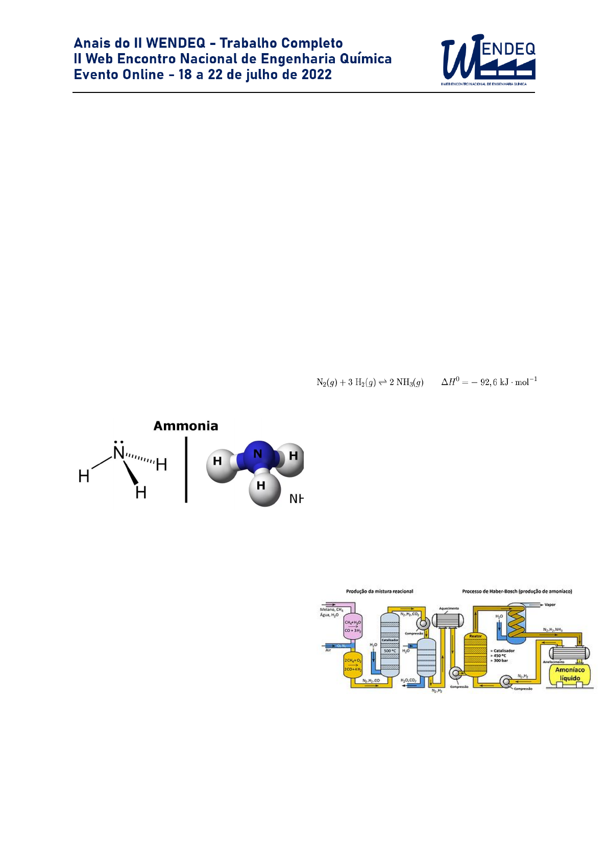 Conceitos atrelados a produção da amônia verde L. B. C. Embiruçu1 1SENAI CIMATEC, Salvador, Brasil (laura.embirucu@gmail.com) Denomina-se amônia verde a utilização do hidrogênio verde para produção de amônia. A geração pode ser descrita pela síntese de Haber-Bosch, onde os parâmetros que estão vinculados na reação são ajustados a fim de maximizar a reação do amoníaco. Essa tecnologia aponta como uma inovação tecnológica, pois durante a fabricação não há emissão de carbono e as taxas de emissão de poluentes são baixas, quando comparado a outros tipos de esquema produtivos. Palavras-chave: Biocombustíveis; Haber-Bosch; Hidrogênio; Amoníaco; Fertilizantes. INTRODUÇÃO A amônia ou amoníaco possui como propriedades químicas ser um gás incolor, tóxico, corrosivo (na presença de umidade), inflamável e possuir um odor característico. Sua fórmula estrutural é representada na figura 1, pode-se perceber que a substância é composta por: um átomo de nitrogênio e três átomos de hidrogênio. Figura 1: Fórmula estrutural da amônia O seu conhecimento e utilização é datado nas escritas de Plínio, este que era um naturalista romano, no seu livro Historie naturalis, no ano de 1782 nesse período foi cunhado de hammoniacum. No século XVIII Priestley, que dentre suas formações também era educador, conseguiu isolar o composto amoníaco e o denominou de gás alcalino. Em 1777 Scheele demonstrou que esse gás continha o hidrogênio e em 1778 Bergman nomeou de ammoniacum. Por fim, em 1785 Berthollet demonstrou a composição química da amônia e ela foi aceita pela comunidade científica. (SUTTON, 2008) Sua presença no meio ambiente ocorre de forma natural, combinada a outros organismos ou quando produzida artificialmente. Sua síntese mais reconhecida é a de Haber-Bosch, processo desenvolvido em escala laboratorial por Fritz Haber no ano de 1908 e em escala industrial em 1913 por Carl Bosch. Seu procedimento trata-se da obtenção de amoníaco por meio do diazoto e di-hidrogénio no estado gasoso. A reação é baseada também na ativação de átomos de hidrogênio e de nitrogênio na presença de um catalisador, o ósmio. A síntese do amoníaco é representada pela equação química: Para conseguir a maximização esperada o processo deve ser realizado com pressões elevadas e à temperatura mais baixa possível, cerca de 175 atm e 550°C. (F. AFTALION,2001). A amônia possui maior consumo no mercado de fertilizantes, visto que é o elemento chave do processo produtivo, seja pelos compostos de amônio (nitrato de amônio, sulfato de amônio, cloreto de amônio, sulfonitrato de amônio, fosfato de amônio), ou os nitratos, obtidos através do ácido nítrico, que é produzido a partir da amônia (nitrato de amônio, nitrato de cálcio, nitrato de sódio). A figura 2 representa uma planta industrial onde pode-se observar a aplicação da síntese de Haber-Bosch. (SHREVE, 1997). Figura 2: Processo Haber-Bosch Possui alta versatilidade, podendo ser utilizada na produção de plásticos, borrachas, explosivos, na indústria têxtil, na indústria bélica e substitui os CFCs (clorofluorcarbonetos) nos processos fabris. A primeira forma de utilização da amônia como combustível foi durante a segunda guerra mundial na Alemanha, o diesel do país havia sido confiscado pelo exército, e para a frota de ônibus conseguir circular eles modificaram a maquinaria dos ônibus, fazendo com que ela fosse utilizada largamente no território alemão. A produção da chamada "amônia suja” é responsável por cerca de 2% de todas as emissões de gases de efeito estufa. Atrelado a esse fator, a oxidação da amônia, contribui para a produção de gases do efeito estufa. Outro ponto negativo é a transformação de NH3 em NO2 (nitrito) que contribui para a lixiviação de nutrientes nos ecossistemas. Além disso, a presença exacerbada do amoníaco em ambientes aquáticos pode gerar a morte ou problemas no desenvolvimento de peixes. A amônia também pode o processo de eutrofização, este que é um aumento na quantidade de algas nos corpos hídricos e a redução da fotossíntese. Por ser consideravelmente mais leve que o ar (densidade relativa do ar, 0,5963) e possuir um caráter alcalino possibilita a reação com outros componentes alcalinos, a exemplo do dióxido de enxofre (SO2). Nesse exemplo citado eles reagem e formam aerossóis atmosféricos que possuem papel grave na redução da qualidade do ar, ela também possibilita a formação do MP2.5 que é componente que contribui para a formação da chuva ácida. MATERIAL E MÉTODOS O presente artigo caracteriza-se com base nos tipo de metodologia como sendo teórico de natureza básica, pois ele tem como finalidade a análise das variáveis referentes à produção de amônia atrelada a utilização do hidrogênio verde, esse processo recebe a nomenclatura de “amônia verde”. Também são analisados os fenômenos físicos atrelados a esse processo. A abordagem de construção foi qualitativa, visto que privilegia a análise de microprocessos. O trabalho caracteriza-se com uma revisão bibliográfica e para a sua sua construção teve como principais referências: (SUTTON, 2008); (F. AFTALION,2001) e (SHREVE, 1997). RESULTADOS E DISCUSSÃO Denomina-se amônia verde o sistema de fabricação de amônia que utiliza o hidrogênio verde. Sendo apontada como o "combustível do futuro” pela literatura, pois é produzida por meio de fontes e tecnologias limpas (solar, eólica, hidráulica, entre outras). Para utilizar o hidrogênio verde como fonte de energia são conhecidos quatro grande métodos, sendo eles: processos termoquímicos, eletrólise de água, processos rádio líticos e processos biológicos. Dentre os quais a eletrólise apresenta-se como a melhor alternativa com custo/benefícios significativos, esse sistema é uma fonte de energia limpa que só emite vapor de água e não deixa resíduos n