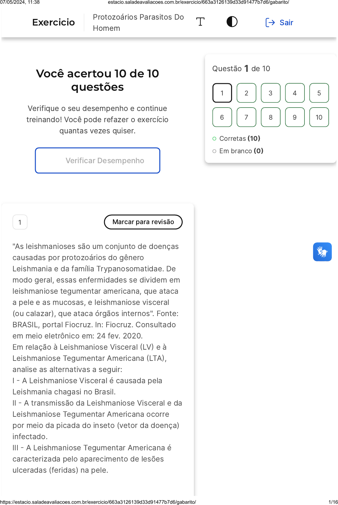 Você acertou 10 de 10 questões Verifique o seu desempenho e continue treinando! Você pode refazer o exercício quantas vezes quiser. Verificar Desempenho 1 Marcar para revisão "As leishmanioses são um conjunto de doenças causadas por protozoários do gênero Leishmania e da família Trypanosomatidae. De modo geral, essas enfermidades se dividem em leishmaniose tegumentar americana, que ataca a pele e as mucosas, e leishmaniose visceral (ou calazar), que ataca órgãos internos". Fonte: BRASIL, portal Fiocruz. In: Fiocruz. Consultado em meio eletrônico em: 24 fev. 2020. Em relação à Leishmaniose Visceral �LV� e à Leishmaniose Tegumentar Americana �LTA�, analise as alternativas a seguir: I � A Leishmaniose Visceral é causada pela Leishmania chagasi no Brasil. II � A transmissão da Leishmaniose Visceral e da Leishmaniose Tegumentar Americana ocorre por meio da picada do inseto (vetor da doença) infectado. III � A Leishmaniose Tegumentar Americana é caracterizada pelo aparecimento de lesões ulceradas (feridas) na pele. Questão 1 de 10 Corretas �10� Em branco �0� 1 2 3 4 5 6 7 8 9 10 Exercicio Protozoários Parasitos Do Homem Sair 07/05/2024, 11:38 estacio.saladeavaliacoes.com.br/exercicio/663a3126139d33d91477b7d6/gabarito/ https://estacio.saladeavaliacoes.com.br/exercicio/663a3126139d33d91477b7d6/gabarito/ 1/16 A B C D E IV � Na LV as amastigotas infectam os eritrócitos chegando aos outros órgãos por meio da corrente sanguínea. É correto o que se afirma em: I e III II e III I, II e III I, III e IV II, III e IV. Resposta correta Parabéns, você selecionou a alternativa correta. Confira o gabarito comentado! Gabarito Comentado As afirmações I, II e III estão corretas. A Leishmaniose Visceral é causada pela Leishmania chagasi no Brasil (afirmação I�. A transmissão da Leishmaniose Visceral e da Leishmaniose Tegumentar Americana ocorre por meio da picada do inseto (vetor da doença) infectado (afirmação II�. A Leishmaniose Tegumentar Americana é caracterizada pelo aparecimento de lesões ulceradas (feridas) na pele (afirmação III�. A afirmação IV está incorreta, pois na Leishmaniose Visceral, as amastigotas 07/05/2024, 11:38 estacio.saladeavaliacoes.com.br/exercicio/663a3126139d33d91477b7d6/gabarito/ https://estacio.saladeavaliacoes.com.br/exercicio/663a3126139d33d91477b7d6/gabarito/ 2/16 A B C infectam os macrófagos e não os eritrócitos. 2 Marcar para revisão A leishmaniose é uma doença transmitida por protozoários do gênero Leishmania. A Leishmaniose visceral, também conhecida como Calazar, geralmente se desenvolve dentro de meses após a picada do flebotomíneo. Diferentemente da Leishmaniose tegumentar, a leishmaniose visceral afeta órgãos, por causa disso se torna uma doença grave que necessita de tratamento o quanto antes. Entre as alternativas abaixo, marque aquela que diz respeito à leishmaniose visceral. Dentre os sintomas da doença, podemos destacar o aparecimento de feridas ulcerosas na pele e nas mucosas, que podem causar até mesmo deformidades. Essa doença é transmitida pela ingestão de água e alimentos contaminados por cistos desse protozoário. Febre, perda de peso, inchaço do fígado e baço que leva ao crescimento anormal do abdome, anemia e leucopenia assim como trombocitopenia. 07/05/2024, 11:38 estacio.saladeavaliacoes.com.br/exercicio/663a3126139d33d91477b7d6/gabarito/ https://estacio.saladeavaliacoes.com.br/exercicio/663a3126139d33d91477b7d6/gabarito/ 3/16 D E É uma doença exclusiva de animais domésticos, como cães e gatos, sendo o homem um hospedeiro acidental. É causada principalmente por um protozoário ciliado, intracelular obrigatório que apresenta como formas evolutivas as amastigotas e tripomastigotas. Resposta correta Parabéns, você selecionou a alternativa correta. Confira o gabarito comentado! Gabarito Comentado A alternativa correta é a letra C. A leishmaniose visceral, também conhecida como Calazar, é uma doença grave que afeta órgãos internos. Os sintomas incluem febre, perda de peso, inchaço do fígado e baço que leva ao crescimento anormal do abdome, anemia e leucopenia, assim como trombocitopenia. Esses sintomas são característicos da leishmaniose visceral e diferem da leishmaniose tegumentar, que afeta a pele e as mucosas. Portanto, a alternativa C é a que melhor descreve a leishmaniose visceral. 3 Marcar para revisão A disenteria amebiana é uma inflamação do intestino grosso manifestada por cólicas e fezes liquefeitas, geralmente com muco e sangue. É uma doença causada pela ameba, por isso, 07/05/2024, 11:38 estacio.saladeavaliacoes.com.br/exercicio/663a3126139d33d91477b7d6/gabarito/ https://estacio.saladeavaliacoes.com.br/exercicio/663a3126139d33d91477b7d6/gabarito/ 4/16 A B C D E esse tipo de disenteria é conhecido também por amebíase. Das alternativas descritas a seguir, assinale a que caracteriza o modo de transmissão da amebíase. Ingestão de cistos do parasita presentes nas fezes de gato. Ingestão de alimentos ou água contaminada por fezes que contenham oocistos do triatomíneo. Infecção através das fezes de barbeiro contendo cistos que entram em contato com mucosas ou pequenos cortes. Ingestão de alimentos que foram contaminados com as fezes ou com o vetor triturado junto. Ingestão de alimentos e água contaminados com cistos da Entamoeba histolytica. Resposta correta Parabéns, você selecionou a alternativa correta. Confira o gabarito comentado! Gabarito Comentado A amebíase é transmitida principalmente através da ingestão de alimentos e água contaminados com cistos da Entamoeba histolytica. Esses cistos são formas resistentes do parasita que podem sobreviver fora do corpo humano e são 07/05/2024, 11:38 estacio.saladeavaliacoes.com.br/exercicio/663a3126139d33d91477b7d6/gabarito/ https://estacio.saladeavaliacoes.com.br/exercicio/663a3126139d33d91477b7d6/gabarito/ 5/16 A B C capazes de infectar um novo hospedeiro quando