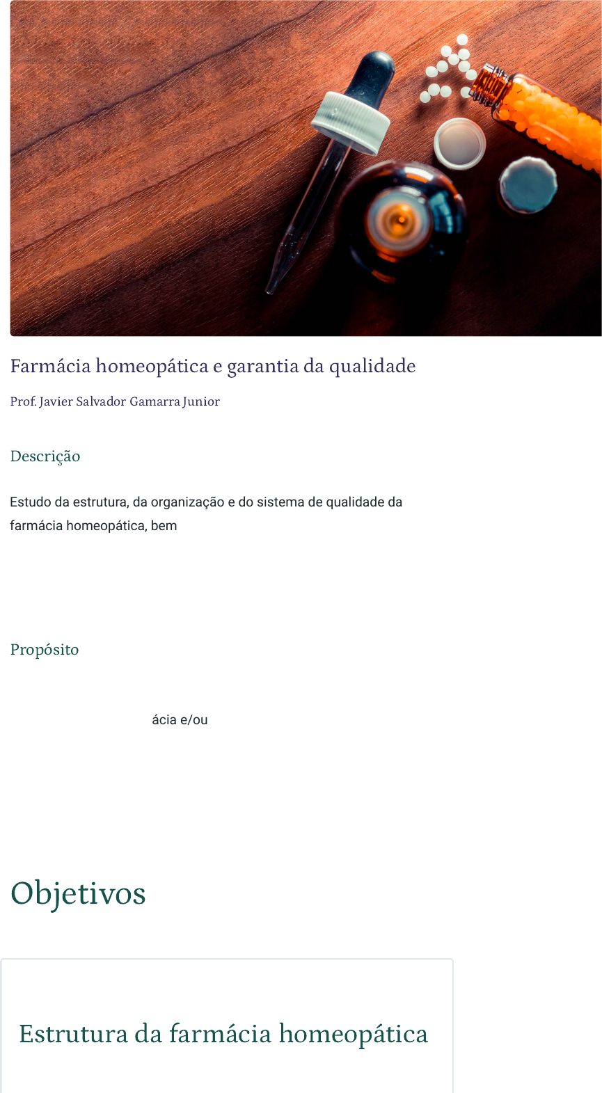 14/04/24, 22:43 Farmácia homeopática e garantia da qualidade https://stecine.azureedge.net/repositorio/00212sa/03582/index.html?brand=estacio# 1/63 Farmácia homeopática e garantia da qualidade Prof. Javier Salvador Gamarra Junior Descrição Estudo da estrutura, da organização e do sistema de qualidade da farmácia homeopática, bem como das boas práticas de manipulação e fabricação de medicamentos homeopáticos, das farmacopeias homeopáticas e do controle de qualidade de insumos em farmácia homeopática. Propósito Conhecer como se planeja, organiza, estrutura, opera e se assegura a qualidade em uma farmácia e/ou laboratório de produção de medicamentos homeopáticos é indispensável para que o farmacêutico habilitado em homeopatia possa exercer com correção e eficiência sua responsabilidade técnica e possa ofertar à população medicamentos homeopáticos de qualidade e segurança. Objetivos Módulo 1 Estrutura da farmácia homeopática 14/04/24, 22:43 Farmácia homeopática e garantia da qualidade https://stecine.azureedge.net/repositorio/00212sa/03582/index.html?brand=estacio# 2/63 Identificar a estrutura básica de uma farmácia homeopática. Módulo 2 Organização da farmácia homeopática Reconhecer os elementos que compõem a organização técnico- burocrática de uma farmácia homeopática. Módulo 3 Sistema de qualidade em farmácia homeopática Reconhecer como se organizam o sistema de qualidade em farmácia homeopática e as rotinas de boas práticas na produção de medicamentos homeopáticos. Módulo 4 Controle de qualidade em farmácia homeopática Listar procedimentos de controle de qualidade da farmácia homeopática. Introdução 14/04/24, 22:43 Farmácia homeopática e garantia da qualidade https://stecine.azureedge.net/repositorio/00212sa/03582/index.html?brand=estacio# 3/63 Neste material, vamos caracterizar as regras definidas pelo Conselho Federal de Farmácia (CFF) que permitem ao farmacêutico a assunção de responsabilidade técnica, conceituar a farmácia homeopática e abordar alguns elementos da indústria farmacêutica homeopática. Falaremos sobre a estrutura e a organização da farmácia homeopática, do ponto de vista de estabelecimento de saúde apto à prestação de serviços de saúde e de produção e oferta de produtos de interesse à saúde, sobretudo medicamentos homeopáticos entre outros itens relacionados. Sendo o farmacêutico habilitado em homeopatia, um profissional de saúde apto a promover a saúde por meio da homeopatia, é preciso entender de modo mais aprofundado como é a farmácia homeopática. No contexto do funcionamento do estabelecimento de saúde homeopático, a farmácia é organizada e sustenta as bases do sistema da qualidade em farmácia homeopática. Assim, é necessário compreender como atua e se organiza esse sistema, que é a garantia de que os medicamentos homeopáticos e os serviços sejam oferecidos ao usuário com qualidade. Desse modo, a segurança é garantida, bem como a eficácia da intervenção terapêutica homeopática e o uso dos medicamentos homeopáticos. Ainda nesse cenário, será apresentada a farmacopeia homeopática e outros compêndios homeopáticos relevantes, úteis e necessários para que o farmacêutico homeopata desenvolva seu trabalho com qualidade e segurança técnica, embasado na ciência homeopática e nas ciências farmacêuticas e da saúde. 14/04/24, 22:43 Farmácia homeopática e garantia da qualidade https://stecine.azureedge.net/repositorio/00212sa/03582/index.html?brand=estacio# 4/63 1 - Estrutura da farmácia homeopática Ao �nal deste módulo, você será capaz de identi�car a estrutura básica de uma farmácia homeopática. Farmácia e responsabilidade técnica em homeopatia Responsabilidade técnica A assunção de responsabilidade técnica (RT) em farmácia homeopática ou em laboratório industrial homeopático é atribuição privativa do farmacêutico registrado no sistema CFF/CRF (Conselho Federal de Farmácia e conselhos regionais de Farmácia nos estados), sendo, portanto, vedada a participação e o registro de outro profissional. Cabe ao CFF delimitar as regras em que a RT e o âmbito profissional irão se estabelecer no que tange à atuação do farmacêutico na homeopatia. Você lembra quais os requisitos para um profissional graduado em Farmácia ser habilitado a atuar como farmacêutico homeopático? Segundo a Resolução CFF nº 576/2013, para o farmacêutico ser responsável técnico de uma farmácia homeopática ou laboratório industrial homeopático, ele deve comprovar uma das seguintes qualificações: Graduação 14/04/24, 22:43 Farmácia homeopática e garantia da qualidade https://stecine.azureedge.net/repositorio/00212sa/03582/index.html?brand=estacio# 5/63 Ter cursado a disciplina de homeopatia com conteúdo mínimo de 60 (sessenta) horas no curso de graduação, além de estágio obrigatório com o mínimo de 120 (cento e vinte) horas nas farmácias de instituições de ensino superior ou conveniadas, em laboratórios de medicamentos e/ou de insumos homeopáticos. Possuir título de especialista ou curso de aprimoramento profissional (cursos livres) em homeopatia que atenda às resoluções vigentes do Conselho Federal de Farmácia. São exemplos de critérios estabelecidos por essas resoluções: cursos de pós-graduação ofertados somente por instituições universitárias cadastradas no Ministério da Educação (MEC) ou cursos livres devidamente reconhecidos pelo CFF que tenham carga horária mínima de 360 horas; os farmacêuticos que comprovarem o exercício da responsabilidade técnica em estabelecimentos farmacêuticos que preparem medicamentos homeopáticos, obtida até a data da publicação da Resolução nº 319 em 30/10/97, poderão ter o exercício, que será obtido pelos registros perante o conselho regional de Farmácia respectivo. Em farmácias que atendam manipulação homeopática e alopática, o farmacêut