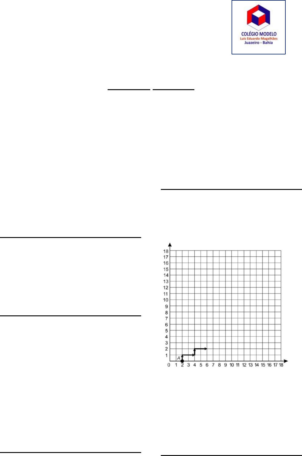 Colégio Modelo Luís Eduardo Magalhães – Juazeiro/BA Disciplina: Matemática Professor: Rinaldo Miranda Série/Turma: 3ª A / B / C / D / E / F (Matutino) Unidade: I 2º Objeto do Conhecimento: Plano Cartesiano Exercícios Propostos ① Sobre o plano cartesiano, julgue as afirmativas a seguir: I - O eixo horizontal é conhecido também como eixo das abscissas. II - O ponto A (-5, 3) é um ponto do terceiro quadrante. III - O eixo vertical é conhecido também como eixo das coordenadas. Podemos afirmar que: (A) Somente a afirmativa I é verdadeira. (B) Somente a afirmativa II é verdadeira. (C) Somente a afirmativa III é verdadeira. (D) Somente as afirmativas II e III são verdadeiras. (E) Somente as afirmativas I e III são verdadeiras. ② Em um plano cartesiano, foram marcados os pontos A (2, 3), B(-1, 2), C (2, -3) e D (1, 0). O único quadrante em que não há nenhum ponto marcado é: (A) I (B) II (C) III (D) IV ③ O plano cartesiano é um sistema de coordenadas desenvolvido por René Descartes. Esse sistema de coordenadas é formado por duas retas perpendiculares, chamadas de eixos cartesianos. O plano cartesiano é dividido em quadrantes. Sobre os quadrantes do plano cartesiano, considerando um ponto A (x, y), em que x > 0 e y < 0, temos um ponto que pertence ao: (A) primeiro quadrante (B) segundo quadrante (C) terceiro quadrante (D) quarto quadrante (E) eixo das abscissas ④ (USP) Uma das diagonais de um quadrado tem extremidades A (1; 1) e C (3; 3). As coordenadas dos outros dois vértices são: (A) (2; 3) e (3; 2) (B) (3; 1) e (1; 3) (C) (3; 0) e (1; 4) (D) (5; 2) e (4; 1) (E) nenhuma das anteriores ⑤ (Enem Digital 2020) O gráfico mostra o início da trajetória de um robô que parte do ponto A (2; 0), movimentando-se para cima ou para a direita, com velocidade de uma unidade de comprimento por segundo, no plano cartesiano. O gráfico exemplifica uma trajetória desse robô, durante 6 segundos. Supondo que esse robô continue essa mesma trajetória, qual será sua coordenada, após 18 segundos de caminhada, contando o tempo a partir do ponto A? (A) (0; 18) (B) (18; 2) (C) (18; 0) (D) (14; 6) (E) (6; 14) ⑥ Observe o ponto N no plano cartesiano desenhado abaixo. Qual é o par ordenado correspondente à localização do ponto N? (A) (4, – 3) (B) (3, – 4) (C) (– 3, 4) (D) (– 3, – 4) (E) (– 4, – 3) ⑦ Representando os pontos A(2, 2), B(2, −2), C(−2, −2) e D(−2, 2) no plano cartesiano, obtemos uma figura plana geométrica. Qual é a área dessa figura em 𝑐𝑚2? (A) 4 (B) 6 (C) 9 (D) 12 (E) 16 ⑧ O professor de Matemática de Pedrinho pediu que ele marcasse em um plano cartesiano os pontos A(4, 2), B(-1, 3), C(2, -2) e D(3, 0). Se Pedrinho marcar corretamente todos os pontos, o único quadrante em que não haverá nenhum ponto marcado é: (A) I. (B) II. (C) III. (D) IV. ⑨ Observe os pontos representados no plano cartesiano abaixo. O par ordenado (2, – 1) está representado nesse plano cartesiano pelo ponto (A) Q. (B) R. (C) S. (D) T. ⑩ Se o ponto P(𝟐𝒂 + 𝟏𝟎, 𝟏 − 𝒂) é ponto pertencente à bissetriz do 1º quadrante, então determine as coordenadas do ponto P. ⑪ Se o ponto B(𝟓𝒂 − 𝟏𝟖, −𝟐𝒂 + 𝟑) é ponto pertencente à bissetriz do 3º quadrante, então determine as coordenadas do ponto B. ⑫ Se que o ponto Q(𝟐𝒂𝟐 + 𝟑𝒂, 𝟓𝒂 + 𝟒) pertence à bissetriz dos quadrantes ímpares, então determine as coordenadas do ponto Q localizado no 3º quadrante? ⑬ Se o ponto A(𝟒𝒂 + 𝟑, 𝟑 − 𝒂) pertence à bissetriz dos quadrantes pares, então em qual quadrante está localizado o ponto A? ⑭ Representando os pontos A(1, −2), B(3, 3) e C(0, 3) no plano cartesiano, obtemos uma figura plana geométrica. Qual é a área dessa figura em 𝑐𝑚2? ⑮ Represente os seguintes pontos no plano cartesiano: A(2, 3); B(3, −3); C(0, 2); D(−3, 0); E(−1, 4); F(4, −1); G(1, 1); H(2, 1); I(−3, −4) e J(−2, 2). Observação: Use uma régua para resolver o exercício. Bons Estudos! Profº Rinaldo 2024