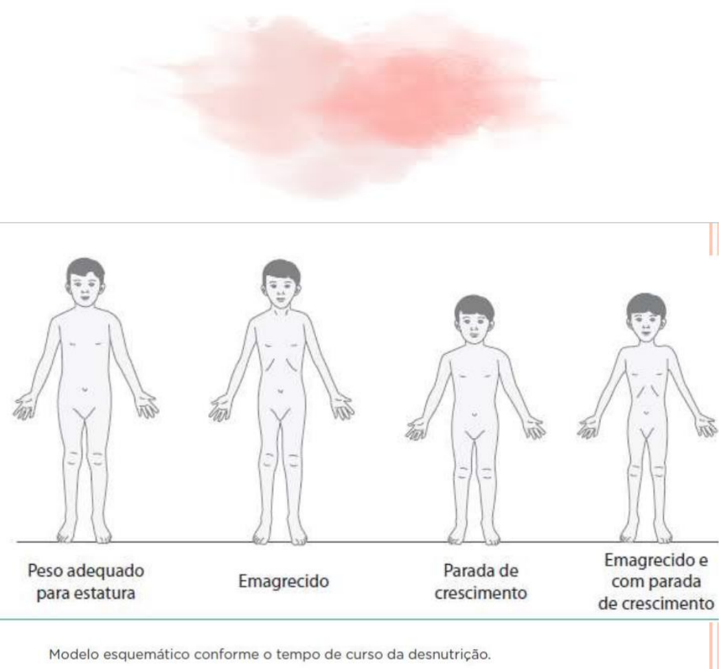 Letícia Lima Clínica Integrada I Desnutrição infantil Desnutrição energético-proteica ‘’Uma gama de condições clínicas patológicas com deficiência simultânea de proteínas e calorias, em variadas proporções, que acomete preferencialmente crianças de pouca idade e comumente associada com infecções’’. (OMS) · Problema universal de saúde pública, principalmente em países em desenvolvimento · Aproximadamente 20 milhões de crianças < 5 anos de idade são subnutridas tornando-as vulneráveis a doenças e mortes prematuras · Desnutrição pediátrica é responsável por aproximadamente 45% de todas as mortes infantis no mundo Como avaliar? É imprescindível ao pediatra conhecer métodos e técnicas de avaliação da situação nutricional: · Antropometria · Peso: lactentes devem ser medidos em balanças com graduação de 10g; maiores de 2 anos podem ser pesados em balanças com graduação de 100g · Altura: uso da régua antropométrica · A criança quando começa a sofrer as consequências da privação energético-proteica, perde inicialmente peso, e posteriormente, ocorre diminuição na velocidade do seu crescimento · MS uniformizou o uso de tabelas de referência de crescimento, de peso e IMC, adotando o padrão da OMS de acordo com peso e idade · Exame clínico · Sinal da bandeira – faixas escuras e claras nos cabelos · Alopecia – queda do cabelo · Queilite angular – pequenas fissuras em um ou ambos os cantos da boca · Dermatoses – doenças de pele · Fácies senil · Inquéritos alimentares · Método utilizado para conhecer o hábito alimentar do indivíduo, assim como suas condições socioeconômicas e culturais · Recordatório de 24h · Registro alimentar · Frequência alimentar · Exame bioquímicos Etiologia · Deficiência nutricional, que pode ser tanto de macro quanto de micronutrientes ou ambos · Pode ser primária, onde não há doença relacionada (insegurança alimentar) ou secundaria, quando há uma doença de base que provoque o quadro (síndrome disabsortiva) · Primária · Secundaria · Determinada por patologias que acometem os processos relacionados a ingestão, digestão, absorção, metabolização e excreção do alimento · Estenose hipertrófica do piloro, doença celíaca, diarreia crônica, DM1, insuficiência renal, AIDS etc Fisiopatologia x quadro clínico · Delicado equilíbrio homeostático, limítrofe ao colapso endócrino-metabólico · Mudanças intensas em múltiplos sistemas: endócrino, imune, nervoso central, gastrointestinal, cardiovascular e renal · Alterações secundárias nos eixos da insulina · Alterações na via tireoidiana · Alterações nas bombas iônicas de membrana celular · Alterações morfofuncionais do SNC · Alterações gastrointestinais Classificação · Intensidade (define a gravidade da desnutrição) · Leve · Moderada · Grave (Marasmo, Kwashiorkor, Kwashiorkor marasmático) · Duração (indica o tempo de curso, identificando indivíduos emagrecidos (wasted) e/ou com parada de crescimento (stunded) · Aguda · Crônica · Crônica ‘’agudizada’’ Avaliação nutricional Classificação de Gomez (1965) · Utilizada como índice de gravidade da desnutrição em qualquer situação · Baseia-se no índice peso ideal para idade e sexo (considerando o P50 nas curvas de crescimento) · Recomenda-se principalmente para crianças < 2 anos · Peso maior velocidade de aumento em função da idade que o comprimento · Agravos nutricionais peso altera primeiro que estatura · Na presença de edema comprovadamente nutricional, independente do peso/idade, a criança será considerada desnutrida de 3º grau (modificação de Bengoa) · Desvantagens: · Não permite a distinção entre aguda e crônica · Não permite diferenciar as crianças cujas deficiências de peso são devidas a problemas de crescimento e não nutricionais (ex.: síndromes genéticas) Classificação de Waterlow (1976) · Baseia-se nos índices estatura/idade (E/I) e peso/estatura (P/E) · Utilizada para crianças de 2 a 10 anos – nessa fase o crescimento é mais lento e constante predominando o estatural · O peso varia mais em função da estatura que da idade · Os agravos nutricionais serão melhor avaliados pela E/I ou P/E Classificação de Maclaren (1967) · Classifica a desnutrição em tipos clínicos utilizando pontuação para achados clínicos e concentração da albumina sérica Classificação da Organização das Nações Unidas (OMS) · Empregada para crianças de qualquer faixa etária · Tem como finalidade identificar as formas moderadas e graves de desnutrição · A comparação é realizada por escore ‘’Z’’ · ESCORE Z = (valor observado para o indivíduo) – (valor da média referencial) Desvio padrão do referencial · Escore Z > 0 significa que o valor da medida do indivíduo é maior do que a média da população de referência · Escore Z < 0 corresponde a um valor menor que a média · A presença de edema comprovadamente nutricional, classifica a desnutrição como grave · No primeiro trimestre de vida é recomendável considerar, para avaliação do estado nutricional, o ganho de peso médio de aproximadamente 20-30g/dia. Caso haja um ganho menor ou igual a 20g/dia, considerar a situação como risco nutricional Diagnóstico · Anamnese: antecedentes neonatais; nutricionais; aspectos psicossociais · Presença ou não de doenças associadas · Exame físico: alterações dos cabelos; dermatoses; hipotrofia muscular; redução do tecido celular subcutâneo · Aferição de medidas antropométricas: · CB < 11,5cm · Escore Z de peso para estatura (ZPE) abaixo de -3 e/ou · Emagrecimento intenso visível · Exames laboratoriais · Considerar: fome por escassez de recursos econômicos; riqueza de recursos naturais; insegurança alimentar; fome oculta Tratamento · Fases do tratamento: · 1ª Fase – estabilização – 1º ao 7º dia: corrigir os distúrbios h