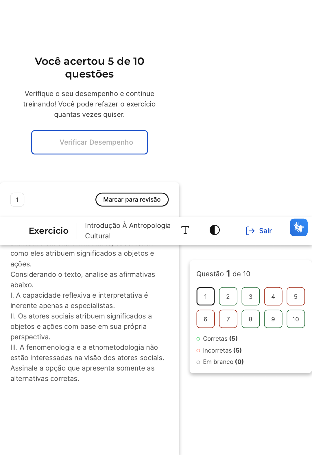 Você acertou 5 de 10 questões Verifique o seu desempenho e continue treinando! Você pode refazer o exercício quantas vezes quiser. Verificar Desempenho 1 Marcar para revisão João, estudante de sociologia, explora a capacidade reflexiva e interpretativa dos indivíduos em sua comunidade, observando como eles atribuem significados a objetos e ações. Considerando o texto, analise as afirmativas abaixo. I. A capacidade reflexiva e interpretativa é inerente apenas a especialistas. II. Os atores sociais atribuem significados a objetos e ações com base em sua própria perspectiva. III. A fenomenologia e a etnometodologia não estão interessadas na visão dos atores sociais. Assinale a opção que apresenta somente as alternativas corretas. Questão 1 de 10 Corretas �5� Incorretas �5� Em branco �0� 1 2 3 4 5 6 7 8 9 10 Exercicio Introdução À Antropologia Cultural Sair A B C D E Apenas a afirmativa II está correta Apenas a afirmativa I está correta Apenas as afirmativas I e III estão corretas Apenas as afirmativas II e III estão corretas Apenas a afirmativa III está correta Resposta incorreta Opa! A alternativa correta é a letra A. Confira o gabarito comentado! Gabarito Comentado O texto destaca que todos os atores sociais possuem capacidade reflexiva e interpretativa, não sendo exclusividade de especialistas. A fenomenologia e a etnometodologia estão particularmente interessadas em ver o mundo através dos olhos dos atores sociais. 2 Marcar para revisão A comunidade X, localizada em uma região remota do Brasil, tem uma prática cultural única de celebração da passagem da infância para a vida adulta, que envolve rituais, danças e provações. A B C D E Considerando o texto, analise as afirmativas abaixo. I. A Antropologia Cultural foca no estudo das práticas e crenças culturais de comunidades. II. A celebração da passagem da infância para a vida adulta não é um tópico relevante para a Antropologia Cultural. III. A Antropologia Cultural pode proporcionar insights sobre a importância de rituais em diferentes culturas. Assinale a opção que apresenta somente as alternativas corretas. Apenas a afirmativa II está correta Apenas as afirmativas I e III estão corretas Apenas as afirmativas I e II estão corretas Apenas a afirmativa I está correta As afirmativas I, II e III estão corretas Resposta correta Parabéns, você selecionou a alternativa correta. Confira o gabarito comentado! Gabarito Comentado A Antropologia Cultural é uma disciplina que estuda práticas, crenças e rituais culturais de diversas comunidades, tornando as afirmativas I e III corretas. A afirmativa II é incorreta porque a A B C D E celebração da passagem da infância para a vida adulta, assim como outros rituais de passagem, são tópicos de grande interesse para a Antropologia Cultural devido ao seu impacto significativo nas estruturas e práticas sociais das comunidades. 3 Marcar para revisão Quando tratamos de antropologia brasileira, passamos a notar que somos profundamente influenciados pela: Cultura do corpo Cultura do trabalhismo Cultura do enriquecimento pelo trabalho Cultura do nacionalismo belicista Cultura etnocêntrica Resposta correta Parabéns, você selecionou a alternativa correta. Confira o gabarito comentado! Gabarito Comentado A alternativa correta é a "Cultura do corpo". No contexto da antropologia brasileira, a A B C cultura do corpo é um aspecto significativo. Isso se deve ao fato de que, em nossa sociedade, há uma grande ênfase na aparência física e na manutenção de um corpo saudável e atraente. Essa cultura é refletida em várias áreas, como esportes, moda, publicidade e até mesmo em nossas interações sociais diárias. Portanto, é correto afirmar que somos profundamente influenciados por essa cultura. 4 Marcar para revisão Em uma metrópole, Pedro observa o aumento da comercialização do corpo humano, desde a venda de artes feitas a mão até a oferta de serviços corporais em diversos setores. Considerando o texto, analise as afirmativas abaixo: I. A urbanização transforma a maneira como o corpo humano é percebido na sociedade. II. A venda de artes feitas à mão é uma forma de comercialização do corpo humano. III. A comercialização do corpo humano está restrita apenas à venda de produtos físicos. Assinale a opção que apresenta somente as alternativas corretas. Apenas a afirmativa I está correta Apenas a afirmativa II está correta Apenas as afirmativas I e II estão corretas D E As afirmativas I, II e III estão corretas Apenas a afirmativa III está correta Resposta incorreta Opa! A alternativa correta é a letra C. Confira o gabarito comentado! Gabarito Comentado A urbanização, como discutido no texto- base, realmente altera a percepção do corpo humano, tornando-o um objeto comercializável em várias formas, incluindo a venda de artesanato. No entanto, a comercialização do corpo humano não se limita apenas à venda de produtos físicos, pois também abrange serviços e outras formas de interação 5 Marcar para revisão Lucas, ao analisar a cultura brasileira contemporânea, nota uma forte relação entre a percepção do corpo e a convivência conjugal em ambientes urbanos. Considerando o texto, analise as afirmativas abaixo. I. A cultura brasileira contemporânea não tem influências de percepções urbanas sobre o corpo. II. A convivência conjugal pode ser influenciada por percepções urbanas do corpo. III. A Antropologia não se preocupa com aspectos da cultura brasileira contemporânea. A B C D E Assinale a opção que apresenta somente as alternativas corretas Apenas a afirmativa II está correta Apenas a afirmativa I está correta Apenas as afirmativas I e III estão corretas Apenas as afirmativas II e III estão corretas Apenas a afirmativa III está correta Resposta incorreta Opa! A alternativa correta é a letra A. Confira o gabarito comentado! Gabarito Comentado O texto menciona que a Antropo