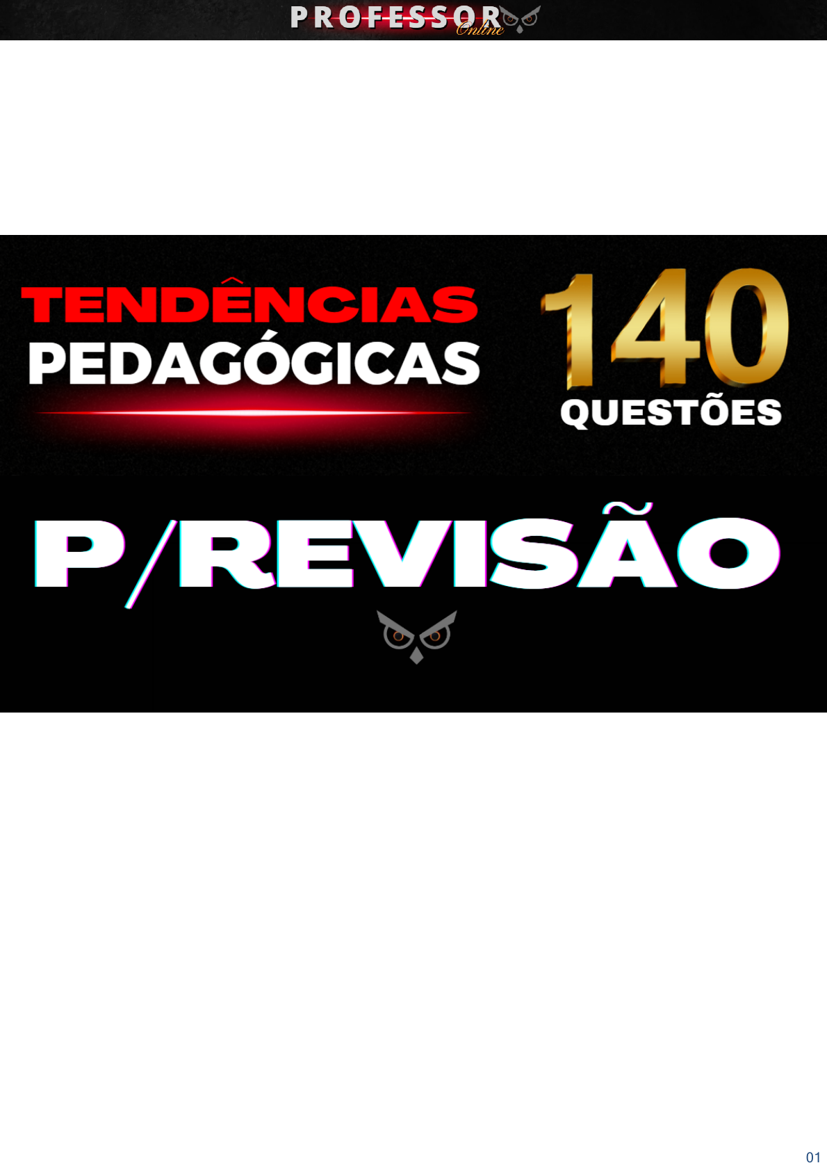 140 QUESTÕES DE TENDÊNCIAS PEDAGÓGICAS 1-50 ···························································2 140 QUESTÕES DE TENDÊNCIAS PEDAGÓGICAS 51-100 ·····················································20 140 QUESTÕES DE TENDÊNCIAS PEDAGÓGICAS 101-140 37··················································· ÍNDICE 01 Tendências Pedagógicas Questão 1: IMPARH A educação ética é aquela que nos leva a refletir sobre o próprio ser humano, possibilitando a formação de indivíduos que devem se construir nas relações com o outro. Assim, cabe ao educador observar as suas próprias posturas para se fortalecer como sujeito ético, no contexto da escola ora defendida. Um dos principais comportamentos desse educador é: a) adotar como método a exposição oral de seus conhecimentos, com a certeza de conseguir moldar seus alunos aos padrões exigidos pela sociedade. b) compreender-se como o único detentor do conhecimento frente aos seus alunos, por ter formação acadêmica superior. c) defender o distanciamento entre sua posição e a do educando como necessário na reprodução dos valores sociais vigentes. d) priorizar a educação dialógica entre os membros dos grupos como uma via de construção do conhecimento. Questão 2: IMPARH O desenvolvimento da autonomia no processo de ensino e aprendizagem é essencial para que os alunos se tornem protagonistas do seu projeto de vida e possam, assim, atender as demandas do mundo atual. Em relação à construção da autonomia do aluno, assinale com V ou F as afirmações que se seguem, conforme sejam verdadeiras ou falsas, respectivamente. ( ) A autonomia é fundamental para uma formação integral do aluno, possibilitando sua participação na sociedade de forma colaborativa. ( ) A autonomia trata do envolvimento do estudante em atividades que se limitam ao contexto escolar e de sala de aula. ( ) Quando se trata do tema da autonomia dos alunos, é preciso considerar também a questão da participação discente nas tomadas de decisão da escola de um modo geral. ( ) O professor, para desenvolver a autonomia do aluno, não precisa atentar para seu tempo nem seu ritmo de aprendizado. ( ) O desenvolvimento da autonomia, desde cedo, para os alunos, ajuda inclusive no desempenho cognitivo deles. 02 A opção que contém a sequência correta, de cima para baixo, é: a) V, V, V, V, F. b) V, F, F, V, V. c) V, F, V, F, V. d) F, V, V, F, F. Questão 3: Paulo Freire nos fala sobre a responsabilidade ética de professores e professoras no exercício da docência e acrescenta que, além da formação científica, são necessários outros pressupostos para a prática educativa, tais como: a correção ética, o respeito aos outros, a coerência, a capacidade de viver e de aprender com o diferente, dentre outros. Diz que, tão importante quanto o ensino dos conteúdos, é a postura ética do professor que deve ser coerente com o que pensa, faz, diz e escreve. O autor nos ensina, ainda, que o educador ético deve assumir suas posições com clareza, sem negar ou esconder sua postura diante dos alunos, sabendo e assumindo que ela pode ser até rejeitada. O educador deve, também, reconhecer que sua prática: a) deverá ser apolítica, de modo a não inspirar tendências ideológicas. b) nunca pode ser neutra, simplesmente porque a neutralidade não existe. c) será sempre de transformador de padrões estabelecidos. d) é balizada por instrumentos institucionais de organização pública. e) não depende de influências externas porque tem autonomia irrestrita. Questão 4: VUNESP Segundo Fontana (1996), “no ideário pedagógico que permeia as práticas dominantes nas salas de aula, o processo de elaboração conceitual na escola é analisado de duas maneiras distintas e contrapostas ... que denomina de relação pedagógica tradicional e relação pedagógica não tradicional”. Assinale a alternativa correta sobre a relação pedagógica não tradicional. a) Os conceitos científicos são assumidos como verdadeiros pelo professor e aluno, sendo que no seu processo de assimilação a criança é entendida como sujeito ativo. b) As palavras e os conceitos são entendidos como neutros e a-históricos e difundem modelos válidos para a ação, sendo que os conceitos devem ser repetidos até a sua compreensão. c) O aluno, sujeito ativo no processo de elaboração do conhecimento científico, não demanda planejamento do professor e sistematização dos conteúdos para que não lhe seja tolhida a capacidade de pensar. d) O processo de conceituação científica é transmitido pelo professor, na qualidade de autoridade hierárquica, ao aluno, sem explicar suas transformações, incompletude e caráter provisório. e) O aluno tem limitações ao se relacionar com os objetos do conhecimento, pois não é capaz de reconhecer e problematizar a relevância dos modos históricos de pensar e sua aplicabilidade no cotidiano. Questão 5: Unifil - Prof (SA Sudoeste)/Pref SA Sudoeste/2020 Com relação aos pressupostos históricos das tendências pedagógicas no Brasil, distinguiram-se a Pedagogia Progressista e a Pedagogia Liberal de educação. Assinale a alternativa que apresenta apenas 03 https://sun.eduzz.com/1614565 tendências pedagógicas que se inserem na perspectiva da Pedagogia Progressista. a) Libertadora, Libertária e Crítico-social dos conteúdos. b) Liberal tradicional, Liberal não-diretiva e Libertária. c) Tecnicista, Liberal tradicional e Liberal não-diretiva. d) Sociointeracionismo, Construtivismo e Pedagogia Histórico Crítica. Questão 6: ITAME Foi educador e filósofo brasileiro. Também é considerado um dos pensadores mais notáveis na história da pedagogia mundial, influenciou o movimento “pedagogia crítica”. E é Patrono da Educação Brasileira. Nos dias atuais r
