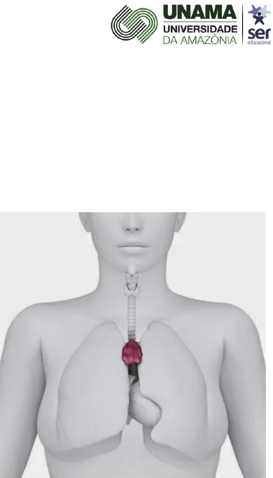 O timo é uma glândula que participa da regulação da defesa imunológica do organismo. É considerado um órgão linfoide primário. Localização do timo O timo localiza-se no tórax, entre os pulmões e a frente do coração. Ele muda de tamanho conforme as fases da vida. Do nascimento até a adolescência, o timo atinge até 40 gramas. A partir daí, começa a diminuir de tamanho até a fase idosa. Porém, mesmo com a sua diminuição, as funções não são perdidas. Função A principal função do timo é a maturação dos linfócitos T. Os linfócitos imaturos são produzidos na médula óssea e migram até o timo, onde amadurecem e transformam-se em linfócitos T. Do timo, eles entram na corrente sanguínea e chegam aos tecidos linfoides. UNIVERSIDADE DA AMAZÔNIA Timo https://www.todamateria.com.br/linfocitos/ https://www.todamateria.com.br/medula-ossea/ https://www.todamateria.com.br/login/?f=3599 O timo só libera os linfócitos T após reconhecer que estes não irão reagir contra proteínas ou antígenos naturais do organismo. Assim, ele realiza uma seleção dos linfócitos T a serem liberados na corrente sanguínea. Essa função do timo garante o correto funcionamento do sistema imunológico. Quando existem poucos linfócitos T no organismo aumentam as chances de se adquirir doenças. O timo também é responsável pela produção do hormônio timosina, que estimula a maturação dos linfócitos T. Anatomia e Histologia Partes do timo O timo é dividido em dois lobos unis e numerosos lóbulos de formas e tamanhos diferentes. Os dois lobos costumam variar em tamanho e forma. É comum o lobo direito ser menor do que o lobo esquerdo. O timo é revestido por uma cápsula de tecido conjuntivo. Cada lóbulo do timo possui duas partes: Córtex: Região periférica e com grande número de linfócitos. É a área de intensa produção dos linfócitos; Medula: Região central com poucos linfócitos maduros. As células que compõem o timo são em grande parte linfócitos, mas existem também células reticulares e macrófagos. Os linfócitos que não são selecionados pelo timo morrem e são destruídos pelos macrófagos. https://www.todamateria.com.br/antigenos/ https://www.todamateria.com.br/sistema-imunologico/ https://www.todamateria.com.br/sistema-imunologico/ https://www.todamateria.com.br/tecido-conjuntivo/ https://www.todamateria.com.br/macrofagos/ https://www.todamateria.com.br/ https://www.todamateria.com.br/login/ Histologicamente, é possível observar os corpúsculos de Hassall, que são aglomerados de células epiteliais organizadas em torno de um ponto central. Curiosidades O termo timo deriva do grego Thymus e signi�ca energia vital. Antigamente, acreditava-se que a alma da pessoa era guardada dentro do timo. O timo foi o último dos órgãos importantes para o corpo a ter suas funções desvendadas.