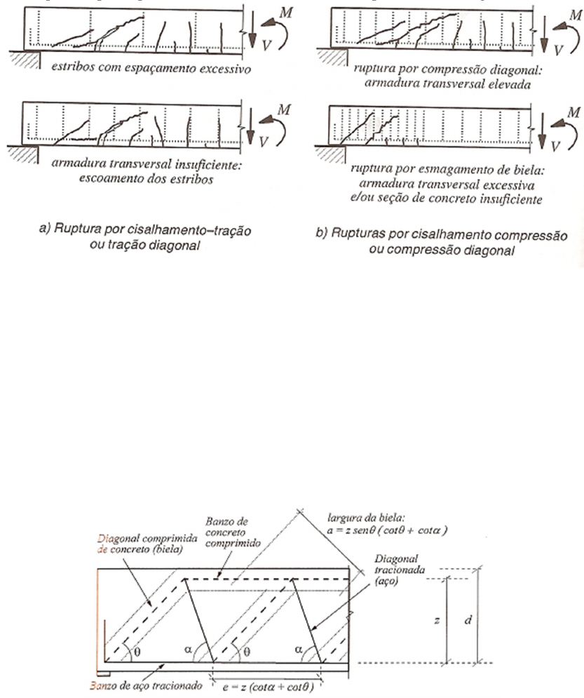 Notas de Aula – Estruturas de Concreto I 60 Dimensionamento da armadura transversal de combate ao cisalhamento na flexão, para absolver as tensões de tração, que cortam o plano neutro da peça a um ângulo de aproximadamente 45°. A armadura transversal pode ser constituída por estribos, a 90° ou inclinados, sendo o primeiro caso mais comum na prática. A ruptura pela ação combinada da força cortante e do momento fletor ocorre com o esgotamento da resistência do concreto das diagonais comprimidas ou pelo escoamento dão aço da armadura transversal. As rupturas típicas que acontecem no cisalhamento são apresentadas na figura 9.4: Figura 9.4: Rupturas típicas por cisalhamento. 9.2.1 Modelo da treliça de Mörsch. Modelo desenvolvido pelos alemães Ritter e Mörsch para explicar a resistência de uma viga de concreto armado, após a fissuração, no qual a viga tem um funcionamento análogo a uma treliça. Neste modelo, descrito na figura 9.5, o banzo superior constituído pelo concreto comprimido na flexão, o banzo inferior pela armadura longitudinal de tração, as diagonais tracionadas pela armadura transversal e as diagonais comprimidas por bielas de concreto inclinadas. Figura 9.5: Modelo de treliça de Morsch.