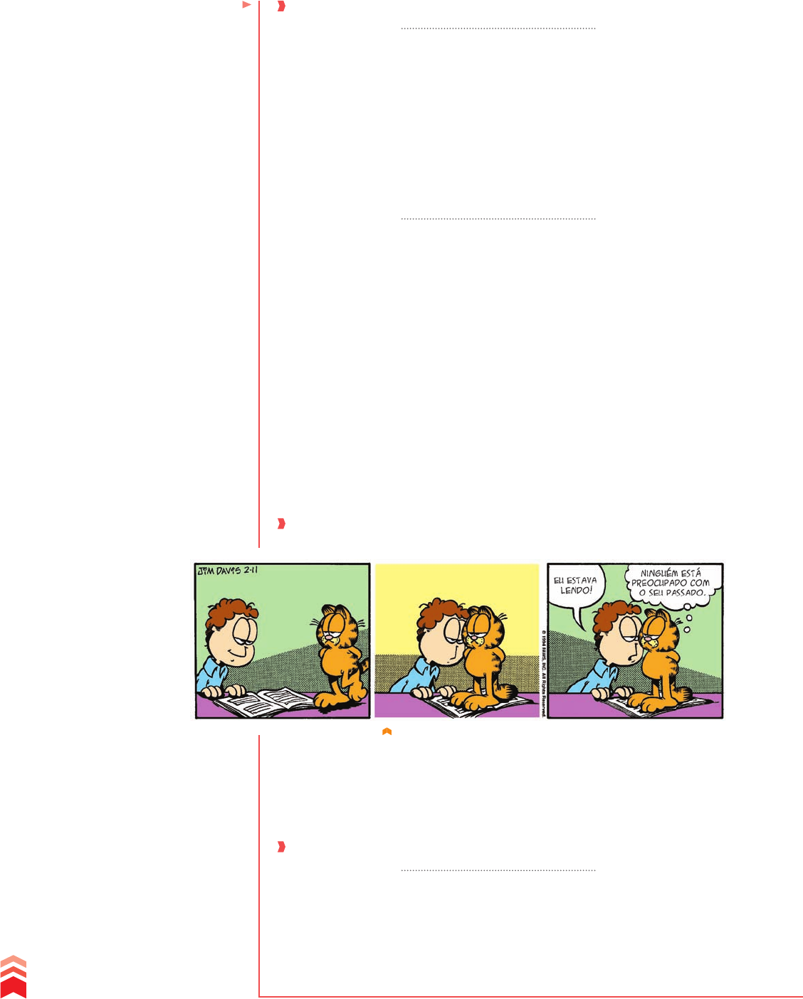 Leia o texto a seguir para responder às questões 4 e 5. Internet Leio e ouço nos principais meios de comunicação que a nova onda dos candi- datos às eleições de 2010 é tuitar. Os internautas de plantão devem ficar, como se diz na gíria do mundo virtual, "espertos, ligados, antenados". Pois muitos destes que agora estão a tuitar, depois de eleitos vão "roubar, desviar, enrolar", ou seja, "corruptar". Então vamos identificá-los, colocar na rede e depois "deletar" nas urnas. W. L. F. (Florianópolis, SC). Folha de S.Paulo. Painel do leitor, 25 abr. 2010. 4. O autor da carta faz uso do verbo tuitar, bastante utilizado em contex- tos específicos, para destacar uma prática adotada pelos candidatos às eleições de 2010. Como esse verbo foi criado? a) O autor da carta cria um outro verbo a partir do mesmo processo usado para a formação de tuitar. Identifique esse verbo. b) Que outro verbo, já existente em português, poderia ter sido usado em lugar do que foi criado pelo autor da carta? c) Por que o autor teria optado por criar um novo verbo em vez de usar um já existente? 5. O verbo tuitar está ligado ao universo da internet. Identifique, no texto, outro verbo associado a esse universo. a) Com que significado esse verbo é usado normalmente? b) Considerando o título e o assunto tratado na carta, explique por que esse verbo ganha um novo sentido. Leia a tira a seguir para responder à questão 6. DAVIS, Jim. Garfield está de dieta. Porto Alegre: L&PM, 2010. p. 58. 6. Descreva a situação retratada na tira. a) Por que John usou o verbo no passado ao se dirigir a Garfield? b) O pensamento de Garfield é fundamental para a criação de um efeito de humor. Explique por quê. Leia o texto abaixo para responder às questões de 7 a 9. O beijo no escuro Tudo aconteceu, concluiu ela depois, porque era uma executiva de- dicada, que não hesitava em ficar até altas horas da noite no escritório. Não era a única, naturalmente. Muitos faziam o mesmo, e isso também foi importante no incidente que viria a mudar a sua vida. GARFIELD Jim Davis 300 U n id ad e 4 • C la ss es d e pa la vr as R ep ro du •‹ o pr oi bi da . A rt . 1 84 d o C —d ig o P en al e L ei 9 .6 10 d e 19 d e fe ve re iro d e 19 98 . I_plus_gramatica_cap17_C.indd 300 12/6/10 4:50 PM Era muito tarde quando ela, finalmente, encerrou o trabalho. Com um suspiro, desligou o computador, arrumou-se um pouco, apagou as luzes, saiu e dirigiu-se devagar para o elevador. Não tinha motivos para pressa. [...] O elevador chegou. Seis pessoas estavam lá dentro, seis execu- tivos como ela, os seis com suas pastas, os seis com ar fatigado. Nenhum deles era conhecido. Ela entrou, a porta se fechou, a descida começou — e aí veio o blecaute. Completo: a lâmpada de segurança do elevador não funcionava. E ninguém tinha isqueiros ou fósforos. [...] Depois fez-se silêncio, o pesado e tenso silêncio comum nesses momentos. E foi nesse silêncio, nessa escuridão, que alguém a beijou. Foi sur- preendente; tão surpreendente que ela não reagiu. Mas não só por causa da surpresa. Por causa do beijo, também: um beijo tão ardente, tão apaixonado, que ela chegou a estremecer. Jamais alguém a beijara assim, jamais. [...] SCLIAR, Moacyr. O imaginário cotidiano. São Paulo: l al p ra e 7. Os verbos destacados no texto transcrito estão conjugados, predo- minantemente, em dois tempos verbais. Quais são eles? a) Transcreva os verbos que correspondem a cada um dos tempos verbais identificados por você. b) Considerando o momento em que ocorreram os fatos relatados no texto, explique a escolha desses tempos verbais. 8. “Muitos faziam o mesmo, e isso também foi importante no incidente que viria a mudar a sua vida.” Nesse período, os verbos destacados estão conjugados em tempos verbais diferentes. O que o uso de cada um deles indica a respeito das ações nomeadas pelos verbos em questão? 9. Releia. “E foi nesse silêncio, nessa escuridão, que alguém a beijou. Jamais alguém a beijara assim, jamais.” a) A ação nomeada pelo verbo beijar está conjugada, no primeiro período, no pretérito perfeito do Indicativo. Em que tempo e modo está conjugada no segundo? b) Explique por que, no contexto, o mesmo verbo foi conjugado em tempos distintos. 10. Apresentamos, no trecho transcrito a seguir, também extraído do texto de Moacyr Scliar, algumas formas verbais no Infinitivo. Sua tarefa será conjugar os verbos identificados entre parênteses, utilizando os tempos verbais adequados. Considere, no momento de flexioná-los, a relação temporal que devem manter com os verbos que aparecem destacados. Ela foi para casa, ali perto. * (Morar) no primeiro andar. * (Entrar) sem dificuldade, * (deitar-se), vestida, e * (ficar) ali, no escuro, soluçando baixinho. Soluçando de paixão, da paixão adormecida que o beijo nela despertara. Paixão por alguém que não * (conhecer), e que não * (ter) como identificar. Só lhe resta esperar pelo próximo blecaute. [...] SCLIAR, Moacyr. O imaginário cotidiano a l l al p ra e 301 C ap ít u lo 1 7 • er R ep ro du çã o pr oi bi da . A rt . 1 84 d o C ód ig o P en al e L ei 9 .6 10 d e 19 d e fe ve re iro d e 19 98 . I_plus_gramatica_cap17_C.indd 301 2/12/10 3:03:02 PM Usos dos tempos verbais a das ara er s as es r ra s d s e s arra v s aprese - ar a s r e de a e e s ass ad s a d ere es e s e p ara e s le res s a s ar s a e e s e rela l s e re s da e al e se a e s da le de e p d s ver s serve 1580 Buenos Aires Os fundadores Há cerca de meio século, um capitão espanhol se fez ao mar, em Sevilha, rumo a estas costas sem fama. Gastou na expedição toda a fortuna que tinha feito no saqueio a Roma. Aqui fundou uma cidade, um forte rodeado de ranchos, e daqui perseguiu, rio acima, a serra da prata e o misterioso lago onde dorme o sol. Dez anos antes, Sebastián Gaboto tinha buscado os tesouros do rei Salo- mão remontando este rio da Prata inocente de seu nome, que só tem barr