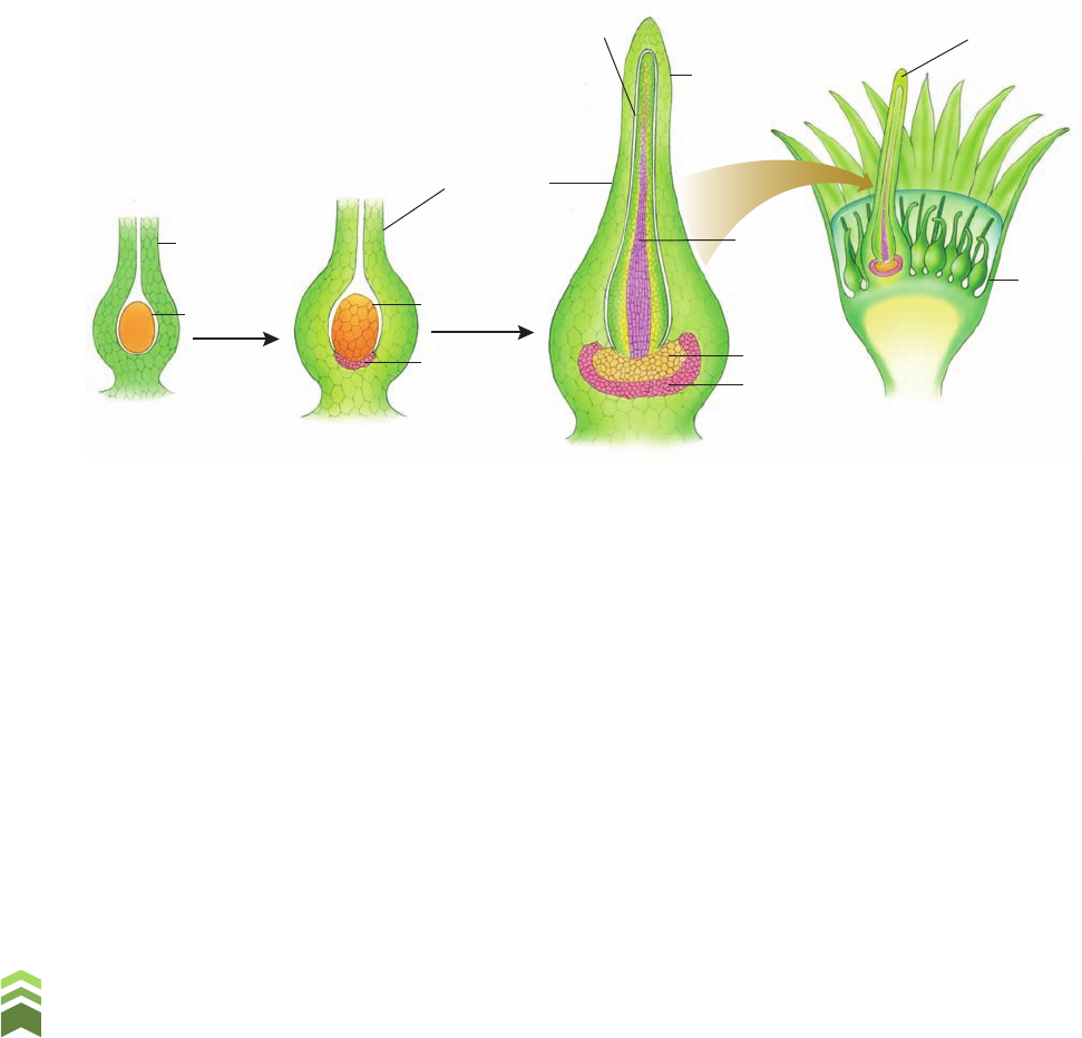 Arquegônio (n) Zigoto (2n) Embrião (2n) Placenta em formação (n) Arquegônio (gametófito) (n) Esporófito (2n) Caliptra (n) Seta ou pedúnculo em diferenciação (2n) Pé (2n) Placenta (n) Ápice do musgo feminino com arquegônios (n) Esporófito em desenvolvimento (2n) R ep ro d uç ão p ro ib id a. A rt .1 84 d o C ód ig o P en al e L ei 9 .6 10 d e 19 d e fe ve re iro d e 19 98 . 162 U n id a d e C • D iv e rs id a d e , a n at o m ia e f is io lo g ia d a s p la n ta s O embrião recebe substâncias nutritivas (açúcares, aminoácidos etc.) da plantamãe, processo conhecido como matrotrofia (do grego matros, materno, e trophos, alimentação). A passagem de nutrientes do gametófito para o embrião é feita por células especializadas da base do arque- gônio. Essas células têm inúmeras dobras na parede, o que aumenta sua superfície de contato com o embrião em desenvolvimento. Esse conjunto de células, responsável pela transferência ativa de nutrientes para o embrião em desenvolvimento, é chamado de placenta (do latim placenta, bolo, massa), por analogia ao órgão presente em certos animais e que desempenha função semelhante. Durante o desenvolvimento do embrião, o arquegônio cresce e parte dele dá origem à caliptra (do grego kalyptra, cobertura para a cabeça). Após algum tempo, o esporófito jovem resultante do desenvolvimento do embrião emerge do arquegônio, mas sua base continua intimamente associada ao órgão reprodutor feminino e recebe alimento pela placenta. Na maioria das briófitas, o esporófito maduro é formado por três partes: o pé, a porção mer- gulhada no arquegônio; a seta, ou pedúnculo, uma haste fina e longa que emerge da caliptra; a cápsula, que contém o esporângio (do grego spora, semente, e angeion, vaso) e se localiza na extremidade livre do pedúnculo. (Fig. 6.11) As células presentes no interior do esporângio são denominadas esporócitos ou célulasmãe de esporos; elas se dividem por meiose e originam células haploides, que se diferenciam em es- poros. Um único esporângio de briófita pode produzir cerca de 50 milhões de esporos capazes de gerar novos gametófitos, desde que estejam em locais favoráveis. Apesar de não apresentarem diferenciação morfológica, os esporos das briófitas dioicas são de dois tipos: um origina gametófitos masculinos e outro, gametófitos femininos. Essa diferen- ciação sexual é determinada por um par de cromossomos sexuais X e Y (sistema XY); esporos que recebem um cromossomo X desenvolvemse em gametófitos femininos; os que recebem um cromossomo Y desenvolvemse em gametófitos masculinos. Se encontrar condições favoráveis, o esporo germina, isto é, por meio de mitoses sucessivas origina as células do novo gametófito. Nos antóceros e na maioria das hepáticas, os esporos desenvolvemse diretamente em um gametófito. Na maioria dos musgos e em algumas hepáticas, o esporo origina inicialmente uma estrutura filamentosa e ramificada, o protonema, a partir do qual se formam os gametófitos. (Fig. 6.12) Figura 6.11 Esquemas de cortes longitudinais de um arquegônio de musgo com embrião em desenvolvimento. Ao lado do nome das estruturas foi representada a ploidia (constituição cromossômica das células), para ressaltar o ciclo de vida alternante. (Imagens sem escala, coresfantasia.) R ep ro d uç ão p ro ib id a. A rt .1 84 d o C ód ig o P en al e L ei 9 .6 10 d e 19 d e fe ve re iro d e 19 98 . 163 C a p ít u lo 6 • D iv e rs id a d e e r e p ro d u çã o d a s p la n ta s Esporo Protonema Rizoide Broto Protonema Detalhe da formação de um broto de gametófito GAMETÓFITO Cápsula Seta MUSGO HEPÁTICA Gametóforo Rizoide Gametófitos em formação Esporo ProtonemaRizoides GAMETÓFITO Esporófito Figura 6.12 A. Nas hepáticas o esporo origina diretamente um gametófito. B. Nos musgos, o esporo origina um protonema, a partir do qual se desenvolvem gametófitos. (Imagens sem escala, coresfantasia.) A B Os pesquisadores consideram as aquisições da placenta e da matrotrofia duas novidades evolutivas importantes no processo da evolução das plantas. Ao abrigar e nutrir o esporófito diploide no início do desenvolvimento, o gametófito aumenta a chance de que ele sobreviva. Na maturidade, o esporófito produz esporos por meiose, com mistura dos genes originalmente provenientes do gameta masculino e do gameta feminino. A diversidade genética decorrente da meiose confere maior chance de adaptação à prole. Garantir o desenvolvimento do esporófito diploide, que produz esporos variados do ponto de vista genético, parece ter contribuído para o sucesso evolutivo das plantas. AMPLIE SEUS CONHECIMENTOS Exemplos de ciclos de vida de briófitas Além de aprender os aspectos gerais da reprodução das briófitas, vale a pena estudar ciclos de vida de espécies em particular, que exemplificam e concretizam conceitos. A seguir, apresentamos os ciclos de vida de um musgo do gênero Polytrichum e de uma hepática do gênero Marchantia. Ciclo de vida de um musgo Os musgos do gênero Polytrichum têm sexos separados e seus gametófitos, com aproximadamente 5 centímetros de altura, são comuns em barrancos e rochas. Ao atingir a maturidade, os gametófitos formam uma taça folhosa no ápice, onde se diferenciam as estruturas reprodutivas — anterídios nas plantas masculinas e arquegônios nas plantas femininas. Quando ocorre uma chuva ou garoa, acumula-se a água nas taças folhosas dos ápices das plantas masculinas, o que estimula os anterídios a liberarem os anterozoides. Respingos líquidos que atingem as taças masculinas esborrifam água, carregando anterozoides para musgos femininos próximos. Os antero- zoides nadam para o interior dos arquegônios e um deles fecunda a oosfera, originando o zigoto diploide, que ao se desenvolver origina o esporófito. Embrião jovem (2n) Zigoto (2n) Oosfera sendo fecundada Oosferas (n) Anterozoide (n) Anterídios Gotas de água Gamet