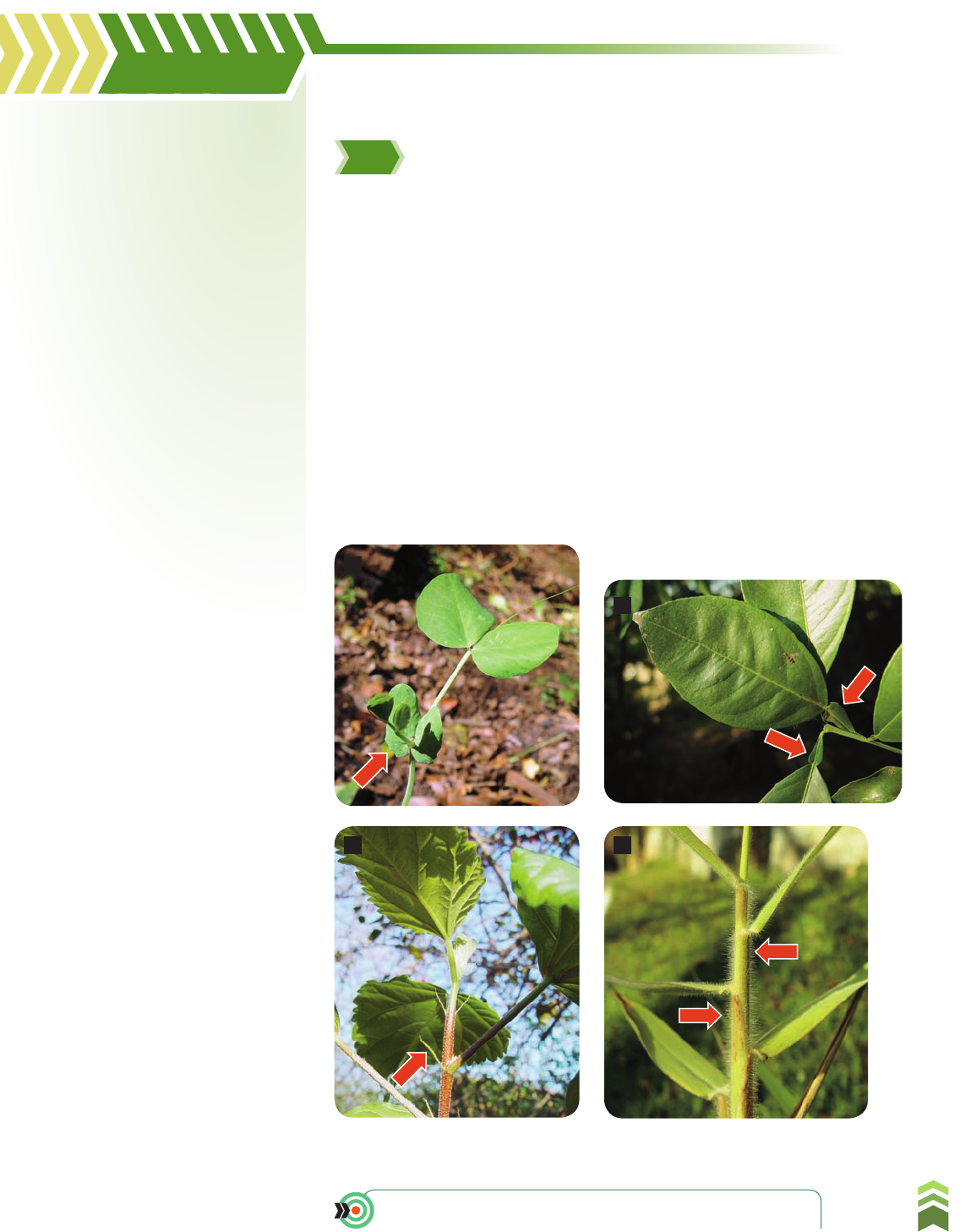 R ep ro d uç ão p ro ib id a. A rt .1 84 d o C ód ig o P en al e L ei 9 .6 10 d e 19 d e fe ve re iro d e 19 98 . 229 C a p ít u lo 7 • D e se n vo lv im e n to e m o rf o lo g ia d a s p la n ta s a n g io sp e rm a s Seção 7.4 Folha 1 Partes da folha As folhas desenvolvem-se a partir dos primórdios foliares. Como vimos, estes formam-se a partir da gema apical do caule, durante o crescimento em extensão da planta. Folhas não têm crescimento secundário: à medida que o primórdio foliar se desenvolve, os tecidos se diferenciam e se orga- nizam em uma estrutura laminar adaptada à captação de luz. A forma das folhas, assim como a disposição interna de seus tecidos, varia muito entre as espécies e reflete adaptações a diferentes tipos de ambiente. Os tipos mais comuns de folha têm uma porção laminar ex- pandida denominada limbo, ou lâmina foliar, e um pedúnculo, o pecíolo, pelo qual o limbo se prende ao ramo caulinar. Certas folhas não possuem pecíolo, sendo por isso chamadas de sésseis. A maioria das monocoti- ledôneas e algumas eudicotiledôneas têm folhas com uma expansão na base, junto ao caule, a chamada bainha foliar. Em certas folhas, na base do pecíolo há um par de projeções filamentosas ou laminares denomina- das estípulas. (Fig. 7.21) Figura 7.21 A. Estípulas laminares de ervilha. B. Pecíolo alado de folha de laranjeira. C. Estípulas filamentosas de hibisco. D. Bainha de folha de capim. Conteúdo digital Moderna PLUS http://www.modernaplus.com.br Texto: Classificação de folhas e de estruturas foliares A Objetivos❱❱❱❱ Identificar as CCCCCCC partes da folha. Conhecer a estrutura CCCCCCC e a localização dos principais tecidos foliares: epiderme, parênquimas clorofilianos, xilema e floema. Termos e conceitos❱❱❱❱ limbo• pecíolo • epiderme foliar• tricoma• mesófilo• parênquima • clorofiliano nervura foliar• B C D Epiderme superior Xilema Fibras esclerenquimáticas Floema Estômato Epiderme inferior Mesófilo (clorênquima) R ep ro d uç ão p ro ib id a. A rt .1 84 d o C ód ig o P en al e L ei 9 .6 10 d e 19 d e fe ve re iro d e 19 98 . 230 U n id a d e C • D iv e rs id a d e , a n at o m ia e f is io lo g ia d a s p la n ta s 2 Anatomia da folha A folha é totalmente revestida por epiderme, camada celular que se origina do protoderma do primórdio foliar. O interior foliar é preenchido por um tecido parenquimático denominado mesófilo, cujas células são ricas em cloroplastos; por isso, esse tecido é também chamado de parênquima clorofiliano, ou clorênquima. O mesófilo origina-se do meristema fundamental presente no primórdio foliar. No interior da folha há tecidos condutores, originados a partir do procâmbio e que se organizam em feixes liberolenhosos; há também tecidos esclerenquimáti- cos de sustentação, que se originam tanto do meristema fundamental quanto do procâmbio presentes no primórdio foliar. (Fig. 7.22) Figura 7.22 Representação esquemática tridimensional de uma folha, em corte, para mostrar a estrutura interna. (Imagens sem escala, cores- -fantasia.) (Baseado em: Campbell, N., 1999.) Estrutura da epiderme foliar A epiderme foliar é quase sempre uniestratificada, isto é, formada por uma única camada de células. Entretanto, plantas adaptadas a regiões secas (conhecidas como xerófitas, do grego xeros, seco, e phyton, planta) podem apresentar a epiderme constituída por várias camadas de células. As células epidérmicas secretam cutina, que forma uma película semi-impermeável ao vapor d’água, a cutícula, revestindo toda a folha. As trocas gasosas da folha com o ambiente são realizadas por estômatos presentes principalmente na face foliar inferior. As células dos estô- matos são as únicas da epiderme que têm cloroplastos. Em diversas plantas monocotiledôneas, os estômatos dispõem-se em fileiras paralelas ao eixo maior da folha; nas demais plantas, eles têm distribuição aleatória na superfície foliar. (Fig. 7.23) Figura 7.23 Representação esquemática de superfícies de folhas, em vista frontal microscópica mostrando dois padrões de distribuição dos estômatos: dispersos, como na eudicotiledônea à esquerda, e alinhados em relação ao eixo maior da folha, como na planta monocotiledônea à direita. (Imagens sem escala, cores-fantasia.) 231 C a p ít u lo 7 • D e se n vo lv im e n to e m o rf o lo g ia d a s p la n ta s a n g io sp e rm a s Em geral, folhas de plantas xerófitas têm relativamente mais estômatos que plantas não xerófitas. Isso é interpretado como uma adaptação à economia de água nos ambientes de baixa umidade, pois a abertura de um maior número de estômatos permite uma troca gasosa mais eficiente durante os curtos períodos em que o suprimento de água aumenta, como após uma chuva, por exemplo. Muitas plantas xerófitas apresentam ainda estômatos localizados dentro de reentrâncias, ou criptas, na face inferior das folhas. É comum haver nessas criptas grande quantidade de pelos epidérmicos, os tricomas (do grego trichos, cabelo), que formam um microam- biente úmido, reduzindo a perda de água pelos estômatos (transpiração estomatar) quando eles se abrem para permitir as trocas gasosas. Certas folhas apresentam tricomas com formas e funções diversas. Na urtiga, por exemplo, há tricomas que produzem substâncias tóxicas, com a função de proteger a planta do ataque de animais herbívoros. Em certas plantas do cerrado, as folhas têm tricomas abundantes, que contribuem para reduzir a transpiração foliar. (Fig. 7.24) Figura 7.24 Representações esquemáticas de diversos tipos de tricomas. (a) Pelo em escudo (escama). (b-c) Pelos multicelulares ramificados. (d-e) Pelos secretores; nas flores, pelos desse tipo secretam substâncias adocicadas que atraem insetos polinizadores. (f) Pelo septado. (g) Pelo absorvente de raiz. (h) Pelo multicelular da urtiga; ao ser tocado, o pelo perde a porção terminal a