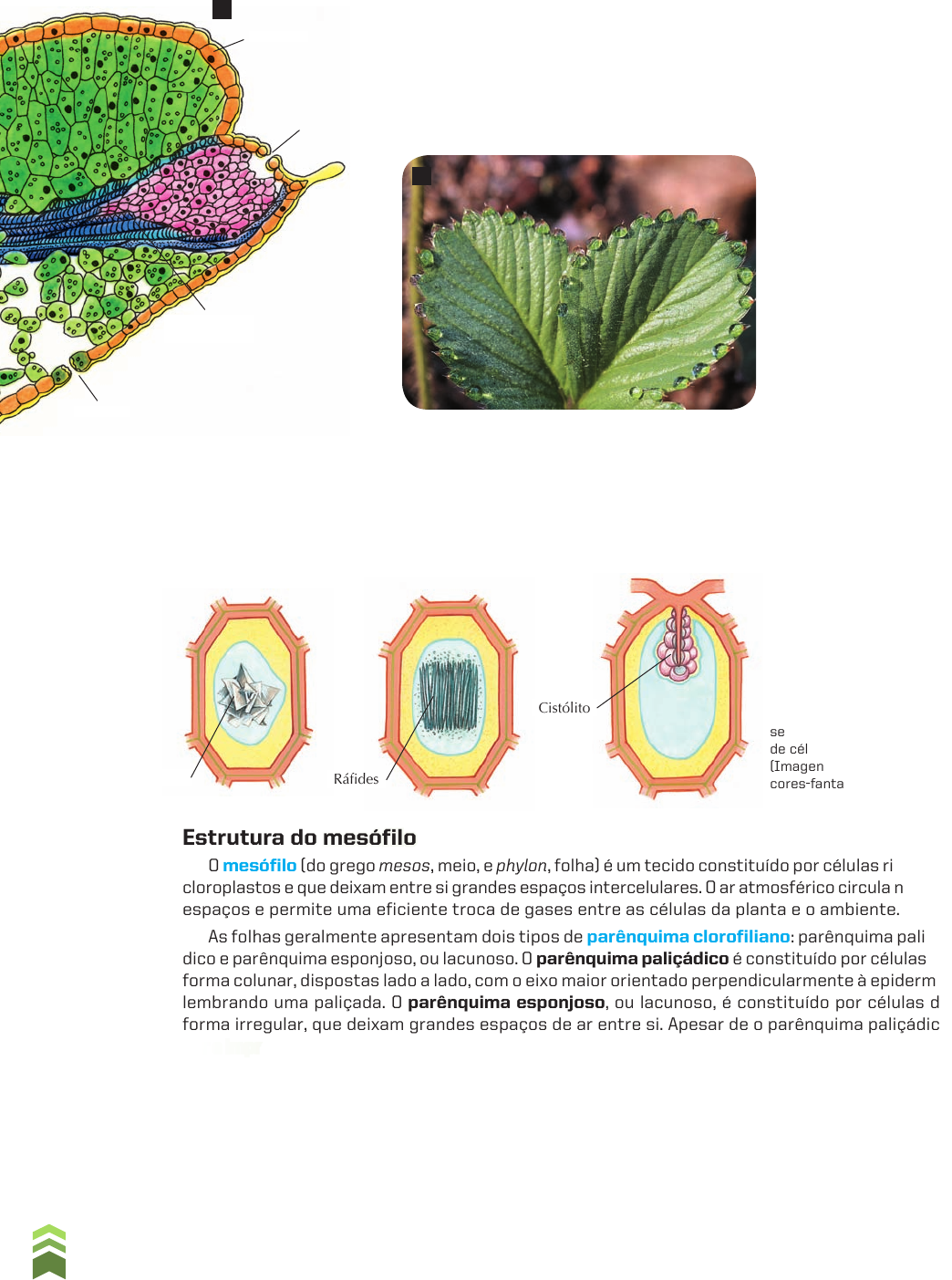 Drusa Ráfides Cistólito R ep ro d uç ão p ro ib id a. A rt .1 84 d o C ód ig o P en al e L ei 9 .6 10 d e 19 d e fe ve re iro d e 19 98 . 232 U n id a d e C • D iv e rs id a d e , a n at o m ia e f is io lo g ia d a s p la n ta s Na epiderme de certas folhas, as bordas foliares são dotadas de estruturas denominadas hidatódios, especializadas na eliminação do excesso de água da planta, processo conhecido como gutação. De manhã bem cedo é possível observar, nas bordas dessas folhas, gotas de água eliminadas através dos hidatódios. (Fig. 7.25) Figura 7.25 A. Representação esquemática de uma folha, em corte, mostrando a estrutura de um hidatódio. (Imagem sem escala, cores- -fantasia.) (Baseado em: Rawitscher, F., 1968.) B. Folhas com gotas de água eliminadas pelos hidatódios. Algumas células dos tecidos dérmicos podem acumular, em seus vacúolos, excesso de sais minerais como carbonatos e oxalatos de cálcio, que se cristalizam e produzem estruturas com formas típicas. Cristais de carbonato de cálcio lembram cachos de uva, sendo denominados cistólitos; cristais de oxalato de cálcio podem formar agulhas, denominadas ráfides, ou blocos compactos com pontas, conhecidos como drusas. (Fig. 7.26) Figura 7.26 Representações esquemáticas de tipos de cristais que podem se formar no vacúolo de células de folhas. (Imagens sem escala, cores-fantasia.) Epiderme Terminação do xilema Estômato Poro do hidatódio Estrutura do mesófilo O mesófilo (do grego mesos, meio, e phylon, folha) é um tecido constituído por células ricas em cloroplastos e que deixam entre si grandes espaços intercelulares. O ar atmosférico circula nesses espaços e permite uma eficiente troca de gases entre as células da planta e o ambiente. As folhas geralmente apresentam dois tipos de parênquima clorofiliano: parênquima paliçá- dico e parênquima esponjoso, ou lacunoso. O parênquima paliçádico é constituído por células de forma colunar, dispostas lado a lado, com o eixo maior orientado perpendicularmente à epiderme, lembrando uma paliçada. O parênquima esponjoso, ou lacunoso, é constituído por células de forma irregular, que deixam grandes espaços de ar entre si. Apesar de o parênquima paliçádico dar a impressão de ser compacto, entre suas células também há espaços com ar, como no parên- quima esponjoso. Calcula-se que a superfície das células do parênquima paliçádico em contato direto com o ar pode ser duas a quatro vezes maior que a superfície das células do parênquima esponjoso. A quantidade de cloroplastos nas células do parênquima paliçádico é bem maior que nas células do parênquima esponjoso, o que indica sua maior participação na fotossíntese. O parênquima paliçádico localiza-se geralmente na face superior da folha, que recebe mais luz. O parênquima esponjoso, por sua vez, está voltado para a epiderme da face inferior, onde se localiza a maior parte dos estômatos. Muitas xerófitas e algumas outras plantas possuem parênquima paliçádico em ambas as faces da folha, com parênquima esponjoso entre eles. Duas ou três camadas de células paliçádicas podem ser encontradas nas folhas de algumas espécies, mas a maioria apresenta uma única camada. (Fig. 7.27) B A R ep ro d uç ão p ro ib id a. A rt .1 84 d o C ód ig o P en al e L ei 9 .6 10 d e 19 d e fe ve re iro d e 19 98 . 233 C a p ít u lo 7 • D e se n vo lv im e n to e m o rf o lo g ia d a s p la n ta s a n g io sp e rm a s Epiderme superior multiestratificada Cutícula Feixe liberolenhoso Parênquima paliçádico Parênquima lacunoso M es óf ilo Cinturão de esclerênquima Epiderme inferior multiestratificada Espaços com ar Cripta Estômato Tricomas Floema Vasos lenhosos Face inFerior da FoLha Face SUPerior da FoLha Figura 7.27 Representação esquemática de folha de planta xerófita em corte transversal, mostrando a epiderme multiestratificada e uma cripta com tricomas e estômatos na face inferior. (Imagem sem escala, cores-fantasia.) (Baseado em: Raven, P. H. e cols., 1999.) Nervuras foliares Os tecidos condutores da folha encontram-se agrupados em feixes liberolenhosos, associados ou não a tecidos de sustentação, formando as nervuras foliares. Os feixes condutores da folha são prolongamentos dos feixes do caule e apresentam o xilema voltado para a face superior da folha e o floema voltado para a face inferior. Na maioria das monocotiledôneas, as nervuras têm aproximadamente a mesma espessura ao longo de todo o seu comprimento e dispõem-se para- lelamente entre si. Por isso, folhas desse tipo recebem a designação de paralelinérveas. Nas outras angiospermas, as nervuras formam um padrão ramificado, com feixes sucessivamente mais finos. Esse tipo de nervação recebe a denominação de reticulada, ou peninérvea. Ao observar uma folha reticulada, geralmente notamos uma nervu- ra central mais grossa, que se prolonga do pecíolo até a extremidade livre da folha, afinando-se progressivamente. Dela partem nervuras laterais que se ramificam em nervuras cada vez mais finas, até se tornarem invisíveis a olho nu. As nervuras mais finas terminam junto a células especiais do mesófilo que formam uma bainha ao redor das extremidades dos vasos xilemáticos e floemáticos, assegurando que nenhuma parte dos tecidos condutores entre em contato direto com o ar. As células ao redor da extremidade do feixe de elementos condutores, denominadas células da bainha do feixe, controlam a passagem de substâncias para dentro e para fora dos vasos condu- tores. É através delas que a água e os sais minerais (seiva mineral) trazidos pelo xilema são distribuídos às demais células do mesófilo e que os produtos da fotossíntese são introduzidos no floema, para ser levados às diversas partes da planta. (Fig. 7.28) Figura 7.28 Acima, folha com nervuras reticuladas. Abaixo, folha com nervuras paralelas. Conteúdo digital Moderna PLUS http://www.modernaplus.com.br Texto: Leg