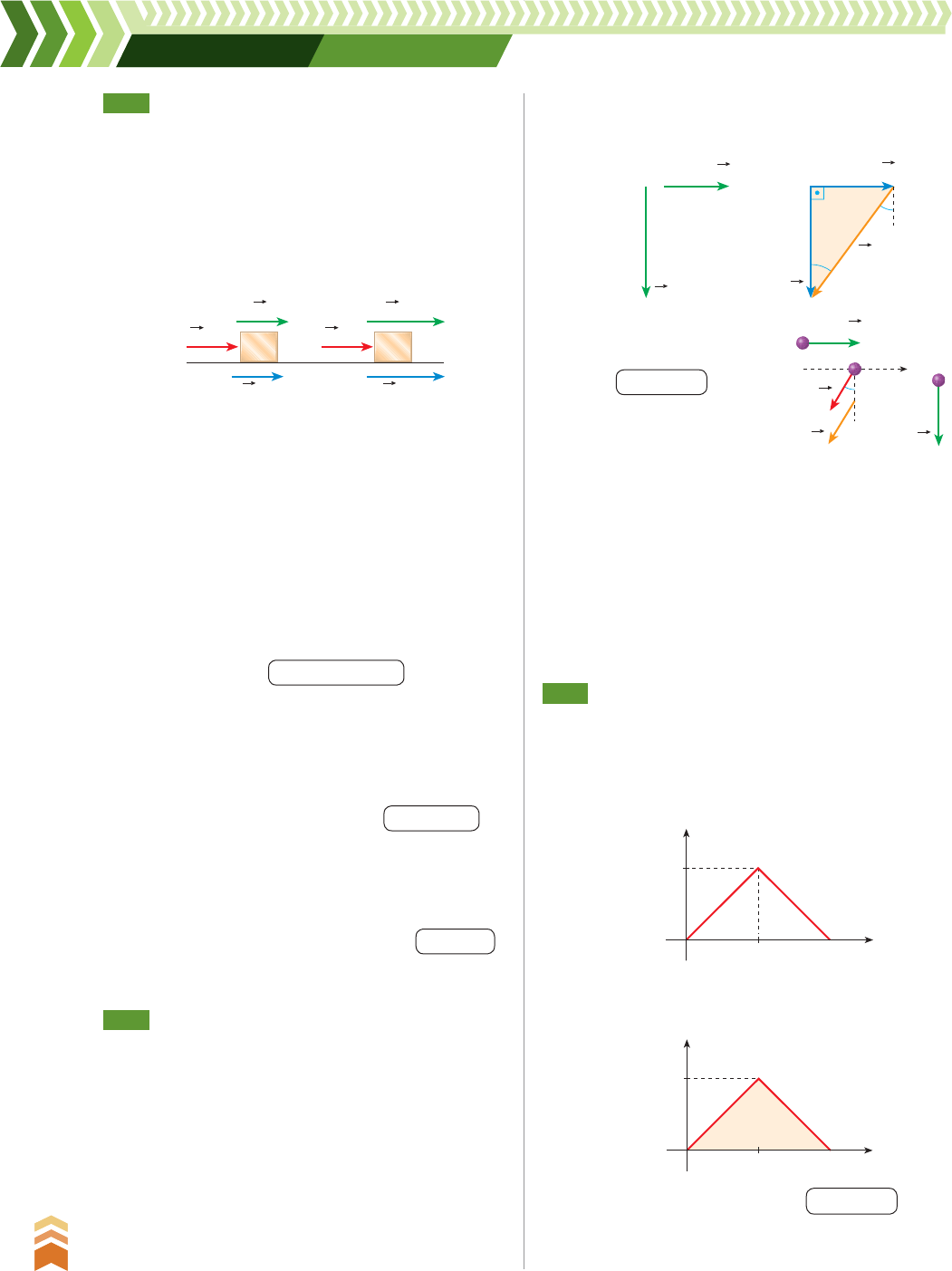 330 U n id a d e E • O s p ri n cí p io s d a c o n se rv a çã o 330 R ep ro d uç ão p ro ib id a. A rt .1 84 d o C ód ig o P en al e L ei 9 .6 10 d e 19 d e fe ve re iro d e 19 98 . R. 146 Uma força constante atua durante 5,0 s sobre uma partícula de massa 2,0 kg, na direção e no sentido de seu movimento, fazendo com que sua velocidade escalar varie de 5,0 m/s para 9,0 m/s. Determine: a) o módulo da variação da quantidade de movi- mento da partícula; b) a intensidade do impulso da força atuante; c) a intensidade da força. R. 147 Um corpo de massa m 10 kg possui velocidade v1 de direção horizontal e intensidade 3 m/s. Re- cebe um impulso I de uma força F que altera sua velocidade inicial v1 para v2, perpendicular a v1 e de intensidade igual a 4 m/s. Determine o impulso I dessa força F. a) As quantidades de movimento inicial Q 1 e final Q 2 da partícula são dadas por: Q 1 mv1 e Q 2 mv2 Sendo v1 5,0 m/s e v2 9,0 m/s as velocidades escalares inicial e final, os módulos das quanti- dades de movimento valem: Q 1 mv1 2,0 3 5,0 ] Q 1 10 kg 3 m/s Q 2 mv2 2,0 3 9,0 ] Q 2 18 kg 3 m/s Como Q 1 e Q 2 têm a mesma direção e o mesmo sentido, o módulo da variação da quantidade de movimento é: b) Aplicando o teorema do impulso à situação considerada: I Q 2 Q 1 Como o impulso tem a mesma direção e o mes- mo sentido que as quantidades de movimento, vale escrever, para sua intensidade: I Q 2 Q 1 18 10 ] I 8,0 N 3 s c) Como I FSt, a intensidade da força será dada por: Respostas: a) 8,0 kg 3 m/s; b) 8,0 N 3 s; c) 1,6 N SQ Q 2 Q 1 18 10 ] ] SQ 8,0 kg 3 m/s Sendo St 5,0 s, vem: F 8,0 ___ 5,0 ] F 1,6 N m = 2,0 kg v1 Q1 v2 F F Q2 θ 30 40 θ v1 Q1 I Q2v2 R. 148 O gráfico abaixo mostra a variação da intensidade da força F de direção constante que atua num ponto material de massa m 2 kg. Admita em t 0, v0 0. Determine: a) o módulo do impulso de F no intervalo de tempo de 0 a 10 s; b) sua velocidade em t 10 s. OI O2 302 1 402 ] ] OI O I 50 kg 3 m/s ] Sua direção J com a verti- cal pode ser dada por: tg J 30 ___ 40 ] tg J 0,75 Resposta: módulo: 50 N 3 s; direção: J é o ângulo cuja tangente vale 0,75; sentido: indicado na figura Observação: Entenda o significado físico do impulso: a velo- cidade v1 horizontal, do móvel, muda de direção, passando a v2, na direção perpendicular, ao receber a força F e, consequentemente, um impulso na direção inclinada J. ] I 50 N 3 s θ v1 F I v2 Solução: a) O módulo de I corresponde numericamente à área A da figura (área de um triângulo): 10 1050 F (N) t (s) 10 1050 F (N) t (s) A A 10 3 10 _______ 2 50 ] I 50 N 3 s b) Pelo teorema do impulso: I Q 2 Q 1 De 0 a 10 s, temos: I Q 10 Q 0 Solução: Solução: Intensidades das quantidades de movimento: Q 1 mv1 10 3 3 ] Q 1 30 kg 3 m/s Q 2 mv2 10 3 4 ] Q 2 40 kg 3 m/s Para a determinação do impulso I temos que fazer uma subtração vetorial (teorema do impulso): I Q 2 Q 1 ExErcícIos rEsolvIDos ExErcícIos propostos I FSt ] I ___ St A intensidade I na figura pode ser obtida a partir do teorema de Pitágoras aplicado ao triângulo destacado: V1_P2_UN_E_CAP_16A.indd 330 27.07.09 10:17:08 331 C a p ít u lo 1 6 • Im p u ls o e q u a n ti d a d e d e m o vi m e n to 331 Respostas: a) 50 N 3 s; b) 25 m/s I Q 10 ] I mv10 ] 50 2v10 ] ] v10 25 m/s R. 149 Um projétil de massa 20 g incide horizontalmente sobre uma tábua com velocidade de 500 m/s e a abandona com velocidade horizontal e de mesmo sentido de valor 300 m/s. Qual a intensidade do impulso aplicado ao projétil pela tábua? Solução: Intensidades das quantidades de movimento: Na figura, Q 1 e Q 2 têm o mesmo sentido do eixo adotado e I tem sentido oposto. Indicando por I, Q 1 e Q 2 os módulos dos vetores em questão, de I Q 2 Q 1, vem: Resposta: 4,0 N 3 s Q 1 mv1 20 3 103 3 500 ] Q 1 10 kg 3 m/s Q 2 mv2 20 3 103 3 300 ] Q 2 6,0 kg 3 m/s Q 1 e I têm, neste caso, mesma direção, a igualdade vetorial anterior transforma-se numa igualdade escalar, adotando-se um eixo. I Q 2 Q 1 ] I 6,0 10 ] I 4,0 N 3 s Eixo adotado v1 I Q2Q1 v2 + P. 388 Um móvel de massa 3,0 kg desloca-se horizon- talmente com velocidade escalar igual a 15 m/s constante. Num dado instante, passa a atuar sobre o móvel uma força constante de intensidade 2,5 N, durante 4,0 s, na mesma direção e no mesmo sen- tido do movimento. Determine: a) a intensidade do impulso da força atuante; b) o módulo da quantidade de movimento do mó- vel antes da ação da força; c) o módulo da quantidade do movimento do mó- vel no instante em que a força deixa de agir. P. 389 Um corpo é lançado verticalmente para cima com velocidade inicial de 20 m/s. Sendo 5,0 kg a massa do corpo, determine a intensidade do impulso da força peso entre o instante inicial e o instante em que o corpo atinge o ponto mais alto da trajetória. P. 390 (Olimpíada Brasileira de Física) Sobre um corpo de massa de 3,0 kg, movendo-se a 5,0 m/s, age uma força de maneira que, após 10 s, sua velocidade tem o valor de 2,0 m/s em sentido oposto ao inicial. Qual o valor da intensidade da força que atuou sobre esse corpo? P. 391 Numa partida de futebol, a bola, que se desloca hori- zontalmente, atinge o pé do zagueiro com velocidade v1 15 m/s. O impulso do chute do jogador faz com que a bola adquira velocidade v2 20 m/s, na direção vertical, imediatamente após o chute. A massa da bola é igual a 0,40 kg. Determine a intensidade do impulso que o pé do jogador imprime à bola. Despreze o peso da bola durante a interação entre o jogador e a bola. P. 392 Uma partícula de massa 4,0 kg descreve um movi- mento circular uniforme com velocidade escalar 10 m/s. Determine as características (direção, sentido e módulo): P. 393 Um carrinho de massa 100 g encontra-se em repouso quando nele passa a atuar uma força resultante F, de dire- ção constante, e cuja intensidade varia com o tempo, conforme o gráfico ao lado. a) da quantidade de movimento no ponto A; b) da quantidade de movimento 