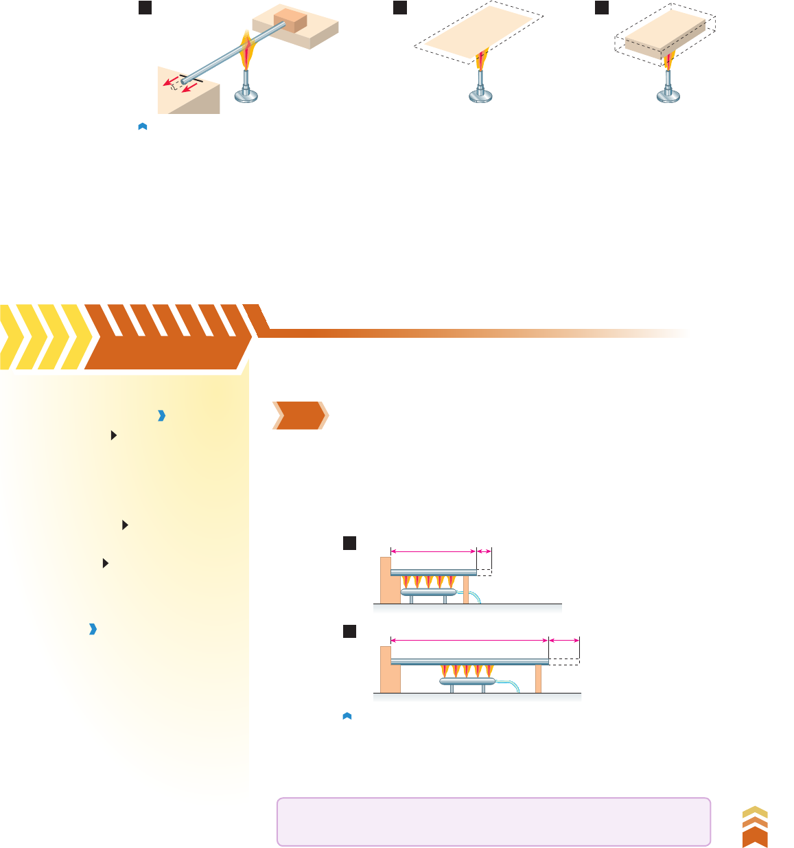 43 C a p ít u lo 3 • D ila ta çã o t é rm ic a d e s ó lid o s e lí q u id o s 43 Seção 3.2 Objetivos Avaliar a dilatação térmica de corpos sólidos utilizando as leis da dilatação linear, superficial e volumétrica. Definir dilatação relativa. Construir e analisar gráficos obtidos a partir da lei de dilatação linear. Termos e conceitos • coeficiente de dilatação linear • grau Celsius recíproco • coeficiente de dilatação superficial • coeficiente de dilatação volumétrica A dilatação térmica é sempre volumétrica (fig. 2C), pois as moléculas afastam-se umas das outras em qualquer direção que se considere. Se analisarmos a dilatação em uma só direção (variação do comprimento de uma barra, variação do diâmetro de uma esfera, variação de uma aresta de um cubo), estaremos estudando a dilatação linear (fig. 2A). Ao analisar a dilatação de duas das dimensões (variação da área de uma placa, variação da área da face de um cubo), estaremos estudando a dilatação superficial (fig. 2B). Figura 2. (A) Dilatação linear. (B) Dilatação superficial. (C) Dilatação volumétrica. Então, por conveniência, faremos o estudo da dilatação dos sólidos da seguinte maneira: • dilatação linear — aumento de uma das dimensões do corpo, como no caso do comprimento de uma barra (fig. 2A); • dilatação superficial — aumento da área de uma superfície, como a de uma placa (fig. 2B); • dilatação volumétrica — aumento do volume do corpo (fig. 2C). No caso dos líquidos, por não terem forma própria e estarem contidos em recipientes sóli dos, costumamos estudar apenas sua dilatação volumétrica. CA B 1 Dilatação linear Quando aumentamos de 10 wC a temperatura de uma barra de ferro com 100 cm de comprimento, essa dimensão aumenta de 0,012 cm (fig. 3A). Submetida ao mesmo aquecimento, uma barra de ferro com o dobro do comprimento (200 cm) tem sua dimensão aumentada de 0,024 cm, ou seja, sofre uma dilatação igual ao dobro da anterior (fig. 3B). Para uma barra com outro comprimento inicial, a mesma ele va ção de temperatura acarretará uma outra dilatação, proporcional ao compri mento inicial dessa barra. A variação de comprimento SL de uma barra que sofre aquecimento é diretamente proporcional ao seu comprimento inicial L0. Dilatação dos sólidos Figura 3. Influência do comprimento inicial na dilatação. L0 = 100 cm ∆L ∆L = 0,012 cm L0 = 200 cm ∆L ∆L = 0,024 cm A B V2_P1_UN_B_CAP_03.indd 43 22.08.09 08:51:28 44 U n id a d e B • A t e m p e ra tu ra e s e u s e fe it o s 44 R ep ro d uç ão p ro ib id a. A rt .1 84 d o C ód ig o P en al e L ei 9 .6 10 d e 19 d e fe ve re iro d e 19 98 . Voltando ao exemplo da barra de ferro, de comprimento inicial L0 100 cm, a elevação de 10 wC na temperatura produz uma dilatação de 0,012 cm (fig. 4A). Uma elevação de tempe ratura duas vezes maior (20 wC) faz o comprimento da barra aumentar de 0,024 cm, isto é, acarreta uma dilatação igual ao dobro da anterior (fig. 4B). A variação de comprimento SL de uma barra que sofre aquecimento é diretamente proporcio nal à variação de temperatura SJ. Figura 4. Influência da variação de temperatura na dilatação. ∆L∆θ = 10 °C ∆L = 0,012 cm A ∆θ = 20 °C ∆L ∆L = 0,024 cm B Repetindo as experiências com barras de materiais diferentes, observamos o mesmo com portamento, mas a dilatação é específica para cada caso. Tendo em vista que a dilatação SL de uma barra é diretamente proporcional ao comprimento inicial L0 e à variação de temperatura SJ, temos: SL a 3 L0 3 SJ Nessa fórmula, a é uma constante de proporcionalidade denominada coeficiente de dila- tação linear, característico de cada material. Essa fórmula expressa, algebricamente, a lei da dilatação linear. Tomemos novamente o primeiro exemplo apresentado. O comprimento inicial é L0 100 cm, a variação de temperatura é SJ 10 wC e a dilatação (variação de comprimento) é SL 0,012 cm. O coeficiente de dilatação linear será dado por: a SL _______ L0 3 SJ ] a 0,012 cm _______________ 100 cm 3 10 wC ] a 0,000012 cm _______ cm 3 wC O valor encontrado é o coeficiente de dilatação linear do ferro e tem o seguinte significado: Ocorre uma dilatação de 0,000012 cm para cada cm de comprimento da barra e para cada wC de variação de temperatura. A variação de comprimento SL de uma barra que sofre aquecimento depende do material que a constitui. V2_P1_UN_B_CAP_03.indd 44 22.08.09 08:51:29 45 C a p ít u lo 3 • D ila ta çã o t é rm ic a d e s ó lid o s e lí q u id o s 45 R ep ro d uç ão p ro ib id a. A rt .1 84 d o C ód ig o P en al e L ei 9 .6 10 d e 19 d e fe ve re iro d e 19 98 . O coeficiente de dilatação linear, como foi definido, corresponde a um valor médio entre a tem peratura inicial e a temperatura final. É possível definir um coeficiente a SL _______ L0 3 SJ para dada temperatura pelo limite da expressão SL _______ L0 3 SJ quando o intervalo de temperatura SJ tende a zero. Contudo, não sendo muito grande a variação de temperatura, o valor médio do coeficiente de dilatação praticamente coincide com o coeficiente em dada temperatura. Outra fórmula para a dilatação linear é obtida substituindo-se SL por (L L0), sendo L o comprimento final. L L0 a 3 L0 3 SJ ] L L0 a 3 L0 3 SJ Dilatação relativa Chama-se dilatação relativa de um corpo a relação entre o valor da dilatação que esse corpo sofre e o valor inicial de suas dimensões. Essa relação pode ser dada porcentualmente, o que é bastante comum. Assim, quando dizemos que o comprimento de uma barra aumentou de 0,5%, isso significa que a relação entre sua dilatação SL e seu volume inicial L0 vale: SL ___ L0 0,5% 0,5 ____ 100 0,005 Com base na fórmula que expressa a lei da dilatação, poderíamos escrever, nesse caso: a 3 SJ 0,5 ____ 100 0,005 Observe que, conhecida a dilatação relativa e a variação de temperatura, podemos 