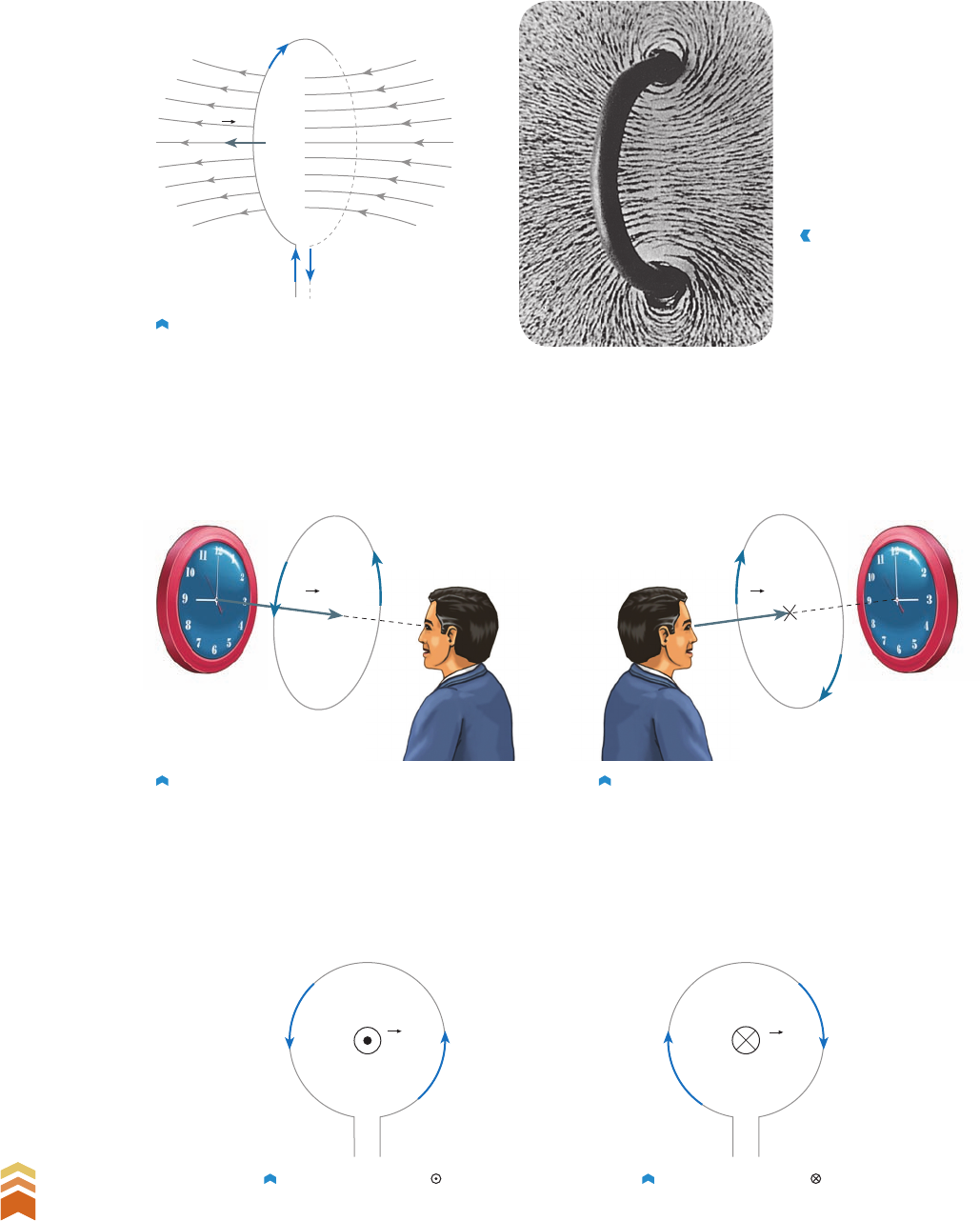 308 U n id a d e C • El e tr o m a g n e ti sm o 308 R ep ro d uç ão p ro ib id a. A rt .1 84 d o C ód ig o P en al e L ei 9 .6 10 d e 19 d e fe ve re iro d e 19 98 . Externamente, as linhas de indução saem do polo norte de um ímã e chegam ao polo sul. Uma espira per cor rida por uma corrente elétrica origina um campo magnético análogo ao de um ímã, e então atribui-se a ela um polo norte, do qual as linhas saem, e um polo sul, no qual elas chegam (fig. 16). i i Polo norte Polo sul i B Figura 16. Em uma espira circular, temos um polo norte e um polo sul. Visualização, com limalha de ferro, de um campo magnético gerado por condutor em forma de espira circular percorrido por corrente elétrica. Pode-se usar a seguinte regra prática para determinar a natureza norte ou sul de um polo da espira, denominada regra do relógio. Olhando de frente para o centro de uma face da espira, percebemos se esta é um polo norte (fig. 17) ou um polo sul (fig. 18), conforme o sentido da corrente. Figura 17. Polo norte: se a corrente for vista no sentido anti-horário. Figura 18. Polo sul: se a corrente for vista no sentido horário. A espira pode também ser representada no plano da figura, quando então o vetor indução mag nética B no centro será perpendicular a esse plano. Para representar B nessas condições, exis tem dois símbolos internacionalmente usados para quaisquer vetores, conforme mostrado nas fi guras 19 e 20. Polo norte i i B Figura 19. O símbolo representa o vetor orientado do plano para o observador. Polo sul i i B Figura 20. O símbolo representa o vetor orientado do observador para o plano. ExErCíCIo rEsolvIDo B i i B ii V3_P2_UN_C_CAP_13a.indd 308 19.09.09 16:47:42 309 C a p ít u lo 1 3 • C a m p o s m a g n é ti co s 309 Justapondo-se N espiras iguais, de modo que a espessura do en- rolamento seja muito menor que o diâmetro de cada espira, temos a denominada bobina chata (fig. 21), na qual a intensidade do ve tor indução magnética B no centro vale: i R Bb Figura 21. Bobina chata. Aproximando-se um ímã de uma bobina (fig. 22), verifica-se que o polo norte do ímã atrai o sul e repele o norte da bobina. N Figura 22. O comportamento de uma bobina é análogo ao de um ímã. Bb 5 N 3 j0 ___ 2 3 i __ R N ExErCíCIo rEsolvIDo R. 124 Duas espiras circulares E1 e E2, concêntricas e coplanares, de raios R1 5 10s cm e R2 5 2,5s cm, são per corridas pelas correntes elétricas i1 e i2, indicadas na figura. Sendo i1 5 10 A e j0 5 4s 3 1027 T 3 m/A: a) caracterize o vetor indução magnética originado pela corrente elétrica i1 no centro O; b) deter mine o valor de i2 para que o vetor indução magnética re- sultante no centro seja nulo. E1 R1 R2 E2 i1 i2 O Solução: a) Con siderando apenas a espira E1, o campo magnético que ela origina no centro O terá as carac te rís ticas mostradas na figura: E1 R1 i1 O i1 Vista em perspectiva B1 E1 R1 i1 O i1 Vista frontal i1 = 10 A R1 = 10π cm = 10–1 � π m B1 direção: perpendicular ao plano da espira; sentido: determinado pela regra da mão direita no 1 ou pela regra do relógio. Na vista frontal, B1 es tá orientado do observador para o plano e representado pela convenção internacional ⊗; intensidade: B1 5 j0 ___ 2 3 i1 ___ R1 ] B1 5 4s 3 1027 _________ 2 3 10 ______ 1021 s ] B1 5 2 3 1025 T V3_P2_UN_C_CAP_13a.indd 309 19.09.09 16:47:44 310 U n id a d e C • El e tr o m a g n e ti sm o 310 R ep ro d uç ão p ro ib id a. A rt .1 84 d o C ód ig o P en al e L ei 9 .6 10 d e 19 d e fe ve re iro d e 19 98 . b) Considerando apenas a espira E2, o campo magnético que ela origina no centro O terá as carac te rís ticas indicadas na figura: E2i2 Vista em perspectiva i2 O B2 E2 i2 O i2 Vista frontal B2 R2 = 2,5π cm = 2,5 � 10–2 � π m direção: perpendicular ao plano da espira; sentido: na vista frontal, B2 está orientado pela convenção internacional ; Resposta: a) B1 com intensidade 2 3 1025 T; b) 2,5 A i1 i2 i2 i1 B1 B2 intensidade: B2 5 j0 ___ 2 3 i2 ___ R2 Para que o vetor indução magnética resultante no centro O seja nulo, como B1 e B2 têm a mesma direção e sen tidos opostos (figura ao lado), eles devem ter a mesma intensidade: B1 5 B2 ] j0 ___ 2 3 i1 ___ R1 5 j0 ___ 2 3 i2 ___ R2 ] i1 ___ R1 5 i2 ___ R2 Assim, temos: i1 ___ R1 5 i2 ___ R2 ] 10 _______ 1021 3 s 5 i2 ____________ 2,5 3 1022 3 s ] i2 5 2,5 A ExErCíCIos propostos P. 311 Duas espiras circulares, concêntricas e coplanares, de raios pratica- mente iguais a 2s m são per cor ri das pelas correntes elétricas i1 5 5 A e i2 5 3 A, indicadas na figura. Sendo j0 5 4s 3 1027 T 3 m/A, ca rac te rize o vetor indução magnética originado no centro O. i2 O i1 P. 312 Duas espiras circulares, concêntricas e coplanares, de raios R1 e R2, são percorridas pelas correntes elétricas i1 e i2 indicadas na figura. Sendo nulo o vetor indução magnética resultante no centro O, deter- mine a relação entre as correntes elétricas i1 __ i2 . R1 R2 i1 i2 O P. 313 Uma bobina chata é formada de 50 espiras circulares de raio 10 cm. Sendo j0 5 4s 3 1027 T 3 m/A, calcule a intensidade da corrente elétrica que deve percorrer a bobina para que o vetor indução magnética, no centro, te nha intensidade 2 3 1023 T. V3_P2_UN_C_CAP_13a.indd 310 19.09.09 16:47:46