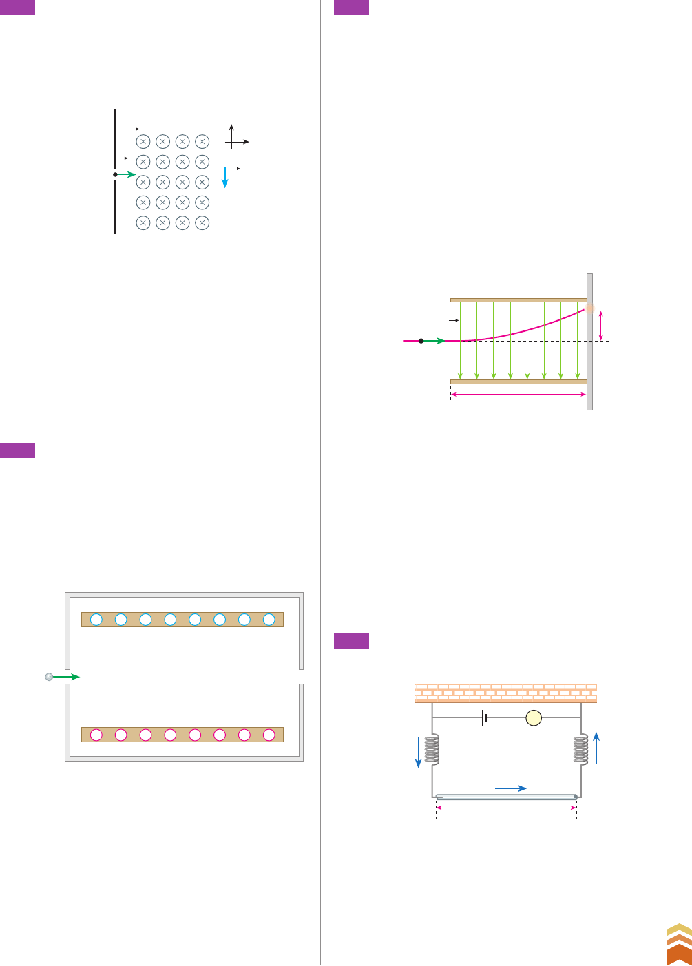 357 C a p ít u lo 1 4 • Fo rç a m a g n é ti ca 357 R ep ro d uç ão p ro ib id a. A rt .1 84 d o C ód ig o P en al e L ei 9 .6 10 d e 19 d e fe ve re iro d e 19 98 . Região com campo magnético x y B v0 g P. 356 (UFG-GO) Uma partícula de massa igual a 20 mg (miligramas) com carga de 100 jC (1 j 106), deslocando-se com velocidade de 1,0 cm/s ao lon- go da direção x, entra em uma região com campo mag nético uniforme, de intensidade igual a 10 T, apontando na direção perpendicular ao plano do pa pel e sentido indicado na figura. a) Qual seria a trajetória descrita pela partícula, se, na região de campo magnético, os efeitos da ace le ração gravitacional fossem desprezados? b) Determine o módulo, a direção e o sentido da força magnética exercida sobre a partícula, no ins tan te em que ela penetra na região de campo magnético. c) Considerando, agora, que a partícula esteja também sujeita a uma aceleração gravitacional de intensidade g 10 m/s2, no sentido indicado na figura, calcule a aceleração resultante sobre a partícula, no exato instante em que ela penetra na região com campo magnético. P. 357 (UFMG) Seletores de velocidade são utilizados em alguns aparelhos para permitir a passagem somen- te de íons que têm uma determinada velocidade. Nesses seletores, um campo elétrico e um campo magnético são aplicados de tal forma, que apenas íons com uma velocidade específica o atravessam sem serem desviados. O campo elétrico é produzido por duas placas metá- licas paralelas, nas quais é aplicada uma diferença de potencial, como representado na figura abaixo. Íon – – – – – – – – + + + + + + + + O campo magnético, constante e uniforme, é produ- zido por um eletroímã, não mostrado nessa figura. Considere que o peso dos íons é desprezível. a) Indique, na figura acima, as direções e os senti- dos que os campos elétrico e magnético devem ter, na região entre as placas, a fim de que íons positivos atravessem o seletor de ve locidades sem serem desviados. Justifique sua resposta. b) Considere que, no seletor representado, a dis- tância entre as placas é de 5,0 mm e a di ferença de potencial aplicada é de 5,0 kV, e que se deseja que apenas íons com velocidade de 1,0 # 106 m/s sejam selecionados. Calcule o módulo do campo magnético que deve ser aplicado nessa situação. P. 359 (UFG-GO) Para medir a intensidade de um campo magnético uniforme, utiliza-se o aparato ilustrado na figura abaixo. A i i i U 2,5 cm O fio condutor tem comprimento 2,5 cm e massa 1,0 g; as molas, condutoras de eletricidade, têm constante elástica 5,0 N/m. Quando a tensão elétrica está desligada, as molas apresentam de- formação de 2,0 mm. Com a tensão ajustada para produzir uma corrente de 1,0 A as molas retornam ao estado natural. Dado que o campo magnético é perpendicular ao plano da figura, determine a sua magnitude e o seu sentido. Despreze os efeitos da corrente e do campo sobre as molas. P. 358 (UFJF-MG) J. J. Thomson, o descobridor do elétron, em 1897 realizou experimentos com um tubo de raios catódicos. Thomson notou que os raios cató- dicos podiam ser desviados por campos elétricos e magnéticos e, por isso, deveriam ser constituídos de partículas carregadas. Com esse experimento, Thomson concluiu que to- das as partículas que compõem os raios catódicos tinham a mesma razão q __ m entre a carga e a massa, e as denominou elétrons. Considere o tubo de raios catódicos na figura, onde um campo elétrico uniforme de módulo E 1,0 # 103 V/m é gerado entre duas placas metálicas planas e paralelas de comprimento x 10 cm. Ao atravessar a região entre as placas, as partículas são defletidas, atingindo uma tela fosforescente a uma distância y 3,5 cm da direção de incidência. Ev0 y x a) Calcule a razão q __ m da partícula, em função da deflexão y, da velocidade inicial v0, da distância x e do módulo do campo elétrico E. b) Realizando a experiência, Thomson verificou que a introdução de um campo magnético uni- forme de módulo B 2,0 # 104 T entre as placas, perpendicularmente ao campo elétrico, fazia a deflexão y tornar-se zero. Calcule a velocidade v0 das partículas com essas informações. c) Usando os resultados dos itens anteriores, cal- cule o valor numérico da razão q __ m entre a carga q e a massa m da partícula. V3_P2_UN_C_CAP_14b.indd 357 19.09.09 16:54:38 358 U n id a d e C • El e tr o m a g n e ti sm o 358 R ep ro d uç ão p ro ib id a. A rt .1 84 d o C ód ig o P en al e L ei 9 .6 10 d e 19 d e fe ve re iro d e 19 98 . P. 361 (Fuvest-SP) O ímã representado na figura, com largu- ra L 0,20 m, cria, entre seus polos, P1 e P2, um campo de indução magnética B, horizontal, de intensidade constante e igual a 1,5 T. Entre os polos do ímã, há um fio condutor f, com massa m 6,0 3 103 kg, re- tilíneo e horizontal, em uma direção perpendicular à do campo B. As extremidades do fio, fora da região do ímã, estão apoiadas e podem se mover ao longo de guias condutores, verticais, ligados a um gerador de corrente G. A partir de um certo instante, o fio f passa a ser percorrido por uma corrente elétrica constante I 50 A. Nessas condições, o fio sofre a ação de uma força F0, na direção vertical que o ace- lera para cima. O fio percorre uma distância vertical, d 0,12 m, entre os polos do ímã e, em seguida, se desconecta dos guias, prosseguindo em movimento livre para cima, até atingir uma altura máxima H. g L G P1 P2 f b) o trabalho total D, em joules, realizado pela força F0. c) a máxima altura H, em metros, que o fio alcança, medida a partir de sua posição inicial. 45° i + – T TL L1 B Note e adote: 1) Um fio condutor retilíneo, de comprimen- to C, percorrido por uma corrente elétrica I, totalmente inserido em um campo de indução magnética de módulo B, perpen- dicular à direção do fio, fica sujeito a uma força F, de módulo igual a B 3 I 3 C, perpen- dicular à 