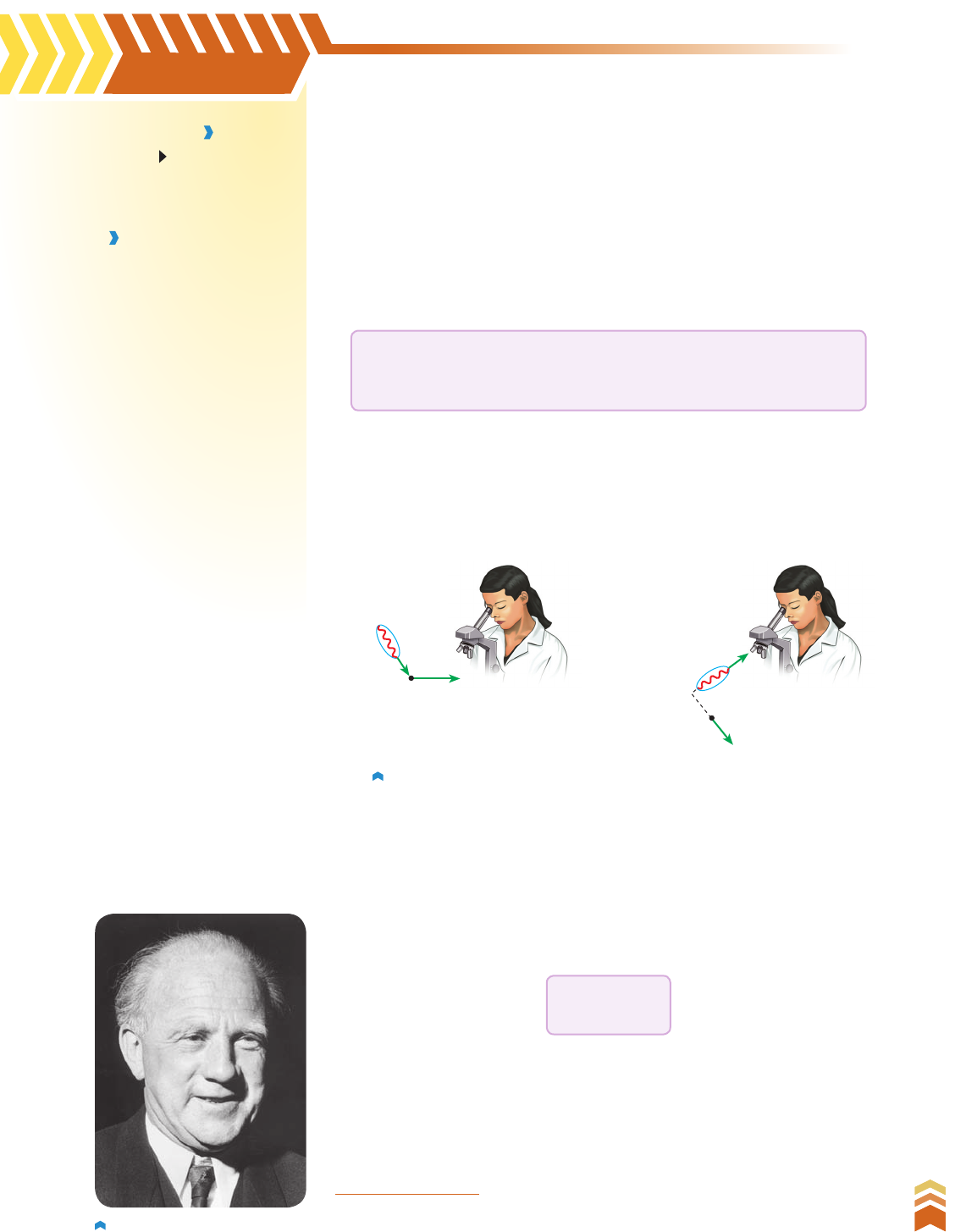 463 C a p ít u lo 1 9 • Fí si ca Q u â n ti ca 463 R ep ro d uç ão p ro ib id a. A rt .1 84 d o C ód ig o P en al e L ei 9 .6 10 d e 19 d e fe ve re iro d e 19 98 . Quanto maior a precisão na determinação da posição do elétron, menor é a precisão na determinação de sua velocidade ou de sua quantidade de movimento e vice-versa. Para evidenciar tal fato, Heisenberg utilizou a seguinte experiência mental: com um supermicroscópio, analisou o movimento de um elétron, iluminando-o com um raio de luz. Como o raio de luz é constituído de fó- tons, houve a colisão entre um fóton e o elétron, o qual recebeu uma certa quantidade de movimento. Nessas condições, alteram-se a velocidade e a posição do elétron (fig. 17). Elétron Fóton incidente Antes da colisão Elétron desviado Fóton refletido Depois da colisão Figura 17. * HEISENBERG, Werner Karl (1901-1976), físico alemão, estabeleceu a teoria da chamada Me- cânica Quântica de Heisenberg. Foi diretor do Instituto de Física Max Planck, em Berlim. Por meio das leis de Newton, conhecendo a posição e a velocidade iniciais e o sistema de forças que age num ponto material, podemos determinar em instantes posteriores sua posição e sua velocidade. Ao efetuarmos medidas, confirmando as leis que regem os movimentos, a interação do ponto material com o aparato experimental altera o resul- tado das medidas. Quanto mais refinado for o equipamento usado, mais precisas serão as medidas. Entretanto, em 1927, Werner Heisenberg* propôs a indeterminação associada à posição e à velocidade do elétron no interior do átomo. Werner Heisenberg. Sx 3 SQ > h ___ 4s Seção 19.5 Objetivo Compreender o princípio da incerteza proposto por Heisenberg. Termos e conceitos • indeterminismo Na Física Quântica, ao contrário do que ocorre na Física Clássica, a posição de uma partícula num certo instante não fica determinada. So- mente temos a probabilidade de encontrá-la numa determinada região: essa é a base do indeterminismo. Muitos físicos não aceitaram esses conceitos, inclusive Einstein, que a respeito do princípio da incerteza afirmou: “Deus não joga dados com o Universo!”. O princípio da incerteza, de Heisenberg Quanto menor for o comprimento de onda do fóton incidente, mais precisamente localizamos o elétron, pois suas dimensões são extrema- mente pequenas. Menor comprimento de onda significa maior frequência e portanto mais energético é o fóton. Maior energia implica maior desvio e maior incerteza na velocidade. Heisenberg relacionou a incerteza Sx, na medida da posição x da par- tícula, com a incerteza SQ, na medida de sua quantidade de movimento Q, obtendo a fórmula: V3_P3_UN_D_CAP_19b.indd 463 28.09.09 18:30:18 464 U n id a d e D • In tr o d u çã o à F ís ic a M o d e rn a 464 R ep ro d uç ão p ro ib id a. A rt .1 84 d o C ód ig o P en al e L ei 9 .6 10 d e 19 d e fe ve re iro d e 19 98 . testes propostos Sx > 6,63 3 1034 ________________________ 4s 3 9,1 3 1031 3 3,0 3 102 ] ] Sx > 1,93 3 103 m 0,193 m Resposta: a) Sx > 1,93 3 103 m 0,193 cm; b) Sx > 5,9 3 1031 m b) Para a bolinha de pinguepongue: Sx > h ___________ 4s 3 m 3 Sv ] ] Sx > 6,63 3 1034 _______________________ 4s 3 3,0 3 103 3 3,0 3 102 ] ] Sx > 5,9 3 1031 m R. 160 A incerteza na medida da velocidade v de uma partícula é Sv 3,0 3 102 m/s. Sendo h 6,63 3 1034 J 3 s a constante de Planck, determine a incerteza Sx, na medida da posição x, quando: a) a partícula é um elétron de massa 9,1 3 1031 kg; b) a partícula é uma bolinha de pinguepongue de massa 3,0 g. P. 418 Uma bola de futebol, de massa 400 g, atinge a velocidade de 108 km/h. Determine para essa velocidade: a) o comprimento de onda de De Broglie ; b) a incerteza mínima da posição da bola, sabendose que sua velocidade foi medida com uma incerteza de 2%. Dada a constante de Planck h 6,63 3 1034 J 3 s. P. 419 Um elétron, cuja massa é 9,1 3 1031 kg, deslocase com velocidade de 1,0 3 106 m/s. Determine para o elétron: a) o comprimento de onda de De Broglie; b) a incerteza mínima da posição do elétron, sabendose que sua velocidade foi medida com uma incerteza de 2%. Dada a constante de Planck h 6,63 3 1034 J 3 s. exercício resolvido Solução: a) De Sx 3 SQ > h ___ 4s , sendo SQ m 3 Sv, temos Sx > h ___________ 4s 3 m 3 Sv . Portanto: Observação: Para a bolinha de pinguepongue a incerteza mínima da posição x é de 5,9 3 1031 m, sendo to talmente desprezível quando comparada com as dimensões da bolinha. O mesmo não acontece com o elétron. Daí a importância do princípio da incerteza na escala atômica. exercícios propostos V3_P3_UN_D_CAP_19b.indd 464 28.09.09 18:30:18 465 C a p ít u lo 1 9 • Fí si ca Q u â n ti ca 465 R ep ro d uç ão p ro ib id a. A rt .1 84 d o C ód ig o P en al e L ei 9 .6 10 d e 19 d e fe ve re iro d e 19 98 . T. 446 (UFMG) A luz emitida por uma lâmpada fluorescen te é produzida por átomos de mercúrio excitados, que, ao perderem energia, emitem luz. Alguns dos comprimentos de onda de luz visível emitida pelo mercúrio, nesse processo, estão mostrados na tabela. Considere que, nesse caso, a luz emitida se propaga no ar. T. 447 (UFRGSRS) Identifique a alternativa que preenche corretamente a lacuna do parágrafo a seguir. O ano de 1900 pode ser considerado o marco inicial de uma revolução ocorrida na Física do século XX. Naquele ano, Max Planck apresentou um artigo à Sociedade Alemã de Física, introduzindo a ideia da da energia, da qual Einstein se va leu para, em 1905, desenvolver sua teoria sobre o efeito fotoelétrico. a) conservação b) quantização c) transformação d) conversão e) propagação T. 448 (UEPB) Quanta do latim Plural de quantum Quando quase não há Quantidade que se medir Qualidade que se expressar Fragmento infinitésimo Quase que apenas mental... Gilberto Gil O trecho citado é da música Quanta, que faz refe rência ao quanta, denominação atribuída aos pe quenos p