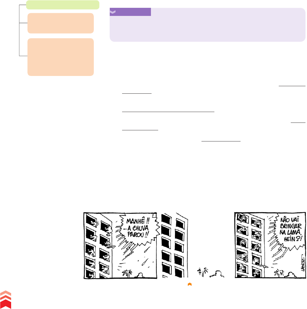 Tipos de aposto• De acordo com o valor que tem em relação ao termo ao qual se relaciona na oração, o aposto pode ser: • Explicativo: Assisti a um documentário sobre Chuck Jones, criador do Pernalonga, na TV a cabo. • Enumerativo: Para vencer na vida, são necessárias três qualidades: coragem, determinação e paciência. • Recapitulativo (resumidor): Lápis, cadernos, borrachas, canetas, todos esses objetos atraem a atenção das crianças nas papelarias. • Comparativo: O rio caudaloso, serpente negra, traz o progresso para as populações ribeirinhas. Na escrita, o aposto é sempre antecedido por vírgula ou dois-pontos. O aposto explicativo e o comparativo são antecedidos e seguidos de vírgula. Vocativo Observe a tira abaixo. No primeiro quadrinho, arfield se apresenta como “o maior, mais terrível e mais malvado gato da Terra”. No último quadrinho, define seu comparsa Pook como “o maior, mais terrível e mais malvado ursinho de pano”. Caso desejasse somente se identificar e informar o nome do seu ursinho de estimação poderia ter dito apenas: “Sou arfield e este é o meu ursinho Pook .”. A tira explora o efeito de humor criado por uma situação inesperada: o gato que se apresenta como “o maior, mais terrível e mais malvado” tem um ursinho de pano. E acha muito natural caracterizar o simpático bichinho como “o maior, mais terrível e mais malvado ursinho de pano”. As informações adicionais (“o maior, mais terrível e mais malvado gato da Terra” e “o maior, mais terrível e mais malvado ursinho de pano”) são introduzidas na oração para caracterizar, de modo mais detalhado, cada personagem. Embora essas informações não sejam essenciais estrutura da oração, é por meio delas que se constrói o efeito de humor da tira. Tais informações atuam, na oração, como apostos. As crianças da tira, para se dirigirem a suas mães, usam um termo que funciona como um chamamento: “Manhê ”. Aposto Pode ser explicativo, enumerativo, recapitulativo ou comparativo. sempre antecedido por vírgula ou por dois-pontos, sendo que os explicativos e os comparativos são antecedidos e seguidos de vírgula. Tome nota Aposto é o termo que, acrescentado a outro termo da oração, tem a fun- ção de ampliar, resumir, explicar ou desenvolver mais o conteúdo do termo ao qual se refere. LAERTE. Striptiras, N. 4. Porto Alegre: L&PM, 2010. p. 109. STRIPTIRAS Laerte 406 U n id ad e 5 • S in ta xe : e st ud o da s re la çõ es e nt re a s pa la vr as R ep ro du çã o pr oi bi da . A rt . 1 84 d o C ód ig o P en al e L ei 9 .6 10 d e 19 d e fe ve re iro d e 19 98 . I_plus_gramatica_cap22_C.indd 406 10/12/10 5:03:00 PM Como sua função é estabelecer um vínculo explícito com o contexto discursivo, o vocativo é um termo que goza de independência sintática no interior das orações e dos períodos. Leia com atenção o anúncio a seguir para responder às questões 1 e 2. A finalidade desse termo é chamar a atenção das mães, para dizer a elas que a chuva parou. As janelas vazias, no segundo quadrinho, sugerem que as crianças foram brincar na rua. A advertência feita pelas mães, no último quadrinho, é responsável pelo efeito de humor da tira, porque leva o leitor a constatar que a relação entre mães e filhos é sempre igual. Os termos que, na língua, atuam como forma de chamamento são denominados vocativos. Tome nota Vocativo é o termo que tem a função de interpelar diretamente o interlocutor. ATIVIDADES Clube de Criação de São Paulo. Disponível em: <http://ccsp.com.br/ novo/pop_pecas.php?id=33114>. Acesso em: 2 out. 2010. 1. Qual é o objetivo do anúncio? Explique. 2. Os dois enunciados em destaque no anúncio foram criados por meio de um jogo com as palavras criança e mundo. Explique como esse jogo linguístico é sintaticamente construído. a) Os termos criança e mundo desempenham funções sintáticas dife- rentes em cada enunciado. Que funções são essas? b) De que maneira esse jogo linguístico contribui para deixar claro o objetivo do anúncio? 33 milhões de livros distribuídos gratuitamente para crianças e jovens de todo o Brasil. Fundação EDUCA DPASCHOAL 407 C ap ít u lo 2 2 • S in ta xe d o pe rí od o si m pl es R ep ro du çã o pr oi bi da . A rt . 1 84 d o C ód ig o P en al e L ei 9 .6 10 d e 19 d e fe ve re iro d e 19 98 . I_plus_gramatica_cap22_C.indd 407 10/12/10 5:03:00 PM Leia com atenção a tira a seguir para responder às questões 3 e 4. Laerte MACANUDO Liniers 3. Descreva a situação apresentada na tira. 4. Observe os termos que os dois amigos utilizam para interpelar um ao outro. Que função sintática eles desempenham? De que maneira o uso desses termos contribui para a construção do ff efeito de humor da tira? Leia com atenção o anúncio a seguir para responder às questões 5 e 6. As pessoas não se entre- gam assim. Só com uma imprensa livre, a verdade aparece. LINIERS. Macanudo, N. 1. Campinas: Zarabatana Books, 200 . p. 13. Clube de Criação de São Paulo. Disponível em: <http://ccsp.com. br/novo/pop_pecas. php?id=336 6>. Acesso em: 2 out. 2010. 408 U n id ad e 5 • S in ta xe : e st ud o da s re la çõ es e nt re a s pa la vr as R ep ro du çã o pr oi bi da . A rt . 1 84 d o C ód ig o P en al e L ei 9 .6 10 d e 19 d e fe ve re iro d e 19 98 . I_plus_gramatica_cap22_C.indd 408 10/12/10 5:03:02 PM