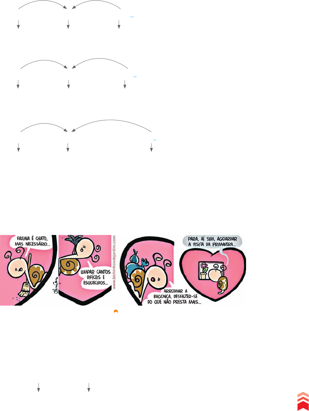 2. O substantivo que atua como núcleo do sujeito da oração não é pre- cedido por qualquer elemento que o determine. Nesse caso, o adjetivo deve permanecer no masculino singular. Veja a fala de Caramelo, no primeiro quadrinho da tira. Observe. A cautela é necessária no trato com os animais ferozes. adjetivo (feminino, singular) artigo (feminino, singular) substantivo (núcleo do sujeito) (feminino, singular) A entrada de animais é proibida no clube. adjetivo (feminino, singular) artigo (feminino, singular) substantivo (núcleo do sujeito) (feminino, singular) A torta de maçãs da minha mãe é boa. adjetivo (feminino, singular) artigo (feminino, singular) substantivo (núcleo do sujeito) (feminino, singular) Na fala da personagem, o substantivo que atua como núcleo do sujei- to — faxina — não vem precedido de artigo ou outro determinante. Por esse motivo, o adjetivo chato permanece no masculino singular. Veja outros exemplos. É proibido bebida alcoólica no acampamento. adjetivo (masculino, singular) substantivo (núcleo do sujeito) (feminino, singular) GOMES, Clara. Bichinhos de jardim. Disponível em: <http://bichinhosdejardim.com>. Acesso em: 24 out. 2010. BICHINHOS DE JARDIM Clara Gomes 487 C ap ít u lo 2 7 • C on co rd ân ci a e re gê nc ia R ep ro du çã o pr oi bi da . A rt . 1 84 d o C ód ig o P en al e L ei 9 .6 10 d e 19 d e fe ve re iro d e 19 98 . I_plus_gramatica_cap27_C.indd 487 10/12/10 5:06:48 PM Concordância verbal A regra geral que estabelece o princípio da concordância verbal, no português, já foi apresentada quando tratamos da identificação dos sujeitos das orações. Observe a tira abaixo. É necessário cautela no transporte de cargas inflamáveis. adjetivo (masculino, singular) substantivo (núcleo do sujeito) (feminino, singular) Em alguns casos, o sujeito aparece após o verbo, o que não afeta as relações de concordância. Uma vez identificado o núcleo do sujeito, o verbo deve concordar com ele em número e pessoa. Veja o exemplo. Veremos, a seguir, os diferentes casos em que a gramática normativa estabelece regras específicas de concordância verbal. verbo (núcleo do predicado) (3a pessoa do plural) pronome pessoal (núcleo do sujeito) (3a pessoa do plural) “Eles me puseram em espera.” substantivo (núcleo do sujeito) (3a pessoa do discurso: equivalente ao pronome eles) VTD (núcleo do predicado) (3a pessoa do plural) O livro de Harry Potter, leram todos os alunos do Ensino Médio. Lembre-se O verbo que atua como núcleo do predicado verbal concorda em número e pes- soa com o núcleo do sujeito a que se refere. THAVES, Bob. Frank & Ernest. São Paulo: Devir, 2009. p. 60. FRANK & ERNEST Bob Thaves 488 U n id ad e 7 • A rt ic ul aç ão d os t er m os n a or aç ão R ep ro du çã o pr oi bi da . A rt . 1 84 d o C ód ig o P en al e L ei 9 .6 10 d e 19 d e fe ve re iro d e 19 98 . I_plus_gramatica_cap27_C.indd 488 10/12/10 5:06:49 PM Casos especiais com sujeitos simples• Expressões partitivas + substantivo / pronome Quando o sujeito apresenta uma expressão partitiva (uma parte de…, grande parte de…, a maior parte de…, grande número de…, a maioria de…, uma porção de…) seguida de um substantivo ou de um pronome no plural, o verbo pode ficar no singular (concordando com o substantivo que ocorre na expressão partitiva) ou ir para o plural. O verbo ficará no singular caso se opte por fazer a concordância com o substantivo ou pronome substantivo que antecede a expressão partitiva. Observe a fala de Jon, no primeiro quadrinho. O verbo ficou no singular porque se optou por fazer a concordância verbal com o substantivo maioria, que é o núcleo do sujeito da frase. O verbo iria para o plural caso se optasse por fazer a concordância com o substantivo que aparece após a expressão partitiva, no núcleo do adjun- to adnominal. Se o tradutor da tira do Garfield tivesse feito essa opção, a flexão do verbo iria para o plural. Veja. substantivo (núcleo do adjunto adnominal) (3a pessoa do discurso, plural) A maioria dos gatos não tomam sorvete. Porcentagem Quando o sujeito apresenta apenas a expressão numérica de uma porcen- tagem, o verbo deverá concordar com o valor dessa expressão numérica. substantivo (núcleo do sujeito) (3a pessoa do discurso, singular) “A maioria dos gatos não toma sorvete.” Expressão partitiva GARFIELD Jim Davis DAVIS, Jim. Garfield. Folha de S.Paulo. São Paulo, 16 jul. 2001. 489 C ap ít u lo 2 7 • C on co rd ân ci a e re gê nc ia R ep ro du çã o pr oi bi da . A rt . 1 84 d o C ód ig o P en al e L ei 9 .6 10 d e 19 d e fe ve re iro d e 19 98 . I_plus_gramatica_cap27_C.indd 489 10/12/10 5:06:50 PM