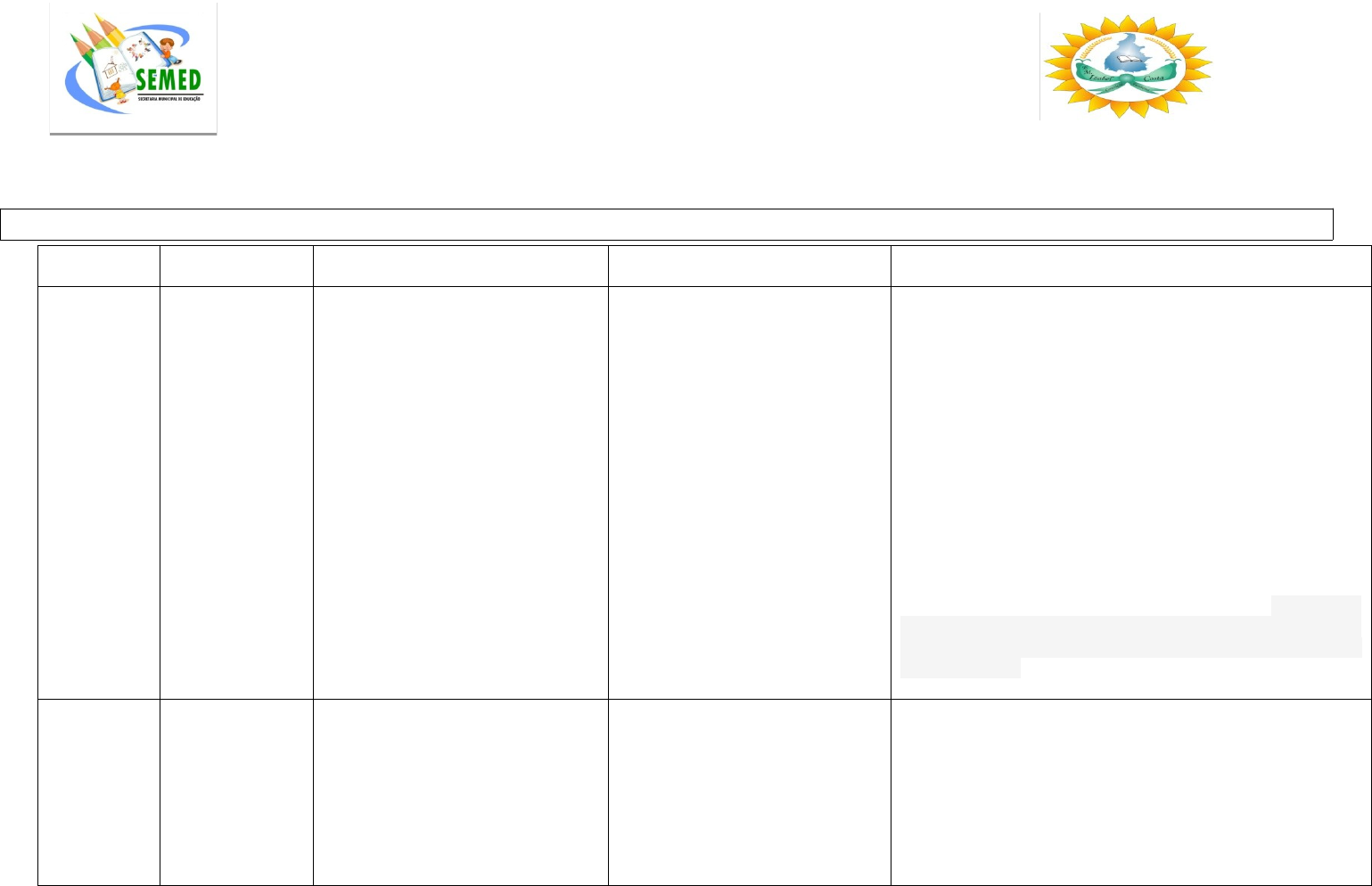 ESTADO DO TOCANTINS SECRETARIA MUNICIPAL DE EDUCAÇÃO FUNDO MUNICIPAL DA EDUCAÇÃO ESCOLA MUNICIPAL IZABEL COSTA DCT- AULAS REMOTAS 2020 ( LÍNGUA PORTUGUESA - 2º ANO DO ENSINO FUNDAMENTAL - 1º BIMESTRE/AULAS REMOTAS ) Ca Eixo Habilidades Objetos de Conhecimento Estratégias/ Recursos VIDA COTIDIANA L e i t u ra / e s c u t a (compartilhada e autônoma) (EF02LP12) Ler e compreender com certa autonomia cantigas, letras de canção, dentre outros gêneros do campo da vida cotidiana, considerando a situação comunicativa e o tema/assunto do texto e relacionando sua forma de organização à sua finalidade. Leitura e compreensão com ajuda do professor e/ou certa autonomia de cantigas e letras de canção. As aulas serão trabalhadas utilizando-se do ensino e conscientização, Através de vídeo aulas, músicas infantis, histórias acontecimentos do dia a dia, brincadeiras diversas em casa, passeios com a família, leituras de vários gêneros textuais, alfabeto móvel, jogos, pesquisas, livros diversos e muitos outros como corte e colagem, desenhos livres, atividades individual (Juntamente com a família) de forma que o aluno assimile os conceitos das disciplinas trabalhadas. Ainda a percepção ótica, mostrando os seus efeitos, o olhar sobre os diversos ângulos de uma problemática e solução da mesma. O desenvolvimento, do trabalho, constituirá na discussão da importância ligada à formação dos alunos para a aquisição da leitura e escrita, utilizando-se de produção de material didático, representado por atividades diversificadas, roteiros de leitura, e outros instrumentos úteis na sua prática e na reflexão, sempre na perspectiva nas questões do dia a dia e escolar. Através de Atividades xerocopiadas, Vídeos Aulas, Áudios, Celular, computador, Livro didático, jogos pedagógicos, textos informativos etc. VIDA COTIDIANA/TODOS OS CAMPOS DE ATUAÇÃO Escrita (compartilhada e autônoma). (EF12LP05) Planejar e produzir, em colaboração com os colegas e com a ajuda do professor, (re) contagens de histórias, poemas e outros textos versificados (letras de canção, quadrinhas, cordel), poemas visuais, tiras e histórias em quadrinhos, dentre outros gêneros do campo artístico-literário, considerando a situação comunicativa e a finalidade do texto. Escrita com a ajuda do professor e/ou autônoma e compartilhada de cantigas e letras de canções. Análise Linguística/ Semiótica (Alfabetização) (EF12LP07) Identificar e (re) produzir, em cantiga, quadras, quadrinhas, parlendas, trava-línguas, e canções, rimas, aliterações, assonâncias, o ritmo de fala relacionado ao ritmo e à melodia das músicas e seus efeitos de sentido. (EF02LP06) Perceber o princípio acrofônico que opera nos nomes das letras do alfabeto. Forma de composição, identificando rimas, aliterações, assonâncias e ritmo, com a ajuda do professor. Conhecimento do alfabeto do português do Brasil. VIDA PÚBLICA /TODOS OS CAMPOS DE ATUAÇÃO L e i t u ra / e s c u t a (compartilhada e autônoma) (EF15LP03) Localizar informações explícitas em textos. (EF15LP04) Identificar o efeito de sentido produzido pelo uso de recursos expressivos gráfico-visuais em textos multissemióticos. Estratégia de Leitura. Localização de informações explícitas. Identificação de efeito de sentido em slogans e/ou anúncios publicitários. VIDA PÚBLICA Escrita (compartilhada e autônoma). Análise Linguística/ Semiótica (Alfabetização). Oralidade. (EF12LP16) Identificar e reproduzir, em anúncios publicitários e textos de campanhas de conscientização destinados ao público infantil (orais e escritos, digitais ou impressos), a formatação e diagramação específica de cada um desses gêneros, inclusive o uso de imagens. (EF15LP19) Recontar oralmente, com e sem apoio de imagem, textos literários lidos pelo professor. (EF12LP02) Buscar, selecionar e ler, com a mediação do professor (leitura compartilhada), textos que circulam em meios impressos ou digitais, de acordo com as necessidades e interesses. Identificação e reprodução em anúncios publicitários da formatação e diagramação específicas deste gênero. Reconto de história. Formação do leitor. Leitura e escuta de textos e livros literários. ( 2º ANO DO ENSINO FUNDAMENTAL - 2º BIMESTRE )ARTÍSTICO-LITERÁRIO/TODOS OS CAMPOS Escrita (compartilhada e autônoma) Análise Linguística/ Semiótica (Alfabetização) (EF02LP27) Reescrever textos narrativos literários lidos pelo professor. (EF02LP02) Segmentar palavra em sílabas e remover e substituir sílabas iniciais, mediais ou finais para criar novas palavras. (EF02LP07) Escrever palavras, frases, textos curtos nas formas imprensa e cursiva. Escrita autônoma e com a ajuda do professor de textos narrativos literários. Decodificação/Fluência de leitura. Segmentação de palavras. Substituição de sílabas iniciais, mediais e finais. Criação de novas palavras. Conhecimento das diversas grafias do alfabeto. Formação de palavras, frases e textos curtos nas formas imprensa e cursiva. Ca Eixo Habilidades Objetos de Conhecimento Estratégias/ Recursos VIDA COTIDIANA L e i t u ra / e s c u t a (compartilhada e autônoma) (EF12LP04) Ler e compreender, em colaboração com os colegas e com a ajuda do professor ou já com certa autonomia, listas, agendas, calendários, avisos, convites, receitas, instruções de montagem (digitais ou impressos), dentre outros gêneros do campo da vida cotidiana, considerando a situação comunicativa e o tema/assunto do texto e relacionando sua forma de organização à sua finalidade. Compreensão em leitura com certa autonomia de bilhetes e cartas (digitais ou impressos) dentre outros. Identificação dos tipos e uso dos sinais de pontuação na leitura dos textos. As aulas serão trabalhadas utilizando-se do ensino e conscientização, Através de vídeo aulas, músicas infantis, histórias acontecimentos do dia a dia, brincadeiras diversas em ca