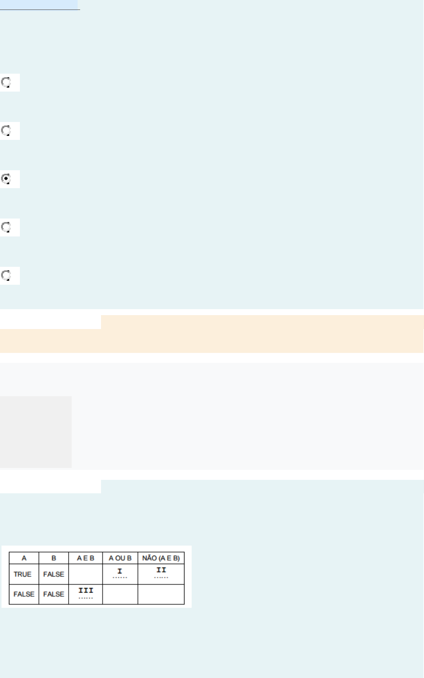 Raciocínio Lógico CESGRANRIO) Maria disse que sua família possui um único carro. Se Maria mentiu, então a sua família a. não possui carro. b. possui outro tipo de veículo. c. não possui carro, ou possui mais de um carro. d. não gosta de carros. e. possui mais de um carro. Feedback A resposta correta é: não possui carro, ou possui mais de um carro. Questão 2 Correto Atingiu 0,50 de 0,50 Marcar questão Texto da questão (FCC) O tipo boolean é um tipo de dado utilizado na programação de computadores. Em operações lógicas o resultado será sempre um valor boolean TRUE ou FALSE. Estas operações, muitas vezes, são apresentadas em uma tabela conhecida como "tabela verdade", como a tabela abaixo. As lacunas I, II e III são preenchidas, correta e respectivamente, por: a. TRUE, TRUE e TRUE b. FALSE, FALSE e TRUE. c. TRUE, TRUE e FALSE. d. TRUE, FALSE e FALSE e. FALSE, TRUE e TRUE Feedback A resposta correta é: TRUE, TRUE e FALSE. Questão 3 Correto Atingiu 0,50 de 0,50 Marcar questão Texto da questão (CESPE) Considere a seguinte sentença: “O vinho é produzido pelo pisar das uvas e o azeite é obtido pelo prensar das azeitonas, da mesma forma, o caráter do homem é forjado pelas dificuldades que ele passa”. Se P, Q e R são proposições simples e convenientemente escolhidas, essa sentença pode ser representada, simbolicamente, por: Escolha uma opção: a. (P→R)∨R(𝑃→𝑅)∨𝑅 b. P→R𝑃→𝑅 c. (P∨Q)∧R(𝑃∨𝑄)∧𝑅 d. (P∧R)↔Q(𝑃∧𝑅)↔𝑄 e. P∧R𝑃∧𝑅 Feedback Sua resposta está correta. A resposta correta é: (P∧R)↔Q(𝑃∧𝑅)↔𝑄 Questão 4 Correto Atingiu 0,50 de 0,50 Marcar questão Texto da questão (Enem-2009) Apesar da ciência, ainda é possível acreditar no sopro divino – o momento em que o Criador deu vida até ao mais insignificante dos micro-organismos? Resposta de Dom Odilo Scherer, Cardeal Arcebispo de São Paulo, nomeado pelo Papa Bento XVI em 2007: “Claro que sim. Estaremos falando sempre que, em algum momento, começou a existir algo, para poder evoluir em seguida. O ato do criador precede a possibilidade de evolução: só evolui algo que existe. Do nada, nada surge e evolui.” LIMA, Eduardo. “Testemunha de Deus”. Superinteressante, São Paulo, n. 263-A, p. 9, mar. 2009 (Adaptação). Resposta de Daniel Dennet, filósofo americano ateu e evolucionista radical, formado em Harvard e Doutor por Oxford: “É claro que é possível, assim como se pode acreditar que um super-homem veio para a Terra há 530 milhões de anos e ajustou o DNA da fauna cambriana, provocando a explosão da vida daquele período. Mas não há razão para crer em fantasias desse tipo.” LIMA, Eduardo. “Advogado do Diabo”. Superinteressante, São Paulo, n. 263-A, p. 11, mar. 2009 (Adaptação). Os dois entrevistados responderam a questões idênticas, e as respostas a uma delas foram reproduzidas aqui. Tais respostas revelam opiniões opostas: um defende a existência de Deus e o outro não concorda com isso. Para defender seu ponto de vista: a. o filósofo utiliza dados históricos em sua argumentação, ao afirmar que a crença em Deus é algo primitivo, criado na época cambriana, enquanto o religioso baseia sua argumentação no fato de que algumas coisas podem “surgir do nada”. b. Scherer impõe sua opinião, pela expressão “claro que sim”, por se considerar autoridade competente para definir o assunto, enquanto Dennett expressa dúvida, com expressões como “é possível”, assumindo não ter opinião formada. c. o arcebispo usa uma lacuna da ciência para defender a existência de Deus, enquanto o filósofo faz uma ironia, sugerindo que qualquer coisa inventada poderia preencher essa lacuna. d. o arcebispo critica a teoria do Design Inteligente, pondo em dúvida a existência de Deus, e o ateu argumenta com base no fato de que algo só pode evoluir se, antes, existir. e. o religioso ataca a ciência, desqualificando a Teoria da Evolução, e o ateu apresenta comprovações científicas dessa teoria para derrubar a ideia de que Deus existe. Feedback A resposta correta é: o arcebispo usa uma lacuna da ciência para defender a existência de Deus, enquanto o filósofo faz uma ironia, sugerindo que qualquer coisa inventada poderia preencher essa lacuna. Questão 5 Correto Atingiu 0,50 de 0,50 Marcar questão Texto da questão (FCC) O número mínimo de pessoas em um grupo para que se garanta que, necessariamente, haja 7 delas que fazem aniversário no mesmo mês do ano é Escolha uma opção: a. 83 b. 13 c. 43 d. 73 e. 23 Feedback Sua resposta está correta. A resposta correta é: 73 image3.wmf image4.png image1.wmf image2.wmf