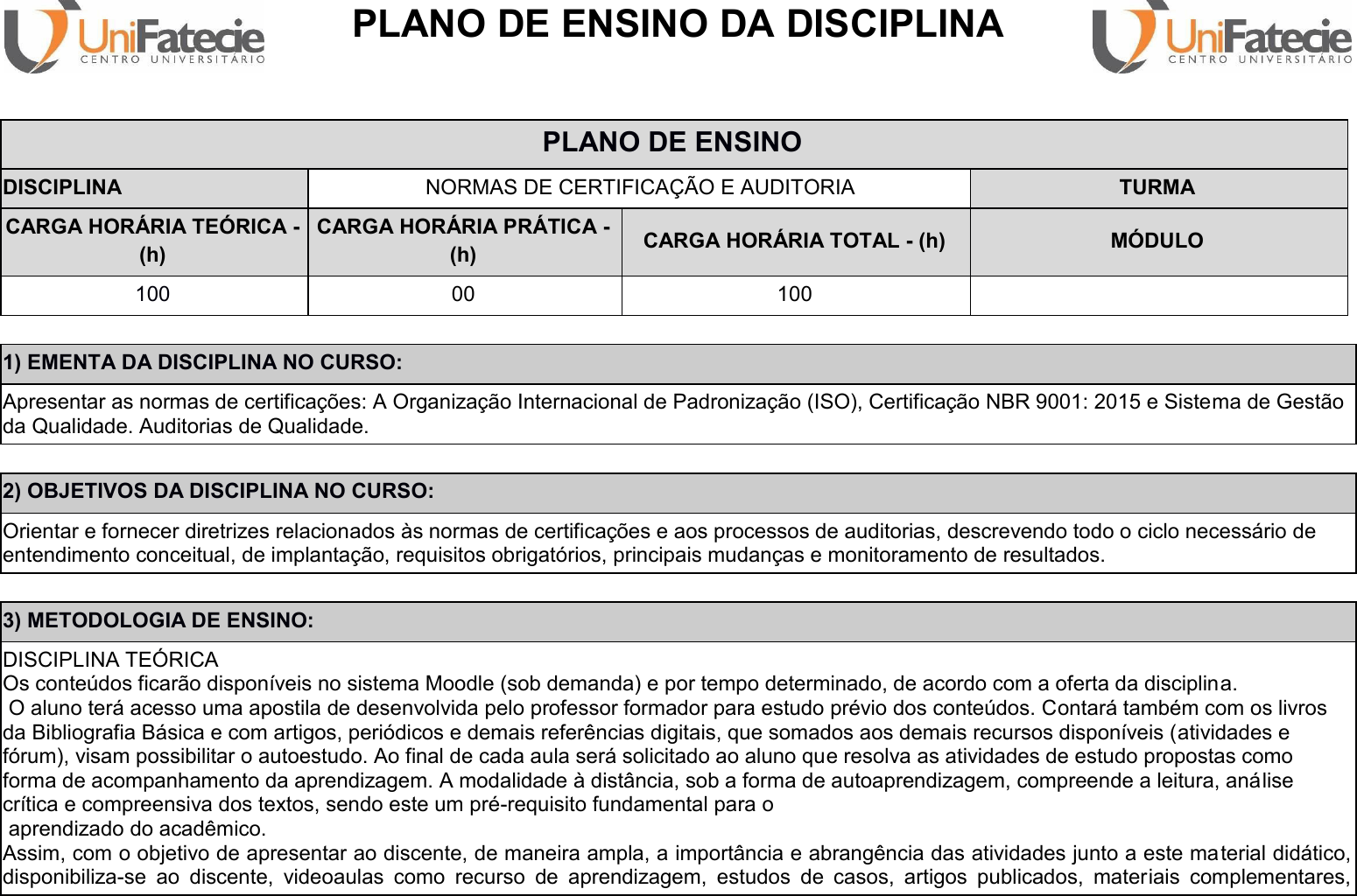 PLANO DE ENSINO DA DISCIPLINA PLANO DE ENSINO DISCIPLINA NORMAS DE CERTIFICAÇÃO E AUDITORIA TURMA CARGA HORÁRIA TEÓRICA - (h) CARGA HORÁRIA PRÁTICA - (h) CARGA HORÁRIA TOTAL - (h) MÓDULO 100 00 100 1) EMENTA DA DISCIPLINA NO CURSO: Apresentar as normas de certificações: A Organização Internacional de Padronização (ISO), Certificação NBR 9001: 2015 e Sistema de Gestão da Qualidade. Auditorias de Qualidade. 2) OBJETIVOS DA DISCIPLINA NO CURSO: Orientar e fornecer diretrizes relacionados às normas de certificações e aos processos de auditorias, descrevendo todo o ciclo necessário de entendimento conceitual, de implantação, requisitos obrigatórios, principais mudanças e monitoramento de resultados. 3) METODOLOGIA DE ENSINO: DISCIPLINA TEÓRICA Os conteúdos ficarão disponíveis no sistema Moodle (sob demanda) e por tempo determinado, de acordo com a oferta da disciplina. O aluno terá acesso uma apostila de desenvolvida pelo professor formador para estudo prévio dos conteúdos. Contará também com os livros da Bibliografia Básica e com artigos, periódicos e demais referências digitais, que somados aos demais recursos disponíveis (atividades e fórum), visam possibilitar o autoestudo. Ao final de cada aula será solicitado ao aluno que resolva as atividades de estudo propostas como forma de acompanhamento da aprendizagem. A modalidade à distância, sob a forma de autoaprendizagem, compreende a leitura, análise crítica e compreensiva dos textos, sendo este um pré-requisito fundamental para o aprendizado do acadêmico. Assim, com o objetivo de apresentar ao discente, de maneira ampla, a importância e abrangência das atividades junto a este material didático, disponibiliza-se ao discente, videoaulas como recurso de aprendizagem, estudos de casos, artigos publicados, materiais complementares, atividades de estudos e fórum de discussão focados no fortalecimento e imersão nos objetos de ensino-aprendizagem. 4) OBJETO DE CONHECIMENTO - TEÓRICO Unidade Título e Conteúdos I A ORGANIZAÇÃO INTERNACIONAL DE PADRONIZAÇÃO (ISO) Antecedentes históricos, representações internacionais e a ABNT; Características de normas técnicas ISO; A estrutura da Organização Internacional de Padronização. Metodologia de Excelência de Gestão Prêmio Nacional de Qualidade II CERTIFICAÇÃO NBR ISO 9001:2015. A evolução das normas da série ISO 9000; Os requisitos da norma NBR ISO 9001:2015; A implantação do sistema NBR ISO 9001:2015; O processo de certificação. III SISTEMA DE GESTÃO DA QUALIDADE. O sistema de gestão da qualidade; Os benefícios de implantação de um sistema de qualidade; A busca da melhoria contínua da organização e a satisfação do cliente; Ferramentas de Qualidade IV AUDITORIAS DE QUALIDADE. Os princípios de auditoria e da NBR ISO 19011; O desenvolvimento, implantação e realização do programa de auditoria; Atividades de auditoria: planejamento, formação da equipe de auditores, Comunicação e consenso do programa com os auditados; As competências e a metodologia para avaliação de auditores. Relações entre o leading-time e operação em processo 5) OBJETO DE CONHECIMENTO DA APA - PRÁTICO Aula Tipo da Prática Ambiente Nome da Prática Objeto de Conhecimento Teórico Objetivos da Atividade Prática 1 NSA NSA NSA NSA NSA 2 3 6) AVALIAÇÃO E CRITÉRIOS DE AVALIAÇÃO DA DISCIPLINA NO CURSO: A composição da nota final da disciplina se dá conforme apresentado abaixo: AVALIAÇÕES PARA DISCIPLINA TEÓRICA DESCRIÇÃO PESO Atividade de Estudo 1 10 questões objetivas (teoria) 0,5 Atividade de Estudo 2 10 questões objetivas (teoria) 0,5 Fórum Atividade discursiva 0,5 Estudo de Caso Atividade discursiva 1,0 APA (Atividade Prática de aprendizagem) 1,5 Prova 10 questões objetivas (envolvendo teoria/prática) 6,0 TOTAL 10,0 MÉDIA DE APROVAÇÃO: 6,0 Prova Substitutiva 10 questões objetivas (envolvendo teoria/prática) 6,0 7) PERIÓDICOS E DEMAIS FONTES DE ESTUDO E CONSULTA 8) BIBLIOGRAFIA BÁSICA DA DISCIPLINA NO CURSO: SILVA, Rosinda Angela da; SILVA, Olga Rosa da. Qualidade, padronização e certificação. Curitiba: InterSaberes, 2017. Disponível em: https://bv4.digitalpages.com.br. Acesso em: 11 mar. 2022. PEARSON EDUCATION DO BRASIL. Gestão da qualidade. São Paulo: Pearson Education do Brasil, 2011. Disponível em: https://bv4.digitalpages.com.br. Acesso em: 11 mar. 2022. ANDREOTI, Tais P.; BASTOS, Lívia T. Gestão da qualidade: melhoria contínua e busca pela excelência. Curitiba: InterSaberes, 2017. Disponível em: https://bv4.digitalpages.com.br. Acesso em: 11 mar. 2022. 9) BIBLIOGRAFIA COMPLEMENTAR DA DISCIPLINA NO CURSO: MELO, Moises M de; SANTOS, Ivan R. dos. Auditoria contábil: atualizada pelas Normas Internacionais de Auditoria emitida pela IFAC como adoção no Brasil. 2 ed. Rio de Janeiro: Maria Augusta Delgado, 2017. Disponível em: https://bv4.digitalpages.com.br. Acesso em: 11 mar. 2022. LIU SHIH LU. Interpretação das normas: ISO9001/ ISSO 14001/ OHSAS 1800. São Paulo: Pearson Education do Brasil, 2015. Disponível em: https://bv4.digitalpages.com.br. Acesso em: 11 mar. 2022. KRAUSE, Walther. ISO 21500: orientações sobre gerenciamento de projetos: diretrizes para o sucesso. Rio de Janeiro: Brasport, 2014. Disponível em: https://bv4.digitalpages.com.br. Acesso em: 11 mar. 2022. RITZMAN, Larry P.; KRAJEWSKI, Lee J. Administração da produção e operações. São Paulo: Prentice Hall, 2004. Disponível em: https://bv4.digitalpages.com.br. Acesso em: 11 mar. 2022. AZEVEDO, Ana Cláudia. A importância da auditoria interna no processo de implantação da Certificação Iso 9000 VIII SEGeT: Simpósio de Excelência em Gestão e Tecnologia. Disponível em: https://www.aedb.br/seget/arquivos/artigos11/6014271.pdf. Acesso em: 11 mar. 2022. Paranavaí, 07 de março de 2022 ____________________________________ Nome do Coordenador Coordenador do Curso de ...........