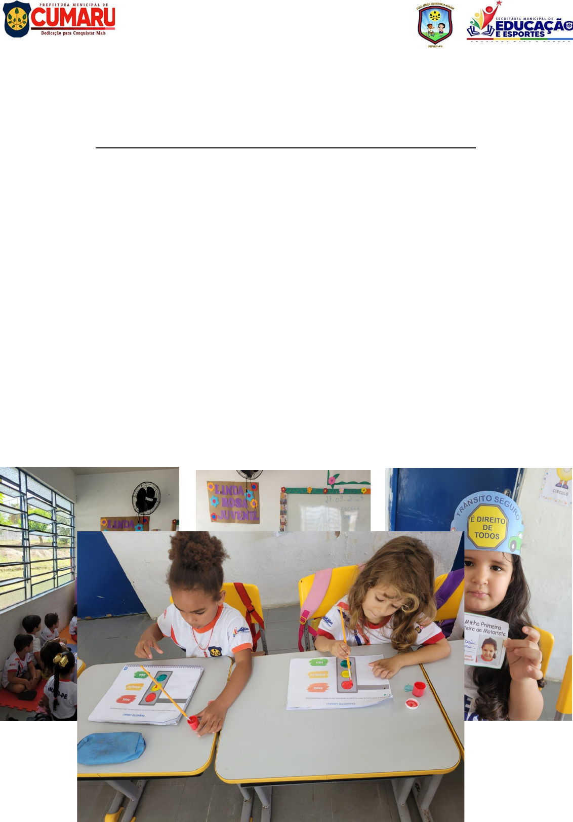 PREFEITURA MUNICIPAL DE CUMARU SECRETARIA MUNICIPAL DE EDUCAÇÃO C. E. I. JÚLIA FRANCISCA GOMES C.E.I Júlia Francisca Gomes Diretora: Jane Gomes Coordenadora: Fátima Souza Michelle Araújo Relatório de vivência da Semana do Trânsito na Educação Infantil Entre os dias 25/09/23 à 28/09/23 foi vivenciado no Centro de Educação Infantil Júlia Francisca Gomes, a Semana Nacional do Trânsito, onde as professoras e auxiliares das turmas de Jardim I (A e B) e Jardim II (A e B) executaram com os alunos algumas atividades que serão descritas abaixo. Jardim I “ A” Profª Josélia Lopes Auxiliar: Josefa Drielly Falou-se sobre a importância dos sinais, das placas de trânsito, a circulação de veículos e pessoas. E foi trabalhado no livro didático: Conexão com o Eu, o Outro e Nós... Trânsito Legal, nas páginas 46 à 49. Vídeos: Leis de Trânsito (Conto contos) e Dirigindo meu carro( Xuxa), dramatização ( atravessando na faixa de Pedestres), Desenhos espontâneos e pinturas. Jardim I “ B” Profª Severina Barbosa Auxiliar: Jane Santos Falou-se sobre a importância dos sinais, das placas de trânsito, a circulação de veículos e pessoas. E foi trabalhado no livro didático: Conexão com o Eu, o Outro e Nós... Trânsito Legal, nas páginas 46 à 49. Vídeos: Leis de Trânsito (Conto contos) e Dirigindo meu carro( Xuxa), dramatização ( atravessando na faixa de Pedestres), Desenhos espontâneos e pinturas. Jardim II “ A” Profº Ana Carla Auxiliar: Barbara Suellen Foi desenvolvido a Conscientização da segurança no trânsito, importância do uso do cinto de segurança, atenção ao atravessar a rua na faixa de pedestre, cores do semáforo e seu significado, atividade sobre o semáforo, e história sobre o carro Vrum. Jardim II “ B” Profª: Josineide Claudina Auxiliar: Luzia Rita Desenvolveu-se um projeto que teve como objetivo, conscientizar sobre as normas do trânsito, levantar hipóteses sobre os conhecimentos prévios das crianças sobre o trânsito, onde foi citado por eles: Motos, carros, faixa de pedestre e sinais. Abordou-se o reconhecimento das cores do semáforo, as virtudes da tolerância, paciência, atenção e responsabilidade. Trabalhou-se a construção de um semáforo, pista de pedestres, música sobre a atenção no trânsito na sala de aula, para o reconhecimento das cores e seus significados e também foi confeccionado viseiras para finalização das atividades. image5.jpeg image6.jpeg image7.jpeg image8.jpeg image9.jpeg image10.jpeg image11.jpeg image12.jpeg image13.jpeg image14.jpeg image15.jpeg image16.jpeg image17.jpeg image18.png image1.jpeg image2.png image3.png image4.jpeg