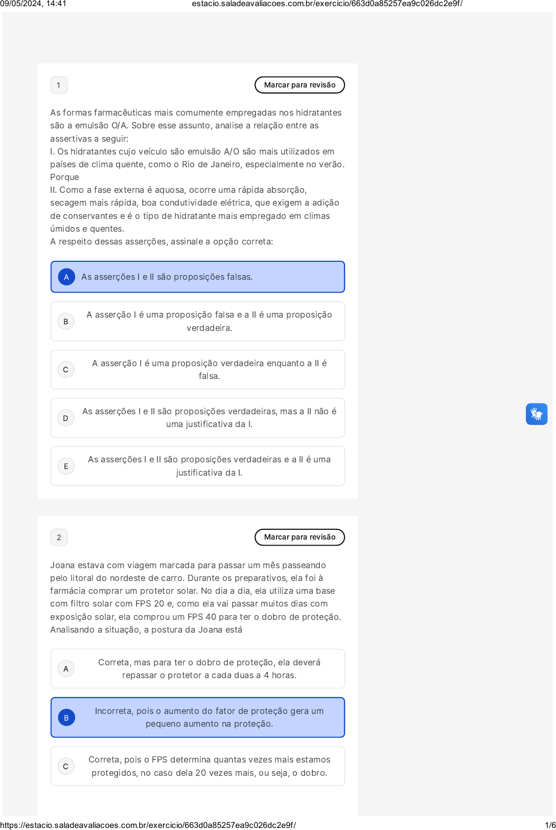 A B C D E A B C 1 Marcar para revisão As formas farmacêuticas mais comumente empregadas nos hidratantes são a emulsão O/A. Sobre esse assunto, analise a relação entre as assertivas a seguir: I. Os hidratantes cujo veículo são emulsão A/O são mais utilizados em países de clima quente, como o Rio de Janeiro, especialmente no verão. Porque II. Como a fase externa é aquosa, ocorre uma rápida absorção, secagem mais rápida, boa condutividade elétrica, que exigem a adição de conservantes e é o tipo de hidratante mais empregado em climas úmidos e quentes. A respeito dessas asserções, assinale a opção correta: As asserções I e II são proposições falsas. A asserção I é uma proposição falsa e a II é uma proposição verdadeira. A asserção I é uma proposição verdadeira enquanto a II é falsa. As asserções I e II são proposições verdadeiras, mas a II não é uma justificativa da I. As asserções I e II são proposições verdadeiras e a II é uma justificativa da I. 2 Marcar para revisão Joana estava com viagem marcada para passar um mês passeando pelo litoral do nordeste de carro. Durante os preparativos, ela foi à farmácia comprar um protetor solar. No dia a dia, ela utiliza uma base com filtro solar com FPS 20 e, como ela vai passar muitos dias com exposição solar, ela comprou um FPS 40 para ter o dobro de proteção. Analisando a situação, a postura da Joana está Correta, mas para ter o dobro de proteção, ela deverá repassar o protetor a cada duas a 4 horas. Incorreta, pois o aumento do fator de proteção gera um pequeno aumento na proteção. Correta, pois o FPS determina quantas vezes mais estamos protegidos, no caso dela 20 vezes mais, ou seja, o dobro. 09/05/2024, 14:41 estacio.saladeavaliacoes.com.br/exercicio/663d0a85257ea9c026dc2e9f/ https://estacio.saladeavaliacoes.com.br/exercicio/663d0a85257ea9c026dc2e9f/ 1/6 D E A B C D E Incorreta, pois como ela vai ficar muito exposta ao sol deveria usar um protetor com FPS 100% que garante 100% de proteção contra os raios UV. Correta, mas para ter a proteção ela não pode entrar na água, pois os protetores solares com mais de FPS superior a 20 não são resistentes à água. 3 Marcar para revisão �UFRN/ 2012 � adaptada) Em um artigo publicado, os autores relatam que uma determinada base cosmética acrescida de 4,0 % (p/p) de dióxido de titânio foi submetida a testes específicos para determinação in vivo do fator de proteção solar �FPS�. O resultado acusou FPS 8,0. Pode-se dizer que quaisquer bases cosméticas acrescidas de 4% (p/p) de dióxido de titânio terão FPS� 8,0. Com base na afirmativa acima, marque a alternativa que indica se a afirmativa é correta ou não e que apresenta uma justificativa. Não, pois o FPS altera com a técnica de preparação realizada ou pela substituição dos componentes da formulação. Não, pois o FPS deveria ser medido em triplicata para afirmar o valor de proteção. Sim, mas uma vez determinado o FPS, o valor deve ser avaliado sempre durante o controle de qualidade com uma amostra representativa do lote de 10%. Sim, pois uma vez determinado o FPS, este não varia, mesmo trocando a técnica ou substituindo um dos componentes da formulação. Sim, mas além do FPS deveria ser testado também o FP�UVA, segundo a RDC nº30/2012. 4 Marcar para revisão �VUNESP /Prefeitura de Ferraz de Vasconcelos/SP/2018� O Fator de Proteção Solar �FPS� presente nos protetores solares aumenta o tempo que a pele fica protegida dos raios solares. Por exemplo, uma pele que leva dez minutos para sofrer os efeitos do sol, ao passar protetor solar com FPS 15, fica protegida por 15 vezes aquele tempo, nesse caso, 150 minutos. Considere uma pessoa cuja pele sem proteção sofre os efeitos do sol após 18 minutos. Ao fazer uso de um protetor solar de FPS 25, ela terá sua pele protegida dos efeitos do sol por até: 09/05/2024, 14:41 estacio.saladeavaliacoes.com.br/exercicio/663d0a85257ea9c026dc2e9f/ https://estacio.saladeavaliacoes.com.br/exercicio/663d0a85257ea9c026dc2e9f/ 2/6 A B C D E A B C D E 6 horas e 50 minutos. 4 horas e 50 minutos. 5 horas e 50 minutos. 5 horas e 10 minutos. 7 horas e 30 minutos. 5 Marcar para revisão Joana foi a uma consulta com um farmacêutico estético e passou pela anamnese. Durante a consulta, o farmacêutico perguntou à paciente qual era sua queixa clínica. A paciente relatou que a pele apresentava prurido, sensação de repuxamento após o banho, descamação e áreas de rachadura e vermelhidão, e sem áreas de oleosidade no rosto. A partir dessas características, como o farmacêutico classificou a pele da Joana? Marque a alternativa que apresenta essa classificação e a formulação mais indicada. Pele oleosa e emulsão O/A. Pele mista e emulsão A/O. Pele oleosa e gel à base de água. Pele mista e sérum. Pele seca e gel à base de óleo. 6 Marcar para revisão Joana foi a uma consulta com um farmacêutico estético e passou pela anamnese. Durante a consulta, o farmacêutico perguntou à paciente qual era sua queixa clínica. A paciente relatou que a pele apresentava muita oleosidade, ficava brilhosa e apresentava poros dilatados às vezes obstruídos e a presença de acnes. Sobre a situação problema, analise a relação entre as assertivas a seguir: I. O farmacêutico explicou para Joana que mesmo a pele oleosa precisava ser higienizada com água abundante e quente. Porque II. Na assepsia da pele oleosa é utilizada água em abundância, de preferência quente, pois a água gelada acelera a produção da 09/05/2024, 14:41 estacio.saladeavaliacoes.com.br/exercicio/663d0a85257ea9c026dc2e9f/ https://estacio.saladeavaliacoes.com.br/exercicio/663d0a85257ea9c026dc2e9f/ 3/6 A B C D E A B C D E oleosidade. A respeito dessas asserções, assinale a opção correta: As asserções I e II são proposições falsas. A asserção I é uma proposição verdadeira enquanto a II é falsa. As asserções I e II são pr