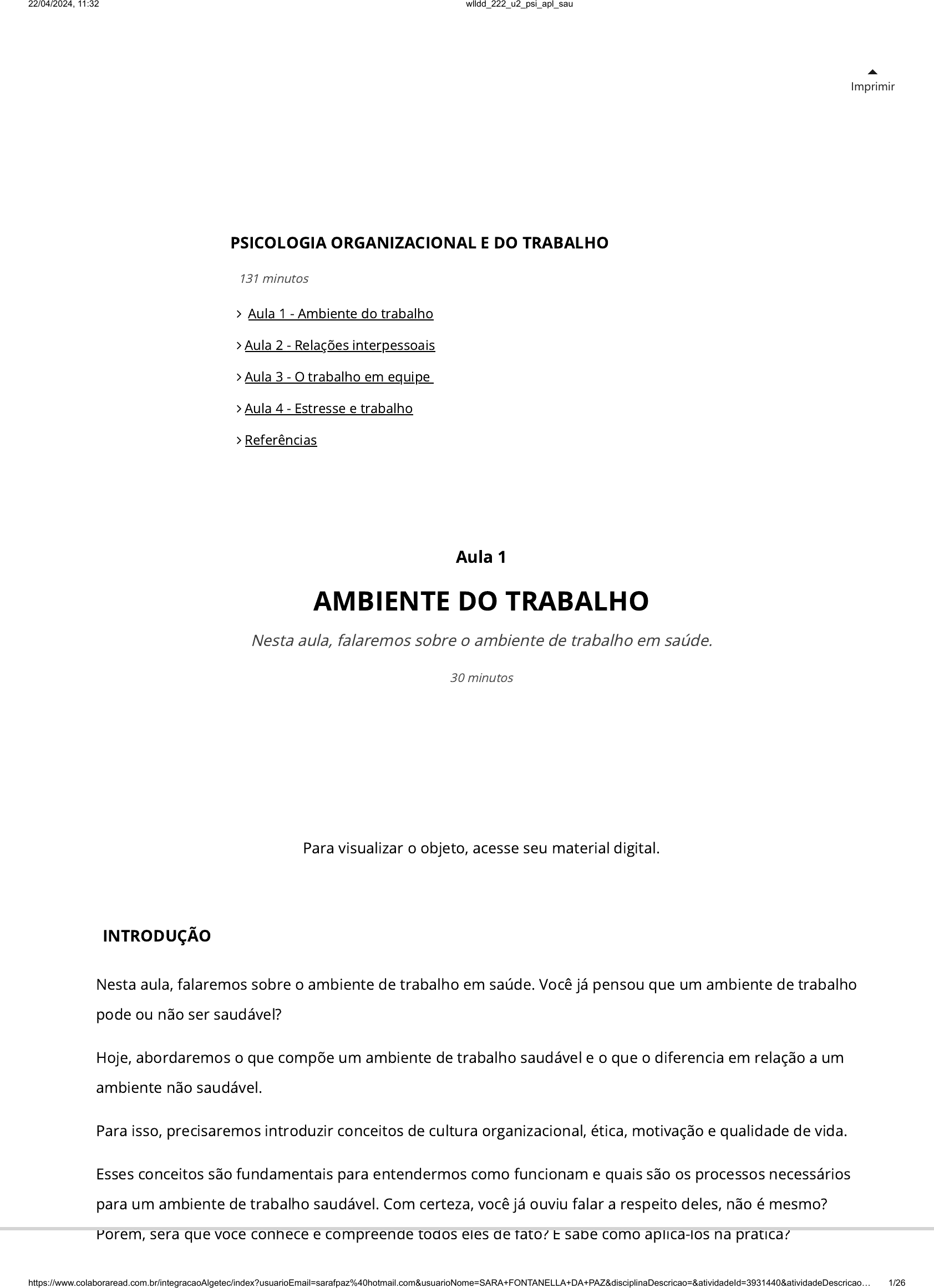 Imprimir INTRODUÇÃO Nesta aula, falaremos sobre o ambiente de trabalho em saúde. Você já pensou que um ambiente de trabalho pode ou não ser saudável? Hoje, abordaremos o que compõe um ambiente de trabalho saudável e o que o diferencia em relação a um ambiente não saudável. Para isso, precisaremos introduzir conceitos de cultura organizacional, ética, motivação e qualidade de vida. Esses conceitos são fundamentais para entendermos como funcionam e quais são os processos necessários para um ambiente de trabalho saudável. Com certeza, você já ouviu falar a respeito deles, não é mesmo? Porém, será que você conhece e compreende todos eles de fato? E sabe como aplicá-los na prática? Para visualizar o objeto, acesse seu material digital. Aula 1 AMBIENTE DO TRABALHO Nesta aula, falaremos sobre o ambiente de trabalho em saúde. 30 minutos PSICOLOGIA ORGANIZACIONAL E DO TRABALHO Aula 1 - Ambiente do trabalho Aula 2 - Relações interpessoais Aula 3 - O trabalho em equipe Aula 4 - Estresse e trabalho Referências 131 minutos 22/04/2024, 11:32 wlldd_222_u2_psi_apl_sau https://www.colaboraread.com.br/integracaoAlgetec/index?usuarioEmail=sarafpaz%40hotmail.com&usuarioNome=SARA+FONTANELLA+DA+PAZ&disciplinaDescricao=&atividadeId=3931440&atividadeDescricao… 1/26 Vamos lá aprender um pouco sobre isso? AMBIENTE DE TRABALHO SAUDÁVEL Acredito que você já saiba o que é um ambiente de trabalho. Mas, caso nunca tenha pensado nisso, vamos lá? Ambiente de trabalho é o lugar onde estamos quando estamos trabalhando, seja em algum hospital, escritório, em casa (o que tem ocorrido muito ultimamente, o chamado home o�ce). Você saberia dizer o que é um ambiente de trabalho saudável? Você consegue imaginar como isso poderia ser reconhecido? Se pensou na qualidade desse ambiente, acertou. Entretanto, você sabe dizer a que se refere esta qualidade? Um ambiente saudável de trabalho tem a ver com a condição desse espaço, como um todo, para o trabalho, por exemplo: Espaço físico: • Iluminação. • Ruídos. • Temperatura. • Ferramentas necessárias (mobiliário, material de escritório etc.). Recursos Humanos: • Benefícios (alimentação, saúde, transporte). • Salário. • Carga horária. Espaço relacional (colegas, che�a, usuário): • Bons relacionamentos interpessoais. • Boa comunicação. • Sensação de pertencimento. • Regras das relações. Aqui, focaremos mais na questão dos relacionamentos para compreender esta qualidade do ambiente de trabalho e ampliar os conceitos que interferirão nesses aspectos. Para isso, utilizaremos os conceitos de cultura organizacional, ética, motivação e qualidade de vida. Acredito que nesse momento você deve estar se perguntando o que é a cultura organizacional. Ela pode ser chamada de cultura organizacional, empresarial ou corporativa e diz respeito aos termos que de�nirão o conjunto de hábitos e crenças, por meio de normas, valores, expectativas e atitudes compartilhadas entre 22/04/2024, 11:32 wlldd_222_u2_psi_apl_sau https://www.colaboraread.com.br/integracaoAlgetec/index?usuarioEmail=sarafpaz%40hotmail.com&usuarioNome=SARA+FONTANELLA+DA+PAZ&disciplinaDescricao=&atividadeId=3931440&atividadeDescricao… 2/26 todos os integrantes de uma empresa. Com isso, estamos pensando também no conceito de ética. Você já deve ter ouvido diversas vezes esta palavra, mas você sabe de�ni-la? A ética tem origem no grego ethos, que signi�ca, “morada”, “habitat”, “refúgio”, ou seja, o ambiente das pessoas. Segundo o dicionário, ética é um “conjunto de princípios, valores e normas morais e de conduta de um indivíduo ou de grupo social ou de uma sociedade” (ÉTICA, 2022, [s. p.]). Logo, entendemos que a ética tem a ver com os valores regidos pelas normas do ambiente no qual estamos inseridos, por exemplo, a sociedade. São as regras de relação estabelecidas por meio das normas sociais, o que é considerado correto e o que não é, e o que se deve ou não fazer dentro de determinado espaço. Até o momento entendemos sobre ambiente de trabalho, cultura organizacional e ética, mas será que entendemos como mantê-lo saudável? Para isso, precisamos pensar na motivação dos funcionários. Motivação é o ato ou efeito de motivar, de despertar o interesse por algo (MOTIVAÇÃO, 2022), ou seja, os funcionários precisam se sentir interessados, motivados, para responderem bem ao ambiente de trabalho. E você consegue compreender o que isso gerará? Se pensou em qualidade de vida, acertou! Portanto, quando pensamos em um ambiente saudável de trabalho, estamos imaginando um espaço pautado pelos princípios da ética, sempre visando a maior motivação dos funcionários e, por tabela, uma melhor qualidade de vida. O QUE É NECESSÁRIO SABER PARA UM AMBIENTE DE TRABALHO SAUDÁVEL? Para compreendermos mais a fundo o que seria um ambiente de trabalho saudável, precisamos entender melhor sobre cultura organizacional, ética, motivação e qualidade de vida. A cultura organizacional deriva do comportamento organizacional, já que as organizações são compostas por pessoas, e o modo como essas pessoas se comportam pode afetar diretamente as organizações. Para uma relação saudável, precisamos que esses comportamentos e a organização estejam em sintonia, assim, ambas as partes se bene�ciam (CHIAVENATO, 2010). Como essa cultura é constituída? Quem começa uma organização (os fundadores dela, por exemplo) traz para a empresa seus valores e o tipo de trabalho em que acredita. Por conta desses valores, começa a escolher qual tipo de pro�ssional contratará e, ainda, como enxerga a relação da organização com o mundo externo. Logo, essas escolhas de novos pro�ssionais trazem mais crenças e valores que serão somados à organização inicial. E assim começa a construção da rede de escolhas e interações dentro da organização, formando uma cultura singular daquela organiza