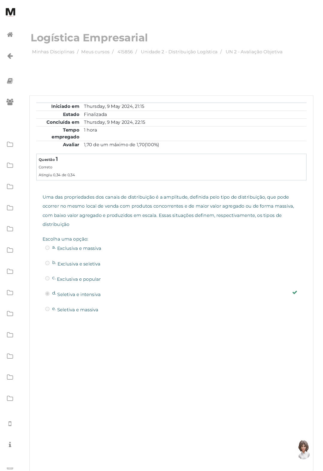 Minhas Disciplinas / Meus cursos / 415856 / Unidade 2 - Distribuição Logística / UN 2 - Avaliação Objetiva Logística Empresarial Iniciado em Thursday, 9 May 2024, 21:15 Estado Finalizada Concluída em Thursday, 9 May 2024, 22:15 Tempo empregado 1 hora Avaliar 1,70 de um máximo de 1,70(100%) Questão 1 Correto Atingiu 0,34 de 0,34 Uma das propriedades dos canais de distribuição é a amplitude, de�nida pelo tipo de distribuição, que pode ocorrer no mesmo local de venda com produtos concorrentes e de maior valor agregado ou de forma massiva, com baixo valor agregado e produzidos em escala. Essas situações de�nem, respectivamente, os tipos de distribuição Escolha uma opção: a. Exclusiva e massiva b. Exclusiva e seletiva c. Exclusiva e popular d. Seletiva e intensiva e. Seletiva e massiva https://avap.multivix.edu.br/my/ https://avap.multivix.edu.br/course/view.php?id=26212 https://avap.multivix.edu.br/course/view.php?id=26212§ion=3 https://avap.multivix.edu.br/mod/quiz/view.php?id=1633092 https://avap.multivix.edu.br/my/ https://avap.multivix.edu.br/course/view.php?id=26212 https://avap.multivix.edu.br/user/index.php?id=26212 https://avap.multivix.edu.br/course/view.php?id=26212§ion=1 https://avap.multivix.edu.br/course/view.php?id=26212§ion=2 https://avap.multivix.edu.br/course/view.php?id=26212§ion=3 https://avap.multivix.edu.br/course/view.php?id=26212§ion=4 https://avap.multivix.edu.br/course/view.php?id=26212§ion=5 https://avap.multivix.edu.br/course/view.php?id=26212§ion=6 https://avap.multivix.edu.br/course/view.php?id=26212§ion=7 https://avap.multivix.edu.br/course/view.php?id=26212§ion=8 https://avap.multivix.edu.br/course/view.php?id=26212§ion=9 https://avap.multivix.edu.br/course/view.php?id=26212§ion=10 https://avap.multivix.edu.br/course/view.php?id=26212§ion=11 https://avap.multivix.edu.br/course/view.php?id=26212§ion=12 https://avap.multivix.edu.br/course/view.php?id=26212§ion=13 https://avap.multivix.edu.br/hooks/portal/ https://avap.multivix.edu.br/mod/page/view.php?id=1252%2F%22%20target%3D%22_blank https://avap.multivix.edu.br/calendar/view.php/ https://avap.multivix.edu.br/ https://avap.multivix.edu.br/ https://avap.multivix.edu.br/ https://avap.multivix.edu.br/ Questão 2 Correto Atingiu 0,34 de 0,34 Questão 3 Correto Atingiu 0,34 de 0,34 A logística deve garantir que os produtos estejam disponíveis no prazo desejado pelo cliente para satisfazer sua necessidade ao menor custo possível e isso inclui a distribuição. Podemos de�nir distribuição como I – o planejamento de transporte e entregas II – o processo que envolve estocagem, fabricação, processamento de pedidos e entrega, a�m de satisfazer o cliente III – o processo de entrega dos produtos fabricados ao cliente IV – o processo de movimentação, estocagem e processamento de pedidos para agregar valor ao cliente É correto o que se a�rma em Escolha uma opção: a. I, apenas b. I e II, apenas c. III, apenas d. I e III, apenas e. IV, apenas. A oferta de soluções de tecnologia tem alterado o relacionamento entre produtores e clientes �nais. Atualmente os clientes têm acesso aos fabricantes por meio da internet e muitos produtores oferecem produtos para compra online. Esta realidade contrasta o modelo tradicional que distribuição, que era formado pela Escolha uma opção: a. oferta de produtos e mercadorias disponíveis de forma direta ao cliente �nal. b. existência de uma rede de vários tipos de intermediários: distribuidores, representantes, varejistas, agentes. c. falta necessidade de intermediários quando a compra era feita de fabricantes locais, o que dispensava a armazenagem. d. venda por meio de representantes do fornecedor. e. oferta de produtos e mercadorias por meio de estoques centralizados. https://avap.multivix.edu.br/my/ https://avap.multivix.edu.br/course/view.php?id=26212 https://avap.multivix.edu.br/user/index.php?id=26212 https://avap.multivix.edu.br/course/view.php?id=26212§ion=1 https://avap.multivix.edu.br/course/view.php?id=26212§ion=2 https://avap.multivix.edu.br/course/view.php?id=26212§ion=3 https://avap.multivix.edu.br/course/view.php?id=26212§ion=4 https://avap.multivix.edu.br/course/view.php?id=26212§ion=5 https://avap.multivix.edu.br/course/view.php?id=26212§ion=6 https://avap.multivix.edu.br/course/view.php?id=26212§ion=7 https://avap.multivix.edu.br/course/view.php?id=26212§ion=8 https://avap.multivix.edu.br/course/view.php?id=26212§ion=9 https://avap.multivix.edu.br/course/view.php?id=26212§ion=10 https://avap.multivix.edu.br/course/view.php?id=26212§ion=11 https://avap.multivix.edu.br/course/view.php?id=26212§ion=12 https://avap.multivix.edu.br/course/view.php?id=26212§ion=13 https://avap.multivix.edu.br/hooks/portal/ https://avap.multivix.edu.br/mod/page/view.php?id=1252%2F%22%20target%3D%22_blank https://avap.multivix.edu.br/calendar/view.php/ https://avap.multivix.edu.br/ https://avap.multivix.edu.br/ https://avap.multivix.edu.br/ https://avap.multivix.edu.br/ Questão 4 Correto Atingiu 0,34 de 0,34 Questão 5 Correto Atingiu 0,34 de 0,34 Uma empresa produtora pode ter a estratégia de não possuir uma estrutura própria de distribuição e fazer a contratação de uma empresa prestadora de serviços que cubra toda a logística nacional e/ou internacional, atuando nos processos de transporte, armazenagem, processamento e entrega dos pedidos, oferecendo toda a estrutura e suporte necessários para o cumprimento dos prazos e a integridade das mercadorias. Esse tipo de empresa é chamado de Escolha uma opção: a. Operador logístico b. Representantes comerciais c. Transportadora logística d. Prestador de serviços intermediários e. Distribuidores e varejistas Uma empresa fabricantes de produtos consumidos em todo o território nacional reestruturou seu sistema de distribuição, construindo um hub, onde os produtos de fabricação própria e de empresas parceiras serão recebidos, armazenados, montados, 