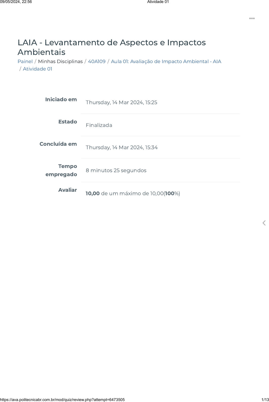 Painel / Minhas Disciplinas / 40A109 / Aula 01: Avaliação de Impacto Ambiental - AIA / Atividade 01 LAIA - Levantamento de Aspectos e Impactos Ambientais Iniciado em Thursday, 14 Mar 2024, 15:25 Estado Finalizada Concluída em Thursday, 14 Mar 2024, 15:34 Tempo empregado 8 minutos 25 segundos Avaliar 10,00 de um máximo de 10,00(100%) 09/05/2024, 22:56 Atividade 01 https://ava.politecnicabr.com.br/mod/quiz/review.php?attempt=6473505 1/13 https://ava.politecnicabr.com.br/my/ https://ava.politecnicabr.com.br/my/ https://ava.politecnicabr.com.br/course/view.php?id=1155 https://ava.politecnicabr.com.br/course/view.php?id=1155#section-2 https://ava.politecnicabr.com.br/mod/quiz/view.php?id=33823 https://ava.politecnicabr.com.br/ Questão 1 Correto Atingiu 1,00 de 1,00 Assinale assinale ( V ) Verdadeiro ou ( F ) Falso: ( ) A AIA deve ser adotado em toda a implantação do empreendimento, ou seja, antes, durante e depois, principalmente em relação a impactos que possam causar efeitos adversos signi�cativos no meio ambiente, observando-se sempre que o homem é parte integrante desse contexto, no qual os fatores socioeconômicos também devem ser relevados. ( ) Os representantes dos poderes públicos, em especial os ligados aos órgãos ambientais, os pro�ssionais multidisciplinares envolvidos, os setores produtivos e a comunidade interessada devem trabalhar em conjunto para a avaliação e análise conclusiva dos relatórios, com total transparência, imparcialidade, equidade e informação, claro, dentro de uma participação legalizada, organizada e coerente com a importância de cada segmento. ( ) O Estado e os órgãos reguladores têm participação importante no processo, devendo organizar administrativamente os trabalhos, começando pelos aspectos legais, com a criação e aplicação de procedimentos de �scalização ambiental das atividades e empreendimentos impactantes, além de treinar equipes multidisciplinares para a elaboração do EIA/RIMA. ( ) Entre os fatores obrigatórios a serem estudados, para a posterior avaliação dos impactos ambientais e, com isso, a procura de alternativas de prevenção viáveis, estão os seguintes itens: qualidade do ar; ruído; geologia; geomorfologia; recursos hídricos; solos; meio biótico; hidrogeologia. ( ) a Constituição Federal em seu artigo 23, determina princípios para o seu cumprimento pelos entes federativos (União, Distrito Federal, Estado e Municípios). Entre eles estão: proteger o meio ambiente e combater a poluição em qualquer de suas formas. Escolha uma opção: a. V, V, V, V, V b. V, V, F, V, V 09/05/2024, 22:56 Atividade 01 https://ava.politecnicabr.com.br/mod/quiz/review.php?attempt=6473505 2/13 https://ava.politecnicabr.com.br/ Questão 2 Correto Atingiu 1,00 de 1,00 A diferença básica entre a AAI e a AAE, é que a primeira destina-se principalmente à análise da gestão ambiental e de cenários futuros dos impactos nas bacias hidrográ�cas, e a segunda, na gestão dos recursos naturais de um território; porém, são constituídas da mesma essência, ou seja, focadas na avaliação dos impactos cumulativos e simultâneos de políticas, planos e programas de desenvolvi- mento ambiental. Com relação ao texto, assinale ( V ) Verdadeiro ou ( F ) Falso: Escolha uma opção: c. V, V, F, V, F d. F, V, F, V, V e. V, F, F, V, V Verdadeiro Falso 09/05/2024, 22:56 Atividade 01 https://ava.politecnicabr.com.br/mod/quiz/review.php?attempt=6473505 3/13 https://ava.politecnicabr.com.br/ Questão 3 Correto Atingiu 1,00 de 1,00 No caso de omissão da autoridade estadual ou municipal, caberá ao Secretário do Meio Ambiente a aplicação das penalidades pecuniárias previstas neste artigo. Como também nos casos previstos nos incisos II e III deste artigo, o ato declaratório da perda, restrição ou suspensão será atribuição da autoridade administrativa ou �nanceira que concedeu os benefícios, incentivos ou �nanciamento, cumprindo resolução do Conama. Na aplicação da responsabilidade civil e criminal, por danos causados ao meio ambiente, assinale a alternativa correta a quem compete. Escolha uma opção: a. Ao poder judiciário através do Ministério Público da União e dos Estados. b. Ao poder judiciário através do Tribunal de Justiça em 1º Instância, como também ao poder de polícia judiciária dos órgãos ambientais. c. Ao poder judiciário através do do Ministério Público da União e dos Estados, como também através do poder de polícia judiciária dos órgãos ambientais. d. Somente ao poder judiciário através do Tribunal de Justiça em 1º Instância. 09/05/2024, 22:56 Atividade 01 https://ava.politecnicabr.com.br/mod/quiz/review.php?attempt=6473505 4/13 https://ava.politecnicabr.com.br/ Questão 4 Correto Atingiu 1,00 de 1,00 Apesar de haver um projeto de lei (PL nº 4.996/2013) em trâmite no congresso, que visa tornar a mais um instrumento da Lei nº 6.938/81 (Política Nacional do Meio Ambiente), ainda não há uma força legal que obrigue sua aplicação; porém, o Ministério do Meio Ambiente (MMA), por meio de sua Secretaria de Qualidade Ambiental nos Assentamentos Humanos (SQA), estabeleceu algumas diretrizes a serem seguidas para o aprimoramento dos aspectos técnicos, administrativos e políticos da gestão ambiental pública do país: Conforme o texto introdutório, assinale a alternativa ao qual o texto se refere: Escolha uma opção: a. Avaliação Ambiental Estratégia. b. Estudo de Impacto Ambiental e Relatório de Impacto Ambiental. c. Avaliação de Impacto Estratégica. d. Ao Licenciamento Ambiental de atividades de impactos locais. 09/05/2024, 22:56 Atividade 01 https://ava.politecnicabr.com.br/mod/quiz/review.php?attempt=6473505 5/13 https://ava.politecnicabr.com.br/ Questão 5 Correto Atingiu 1,00 de 1,00 A AIA, como instrumento da gestão ambiental, segue diretrizes que a permita abranger os vários aspectos de composição na detecção dos impactos, tendo como ob