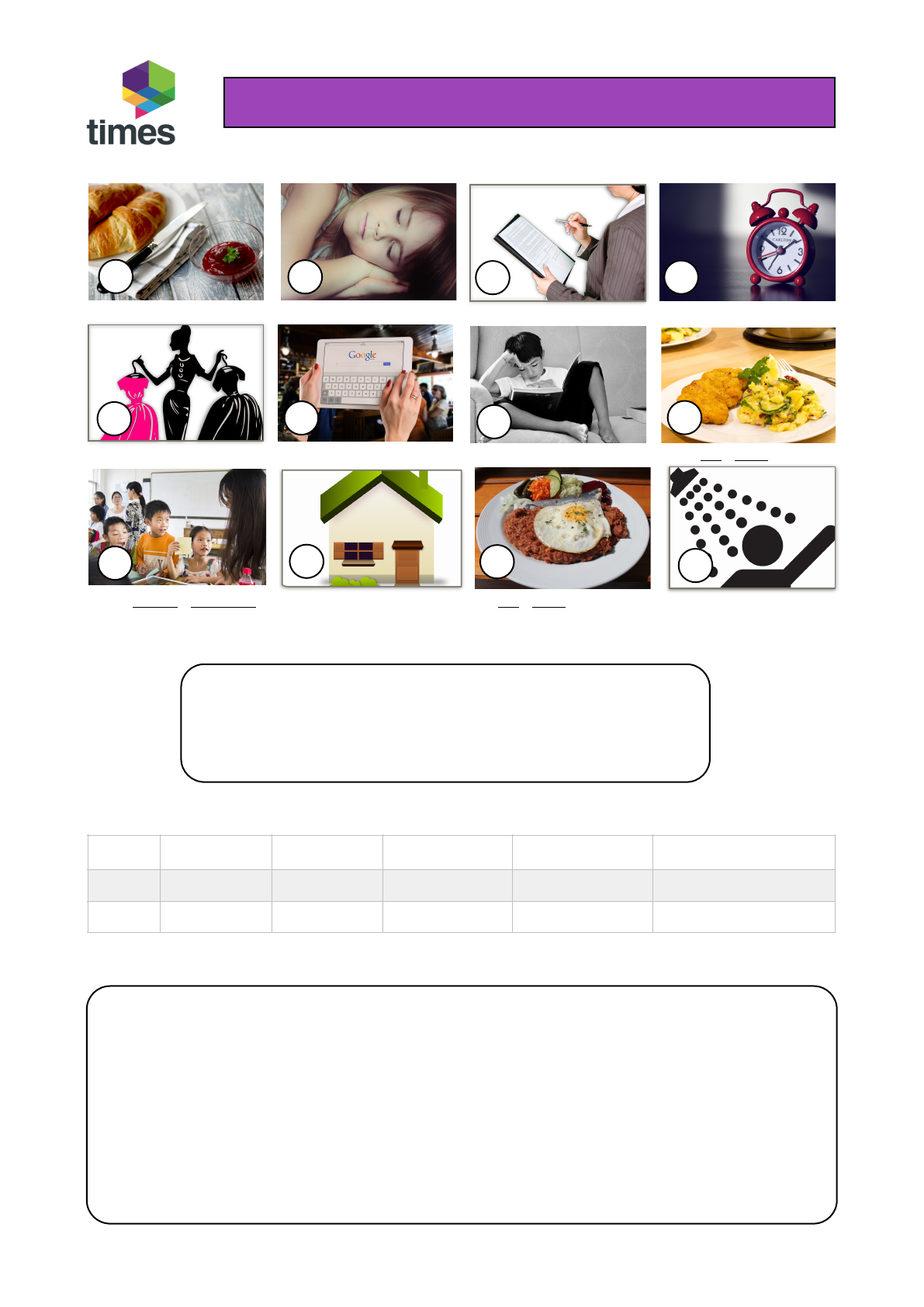 1. Put the activities in order from 1 - 12 to describe your daily routine to your teacher. 2. Listening 1 - Stuart and Colleen are talking. Choose the correct option. Stuart and Colleen are ____________________________. ( ) making vacation plans. ( ) talking about their weekend schedules. ( ) spending time with their friends. 3. Listening 1 - Listen again and check (✔) the things Colleen and Stuart do on the weekend. 4. Listening 2 - Listen to the conversation and complete the gaps with sentences. Shannon: Hey, Stuart. How’s it going? Stuart: _______________________________ Shannon: What’s wrong? Stuart: ____________________________________. Colleen and I never spend time together. Shannon: Well, she works at night. Stuart: Yes, but on the weekend, she always _______________________________________. And she never helps with the housework. Shannon: Really? Stuart: Yeah, I always ____________________________. It’s not fair. Listening Activity adapted from: World Link Intro, pages: 91 and 92, Thompson - CD 2 - tracks 20 and 24 Start 7 - Daily Routine eat breakfast sleep work from: 9 a.m to 5 p.m get up get dressed surf on the net study eat / have dinner go to school / university get home eat / have lunch take a shower works all day gets up late goes shopping goes to the gym hangs out with friends Colleen Stuart