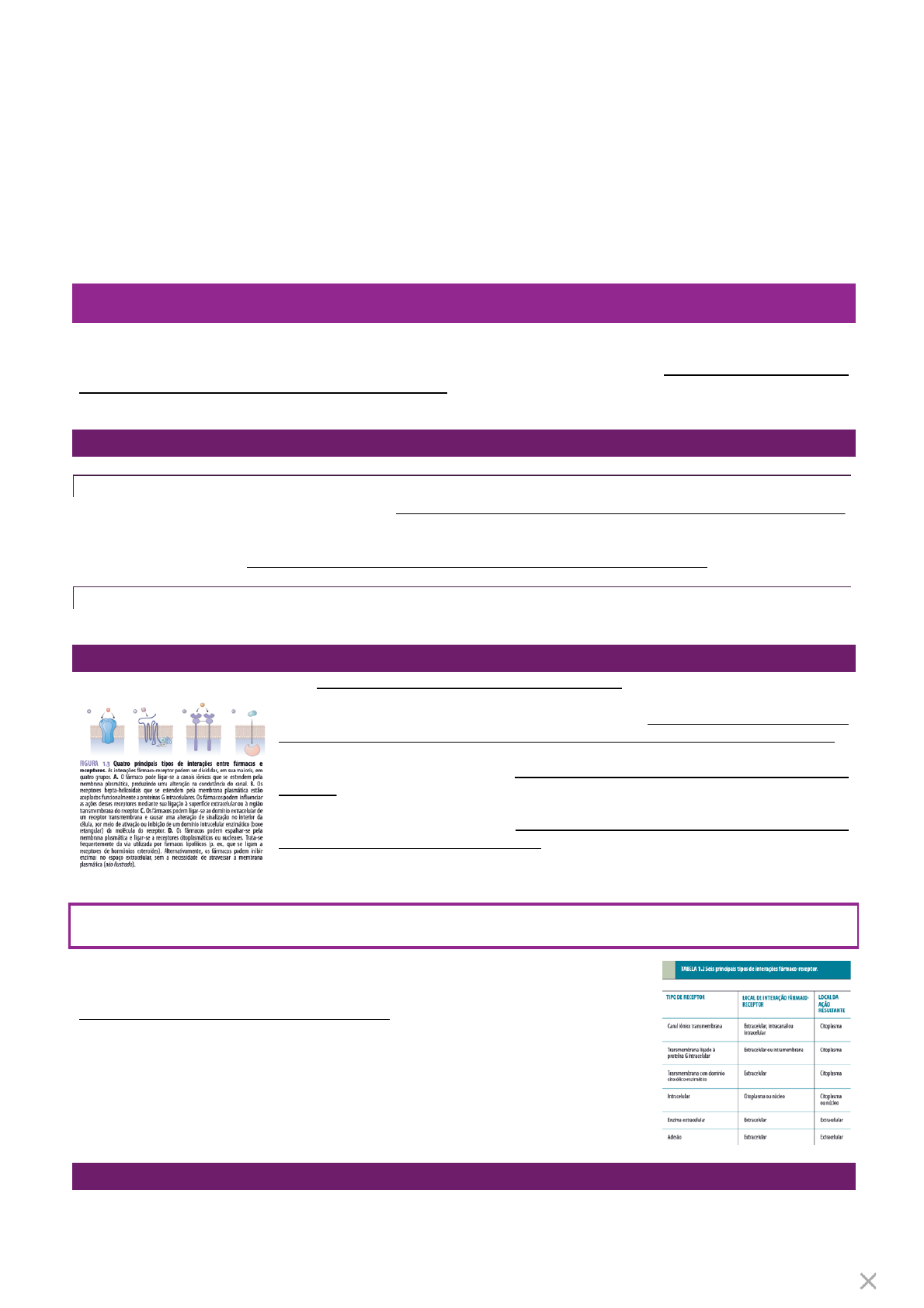 GERAL As moléculas dos fármacos precisam exercer alguma influência química sobre ou mais constituintes das células para produzir uma resposta farmacológica. O número de moléculas do organismo excede as moléculas do fármaco, sendo necessário que elas sejam distribuídas de forma não uniforme, ligando-se a constituintes específicos de células ou tecidos para produzir efeito. CORPORA NON AGUNT NISI FIXATA (um fármaco não agira, a menos que esteja ligado). FÁRMACOS DIFERENTES (SEM RECEPTOR-ALVO) DIURÉTICOS OSMÓTICOS Controlam equilíbrio hídrico no corpo, alterando níveis de absorção e secreção de água e íons nos rins. Uma classe de diuréticos altera o equilíbrio de água e dos íons pela modificação direta da osmolaridade nos néfrons. O manitol, secretado no lúmen do néfron, aumenta a osmolaridade da urina para ser removida do sangue peritubular para o lúmen, aumentando o volume de urina e diminuindo o volume sanguíneo. ANTIÁCIDOS Atuam de modo inespecíficos ao absorver o ácido gástrico ou neutralizá-lo quimicamente. IMPACTO DA LIGAÇÃO DO FÁRMACO AO RECEPTOR No sítio ativo ocorre uma transformação enzimática que é catalisada. Depois a atividade catalítica da enzima é inibida por fármacos que impedem a ligação do substrato ao sítio que se modificam de modo covalente. Podendo ocorrer uma mudança na conformação do receptor, alterando função e aumentando afinidade do fármaco com o receptor – adaptação induzida - podendo ser análoga à ligação de um ligante endógeno (insulina). Pode estar no estado inativado ou dessensibilizado (fechado) e ativo (aberto). A estrutura do fármaco determina onde a proteína localiza-se em relação aos limites celulares. As proteínas com grandes domínios hidrofóbicos residem na membrana plasmática (muito lipídio). Os reguladores da transcrição (fatores de transcrição) apresentam domínios hidrofílicos e residem no citoplasma, núcleo ou em ambos. 1. DESCREVER A ESTRUTURA, FUNCIONAMENTO E AS VIAS DE SINALIZAÇÃO DAS ENZIMAS Na membrana, proteínas quinases ou fosfatases, insulina! Estrutura de hélice. A molécula do fármaco é um substrato análogo que age como um inibidor competitivo da enzima (como a ECA – enzima conversora de angiotensina), podendo ser irreversível e não competitiva. Os inibidores de ECA impedem a conversão enzimática e reduzem a PA. Os fármacos podem agir como falsos substratos em que a molécula do fármaco sofre transformações químicas, dando origem a um produto anômalo que perturba a via metabólica normal, é um inibidor competitivo. Ademais, tem os fármacos que exigem degradação enzimática para convertê-los para a forma inativa (prófármaco). A toxicidade do fármaco resulta da conversão enzimática da molécula do fármaco para um metabólito reativo. ENZIMAS INTRACELULARES As enzimas são alvos citosólicos comuns (principalmente de fármacos lipofílicos), produzindo efeito na produção enzimática de sinalizadores críticos ou moléculas metabólicas, como os reguladores da transcrição – ou fatores de transcrição constituem alvos, sendo receptores citosólicos importantes. Como os hormônios esteroides sofrem difusão pela membrana e exerce ação mediante ligação a fatores de transcrição em citoplasma ou núcleo. A ativação ou inibição da transcrição altera as concentrações intracelulares ou extracelulares de produtos gênicos específicos. Como a transcrição gênica é um processo lento (minutos-horas), o efeito é duradouro. 2 ENZIMAS EXTRACELULARES (FORA DA MEMBRANA PLASMÁTICA) O ambiente extracelular é constituído de proteínas e moléculas de sinalização (estrutura e comunicação). RECEPTORES DE ADESÃO DA SUPERFÍCIE CELULAR As células precisam interagir com outras células para desempenhar funções ou comunicar entre elas. Como a formação dos tecidos e a migração das células imunes para um local de inflamação. A região de contato entre duas células é a adesão e as interações de adesão são mediadas pelos receptores de adesão sobre as superfícies de cada célula. Vários desses pares receptores-contra-receptor combinam-se para assegurar uma adesão firme e os reguladores intracelulares controlam a atividade dos receptores de adesão ao modificar sua afinidade ou moderar sua expressão e localização sobre a superfície celular. *integrinas: inibidores de uma classe específica de receptores de adesão. FOSFORILAÇÃO DE PROTEÍNAS (QUINASES) Realizada por quinases e fosfatases. A ligação do ligante ao receptor leva a dimerização. Permite a autofosforilação mútua de resíduos de tirosina intracelulares (são pontos de ancoragem para proteínas intracelulares). Roteinoquianases nas vias de transdução de sinal, as proteínas são substratos de quinases, em que os mecanismos de feedback e interações cruzadas das várias vias de sinalização. A- RECEPTORES COM TIROSINA QUINASES (RTK) Maior grupo de receptores transmembrana com domínios citosólicos enzimáticos, recrutando a fosforilação da tirosina de diversas moléculas sinalizadoras citosólicas. Exemplos: receptor de duas subunidades alfa extracelulares, ligadas a duas subunidades beta que atravessam a membrana. A insulina ligada as subunidades alfas mudam a conformação das subunidades beta, aproximando as subunidades beta promovendo a transfosforilação, uma subunidade beta fosforila a outra. Depois os resíduos de tirosina fosforilados atuam para recrutar outras proteínas citosólicas, conhecidas como proteínas do substrato do receptor de insulina (IRS). Elas desempenham um papel no crescimento e na diferenciação celulares, ocorre mutações de “ganho de função” nesses receptores. B- RECEPTORAS COM TIROSINA FOSFATASE Removem grupos de fosfato de resíduos de tirosina específicos. Podem constituir uma convergência de receptores. Encontrados em células imunes (regulam as atividades). C- RECEPTORES ASSOCIAD