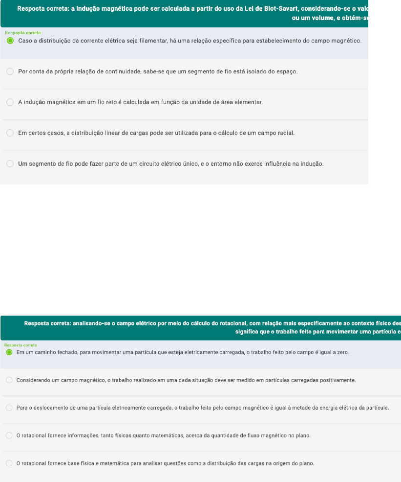 1/7 UNIDADE 01 Atividade 1 & 2 – Prova 01 - Considerando na análise fontes que não sofrem variação com o tempo, podemos considerar - ou simplesmente já utilizar, devido à situação prática estabelecida - cargas em repouso ou então que fazem algum tipo de movimento uni- forme. Tais colocações físicas estão diretamente relacionadas tanto à densidade de carga quanto à corrente elétrica cons- tante. Além disso, sabe-se que a relação de divergência é, matematicamente e na prática, nula. Com base no exposto, analise as opções e assinale a alternativa correta. 02 - Leia o excerto a seguir: “Cargas positivas geram campo com divergência positiva, ou seja, com fluxo total para fora do volume; e cargas negativas produzem campo com divergência negativa, ou seja, fluxo para dentro do volume. [...] Levando em conta o significado físico do rotacional, podemos concluir que a circulação do campo ao longo de qualquer caminho é nula.” (NOTAROS, 2012, p. 16-17) NOTAROS, B. M. Eletromagnetismo. São Paulo: Pearson Prentice Hall, 2012. Considerando essas informações, é correto afirmar que: 2/7 03 - Considere o circuito apresentado a seguir, que representa um capacitor de placas paralelas formado por um sensor capacitivo capaz de detectar ocorrências como a proximidade de um dado objeto dentro da região de análise coberta pelo sensor: A respeito desse circuito, é correto afirmar que: 3/7 04 - Leia o excerto a seguir: “[...] os franceses Jean-Baptiste Biot e Félix Savart, baseados nos resultados de Oersted, verificaram experimentalmente que a força exercida pelo campo gerado pela corrente elétrica em um fio reto sobre o polo magnético de um ímã é pro- porcional à intensidade da corrente, inversamente proporcional ao quadrado da distância perpendicular ao fio e atua na direção perpendicular ao plano que contém o fio e o ponto de atuação.” (SILVA et al., 2014, p. 19) SILVA, C. E. da et al. Eletromagnetismo: fundamentos e simulações. São Paulo, 2014. Analise as asserções a seguir e a relação proposta entre elas: I) A indução magnética, juntamente com a força magnética, pode ser reescrita a partir de uma distribuição de cargas Porque: II) A indução magnética pode ser resumida a um campo magnético com divergência nula. Assinale a alternativa correta. 05 - Os capacitores podem estar presentes nas mais diversas aplicações; um exemplo muito importante disso são os sen- sores capacitivos, utilizados para a detecção de proximidade, medições de nível, pressão etc. Além disso, os capacitores de placas paralelas podem ser utilizados para modelar uma série de relações físicas e características elétricas de proble- mas práticos, como a análise do campo elétrico, por exemplo. Assim, com base nesse texto e no seu conhecimento acerca dos capacitores, analise as afirmativas a seguir. I) A capacitância também está presente em efeitos indesejáveis, como a indução magnética. II) O sensor para a ativação do airbag de um automóvel é um exemplo de capacitor. III) Flashes de câmeras fotográficas profissionais podem ser obtidos de capacitores. IV) O capacitor é capaz de fazer o armazenamento de cargas elétricas acumuladas. Está correto o que se afirma em: 4/7 06 - Leia o excerto a seguir: “A existência de uma carga elétrica móvel, ou então de uma corrente elétrica estabelecida, gera um campo magnético nas vizinhanças, juntamente com um campo elétrico e, além disso, sabe-se que o campo magnético exerce uma dada força acerca de qualquer outra corrente elétrica ou carga elétrica que esteja se movendo, imersa neste campo magné- tico. [...]. Tal como no caso do campo elétrico, o campo magnético é um campo vetorial [...]” (YOUNG; FREEDMAN, 2009, p. 199) YOUNG, H. D.; FREEDMAN, R. A. Física 3: eletromagnetismo. Tradução: Sonia Midori Yamamoto. 12. ed. São Paulo: Pear- son Prentice Hall, 2009. Assim, com base no exposto e em seus conhecimentos acerca do campo magnético, analise as afirmativas a seguir. I) Na análise, é possível notar que a força magnética será sempre perpendicular ao plano formado pela velocidade ( ) e pelo campo magnético ( ). II) Na análise, é possível notar que a força magnética pode ser calculada pelo produto da carga, campo magnético e velo- cidade, em função do ângulo entre v e B. III) Existe sempre um único possível sentido para o vetor definido da força magnética: oposto ao plano de v com B. IV) Assim como a força elétrica, a força magnética também depende do valor da velocidade desempenhada pela partí- cula. As afirmativas corretas são: 5/7 07 - Por meio da relação matemática também conhecida como Lei de Gauss do magnetismo, é possível analisar o fluxo magnético. Um exemplo disso é que o fluxo magnético total estabelecido através de uma dada superfície fechada, de qualquer tipo e em qualquer situação, será igual a zero. Então, a seguinte relação matemática é válida , o que pode ser verificado na prática a partir do desenho de uma superfície fechada em um dado mapa de campo mag- nético qualquer. Assim, com base no exposto e em outras importantes relações do fluxo e do campo magnético, considere as afirmativas a seguir e julgue se são verdadeiras (V) ou falsas (F). I) A densidade do fluxo magnético pode ser medida. Para isso, utilizamos o próprio valor do campo magnético II) O movimento realizado por uma partícula carregada, estando esta imersa em campo magnético e sem campo elétrico, tende a variar. III) A maneira como a velocidade da partícula no campo magnético varia pode ser explicada pela perpendicularidade da força. IV) Assim como na Lei de Gauss, aplicável a uma dada superfície fechada, a área elementar diverge da superfície, conside- rando-se o vetor. Assinale a alternativa que apresenta a sequência correta. 6/7 08 - Johann Karl Friedrich Gauss, alemão, viveu entre 1777 e 1855 e foi um influente matemático 