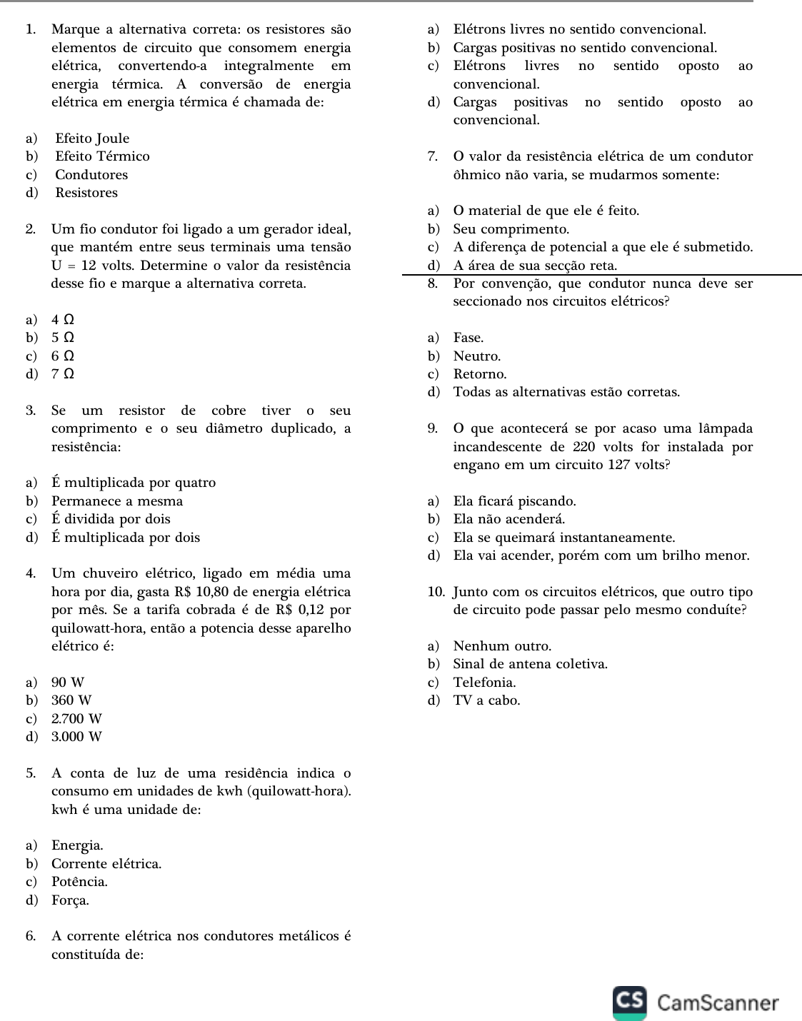 FG CURSOS TÉCNICOS NOME:____________________________________________________________________________________________ CPF _________________________ DATA: ___/___/_____ AVALIAÇÃO: ELETRICIDADE 1. Marque a alternativa correta: os resistores são elementos de circuito que consomem energia elétrica, convertendo-a integralmente em energia térmica. A conversão de energia elétrica em energia térmica é chamada de: a) Efeito Joule b) Efeito Térmico c) Condutores d) Resistores 2. Um fio condutor foi ligado a um gerador ideal, que mantém entre seus terminais uma tensão U = 12 volts. Determine o valor da resistência desse fio e marque a alternativa correta. a) 4 Ω b) 5 Ω c) 6 Ω d) 7 Ω 3. Se um resistor de cobre tiver o seu comprimento e o seu diâmetro duplicado, a resistência: a) É multiplicada por quatro b) Permanece a mesma c) É dividida por dois d) É multiplicada por dois 4. Um chuveiro elétrico, ligado em média uma hora por dia, gasta R$ 10,80 de energia elétrica por mês. Se a tarifa cobrada é de R$ 0,12 por quilowatt-hora, então a potencia desse aparelho elétrico é: a) 90 W b) 360 W c) 2.700 W d) 3.000 W 5. A conta de luz de uma residência indica o consumo em unidades de kwh (quilowatt-hora). kwh é uma unidade de: a) Energia. b) Corrente elétrica. c) Potência. d) Força. 6. A corrente elétrica nos condutores metálicos é constituída de: a) Elétrons livres no sentido convencional. b) Cargas positivas no sentido convencional. c) Elétrons livres no sentido oposto ao convencional. d) Cargas positivas no sentido oposto ao convencional. 7. O valor da resistência elétrica de um condutor ôhmico não varia, se mudarmos somente: a) O material de que ele é feito. b) Seu comprimento. c) A diferença de potencial a que ele é submetido. d) A área de sua secção reta. 8. Por convenção, que condutor nunca deve ser seccionado nos circuitos elétricos? a) Fase. b) Neutro. c) Retorno. d) Todas as alternativas estão corretas. 9. O que acontecerá se por acaso uma lâmpada incandescente de 220 volts for instalada por engano em um circuito 127 volts? a) Ela ficará piscando. b) Ela não acenderá. c) Ela se queimará instantaneamente. d) Ela vai acender, porém com um brilho menor. 10. Junto com os circuitos elétricos, que outro tipo de circuito pode passar pelo mesmo conduíte? a) Nenhum outro. b) Sinal de antena coletiva. c) Telefonia. d) TV a cabo. FG CURSOS TÉCNICOS NOME:____________________________________________________________________________________________ CPF _________________________ DATA: ___/___/_____ AVALIAÇÃO: ELETRONICA 1. A faixa de frequência conhecida como UHF apresenta frequências que vão de: a) 300 MHs a 3 GHz b) 3G Hz a 300 GHz c) 30 GHz a 300 GHz d) 30 MHz a 300 MHz 2. O trabalho necessário para mover uma unidade de carga em um campo elétrico é definido por: a) Campo magnético b) Potencial elétrico c) Diferença de potencial d) Campo elétrico 3. Assinale, dentre as alternativas abaixo, aquela que possui o nome de um instrumento capaz de medir a resistência, a corrente e a tensão de um circuito: a) Multímetro b) Amperimentro c) Ohmimetro d) Voltímetro 4. Dentre as alternativas abaixo, qual aquela que não apresenta uma vantagem da fibra óptica? a) Baixa capacidade de transmissão b) Imune de interferências c) Baixas perdas d) Elevada largura de faixa 5. A propriedade de uma bobina se opor à variação de corrente é chamada de: a) Indutância b) Reatância c) Capacitância d) Relutância 6. Na eletrônica, como se chama o componente formado pela junção PN ? a) Capacitor b) Resistor c) Potenciomentro d) Diodo 7. No circuito de filtro, o capacitor sempre se carrega com: a) Tensão de pico b) Tensão media c) Tensão eficaz d) Tensão rms 8. Quais são os tipos de transistor fet? a) Canal pnpn b) Canal pnp c) Canal npn d) Canal n e canal p 9. Como se chama a ligação entre os átomos de silício? a) Divalente b) Eletrovalente c) Equivalente d) Covalente 10. Determinar, no circuito ao lado, a corrente total fornecida pela bateria. (Valores das resistências em Ohms). a) 3.0 A + b) 1,5 A R1 R2 R3 c) 1,0 A 20 30 60 30 V d) 2,5 A FG CURSOS TÉCNICOS NOME:____________________________________________________________________________________________ CPF _________________________ DATA: ___/___/_____ AVALIAÇÃO: ANALISE DE CIRCUITO 1. Qual o valor que mais se aproxima do valor do período de uma tensão alternada de frequência 100 Hz. a) 1,0 s b) 10,0 s c) 1,0 ms d) 10,0 ms 2. Qual o valor que mais se aproxima do valor de pico da tensão alternada entre fase e neutro da rede de distribuição em Brasília. a) 220 V b) 300 V c) 230 V d) 500 V 3. Em relação à figura, se a tensão V for de 260 V qual o valor que mais se aproxima do valor marcado pelo Amperímetro em A? a) 1 b) 2 c) 3 d) 4 4. Em relação à figura, se o valor marcado pelo Amperímetro for 6 A qual o valor que mais se aproxima do valor da tensão V, em V? a) 430 b) 720 c) 1300 d) 2400 5. Em relação às leis de Kirchoff para resolução de circuitos assinale a alternativa correta: a) São duas b) São três c) São quatro d) São cinco 6. Em relação à figura, se o valor marcado pelo Voltímetro for 100 V, qual o marcado pelo Amperímetro, em A? a) 15 b) 20 c) 25 d) 30 7. Assinale a alternativa correta em relação às leis de Kirchoff para resolução de circuitos. A lei, conhecida como lei das malhas, afirma que: a) A soma algébrica das correntes em uma malha é nula. b) A soma algébrica das tensões em uma malha é nula c) A soma das correntes que chegam em um nó é igual à soma das correntes que saem do mesmo nó d) A soma algébrica das tensões em um nó é igual a zero. 8. Em um transformador 220/110 V se alimentarmos o primário com uma tensão de 100 Hz temos no secundário uma frequência de: a) 100 Hz b) 50 Hz c) 200 Hz d) 110 Hz 9. Em relação à figura, se o valor marcado pelo Voltímetro for 200 V, qual o valor da tensão V da fonte, em V? a) 4500