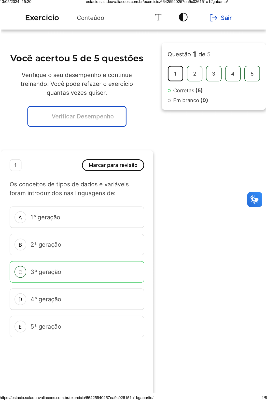 Você acertou 5 de 5 questões Verifique o seu desempenho e continue treinando! Você pode refazer o exercício quantas vezes quiser. Verificar Desempenho A B C D E 1 Marcar para revisão Os conceitos de tipos de dados e variáveis foram introduzidos nas linguagens de: 1ª geração 2ª geração 3ª geração 4ª geração 5ª geração Questão 1 de 5 Corretas �5� Em branco �0� 1 2 3 4 5 Exercicio Conteúdo Sair 13/05/2024, 15:20 estacio.saladeavaliacoes.com.br/exercicio/66425940257ea9c026151a1f/gabarito/ https://estacio.saladeavaliacoes.com.br/exercicio/66425940257ea9c026151a1f/gabarito/ 1/8 Resposta correta Parabéns, você selecionou a alternativa correta. Confira o gabarito comentado! Gabarito Comentado Linguagens de 3ª geração são as chamadas de alto nível, pois uma única instrução em uma linguagem inteligível pelo homem (próximo da humana) pode corresponder a muitas instruções em linguagem de máquina. Linguagens de 3ª geração são linguagens de aplicação geral que se caracterizam por suportarem: Variáveis; Tipos de dados simples (caractere, inteiro, real e lógico) e estruturados (matrizes, vetores, registros); Instruções condicionais e repetitivas; Programação modular (funções e procedimentos). As linguagens de 3ª geração são as mais utilizadas atualmente, pois são mais fáceis de aprender e de usar. 2 Marcar para revisão Dentre as formas de conversão de programas de diferentes linguagens de programação, avalie as propriedades abaixo descritas a. Não traduz instruções que nunca são executadas b. Execução mais lenta que outros processos de conversão 13/05/2024, 15:20 estacio.saladeavaliacoes.com.br/exercicio/66425940257ea9c026151a1f/gabarito/ https://estacio.saladeavaliacoes.com.br/exercicio/66425940257ea9c026151a1f/gabarito/ 2/8 A B C D E Tais propriedades caracterizam que tipo de conversão? Interpretador puro Tradutor Compilador Montador Linkeditor Resposta correta Parabéns, você selecionou a alternativa correta. Confira o gabarito comentado! Gabarito Comentado No processo de "Interpretação Pura" ocorre a tradução e execução, imediata, do comando na linguagem de alto nível, dessa forma - apenas traduz o comando que será executado - e a execução é mais lenta, pois não há otimização 3 Marcar para revisão 13/05/2024, 15:20 estacio.saladeavaliacoes.com.br/exercicio/66425940257ea9c026151a1f/gabarito/ https://estacio.saladeavaliacoes.com.br/exercicio/66425940257ea9c026151a1f/gabarito/ 3/8 A B C D E O processo de tradução é realizado por uma série de programas. O programa que gera o código executável é o: carregador compilador interpretador ligador montador Resposta correta Parabéns, você selecionou a alternativa correta. Confira o gabarito comentado! Gabarito Comentado O ligador (ou link editor) junta o código- objeto com as bibliotecas necessárias (outros objetos, rotinas do SO, dlls etc.) para gerar o programa executável. ----- 4 Marcar para revisão O processo de tradução é erroneamente chamado de compilação. Qual a função do compilador no processo de tradução. 13/05/2024, 15:20 estacio.saladeavaliacoes.com.br/exercicio/66425940257ea9c026151a1f/gabarito/ https://estacio.saladeavaliacoes.com.br/exercicio/66425940257ea9c026151a1f/gabarito/ 4/8 A B C D E O compilador traduz um programa fonte escrito em linguagem de alto nível, em um código escrito em linguagem simbólica �Assembly) ou em linguagem de máquina ainda não executável O compilador lê o programa fonte escrito em Linguagem de alto nível e gera o código de máquina executável O compilador lê o programa fonte escrito em simbólica �Assembly) e gera o código de máquina executável O compilador junta vários códigos objetos em um úncico programa executável O compilador converte um código executável não relocável em código execuável relocável. Resposta correta Parabéns, você selecionou a alternativa correta. Confira o gabarito comentado! Gabarito Comentado O compilador é na verdade o primeiro passo do processo de traduçao de uma linguagem de alto nível em linguagem de máquina executável. O compilador recebe um programa escrito em linguagem de alto nível e o converte para uma linguagem simbólica, em geral assembly ou linguagem de maquina. 13/05/2024, 15:20 estacio.saladeavaliacoes.com.br/exercicio/66425940257ea9c026151a1f/gabarito/ https://estacio.saladeavaliacoes.com.br/exercicio/66425940257ea9c026151a1f/gabarito/ 5/8 A B C O compilador não gera código de máquina executável, mas sim código simbólico. O código simbólico é então convertido em código de máquina executável pelo montador. 5 Marcar para revisão Avalie as assertivas a seguir no que se refere aos conceitos pertinentes a classificação das Linguagens de Programação em níveis: I. O programa escrito na linguagem assembly ao ser convertido para o respectivo código de máquina, terá paridade 1�1, ou seja para 1 comando assembly teremos 1 comando de máquina. II. O programa escrito em uma linguagem de 3a geração, ao ser convertido para o respectivo código de máquina, terá paridade 1�1, ou seja para 1 comando em linguagem de alto nível de 3a geração teremos 1 comando de máquina. III. As linguagens de 4a e 5a gerações são denominadas declarativas, pois descreve-se a solução do problema e não especifica-se como resolver o problema, tal qual ocorre nas linguagens de 3a geração. Com base em sua análise das assertivas, assinale a alternativa que apresenta APENAS as assertivas CORRETAS. I e III I, II e III I 13/05/2024, 15:20 estacio.saladeavaliacoes.com.br/exercicio/66425940257ea9c026151a1f/gabarito/ https://estacio.saladeavaliacoes.com.br/exercicio/66425940257ea9c026151a1f/gabarito/ 6/8 D E III II Resposta correta Parabéns, você selecionou a alternativa correta. Confira o gabarito comentado! Gabarito Comentado I. O programa escrito na linguagem assembly ao ser convertido para o respectivo código de máquina, terá p