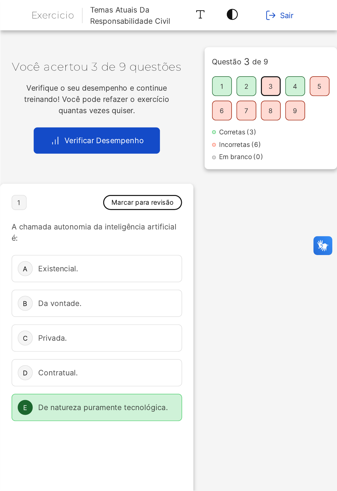 11/05/2024 13:59 https://estacio.saladeavaliacoes.com.br/exercicio/663f9f9c257ea9c026fc1ce7/gabarito/ https://estacio.saladeavaliacoes.com.br/exercicio/663f9f9c257ea9c026fc1ce7/gabarito/ 1/13 Você acertou 3 de 9 questões Verifique o seu desempenho e continue treinando! Você pode refazer o exercício quantas vezes quiser. Verificar Desempenho A B C D E 1 Marcar para revisão A chamada autonomia da inteligência artificial é: Existencial. Da vontade. Privada. Contratual. De natureza puramente tecnológica. Questão 3 de 9 Corretas �3� Incorretas �6� Em branco �0� 1 2 3 4 5 6 7 8 9 Exercicio Temas Atuais Da Responsabilidade Civil Sair 11/05/2024 13:59 https://estacio.saladeavaliacoes.com.br/exercicio/663f9f9c257ea9c026fc1ce7/gabarito/ https://estacio.saladeavaliacoes.com.br/exercicio/663f9f9c257ea9c026fc1ce7/gabarito/ 2/13 A B C Resposta correta Parabéns, você selecionou a alternativa correta. Confira o gabarito comentado! Gabarito Comentado A autonomia da inteligência artificial é de natureza puramente tecnológica. Isso significa que a capacidade de uma IA de operar e tomar decisões é inteiramente baseada em seu design e programação, não possuindo vontade própria, consciência ou existência independente. Portanto, a alternativa correta é a E� "De natureza puramente tecnológica". 2 Marcar para revisão São características da atividade dos influenciadores digitais, exceto: A possibilidade de atuação concentrada em nichos específicos. A velocidade de divulgação. A desnecessidade de indicação de parcerias patrocinadas. 11/05/2024 13:59 https://estacio.saladeavaliacoes.com.br/exercicio/663f9f9c257ea9c026fc1ce7/gabarito/ https://estacio.saladeavaliacoes.com.br/exercicio/663f9f9c257ea9c026fc1ce7/gabarito/ 3/13 D E A relação de intimidade com os seguidores. A confiança gerada nos seguidores. Resposta correta Parabéns, você selecionou a alternativa correta. Confira o gabarito comentado! Gabarito Comentado A alternativa correta é a letra C, que afirma a "desnecessidade de indicação de parcerias patrocinadas". Esta afirmação é incorreta, pois é uma exigência legal e ética que os influenciadores digitais declarem quando um conteúdo é patrocinado ou promovido por uma marca. As outras alternativas são características comuns da atividade dos influenciadores digitais: eles podem atuar em nichos específicos �A�, têm a capacidade de divulgar informações rapidamente �B�, geralmente têm uma relação de proximidade com seus seguidores �D� e são capazes de gerar confiança em seus seguidores �E�. 3 Marcar para revisão Violações aos direitos dos titulares no âmbito das relações de consumo: 11/05/2024 13:59 https://estacio.saladeavaliacoes.com.br/exercicio/663f9f9c257ea9c026fc1ce7/gabarito/ https://estacio.saladeavaliacoes.com.br/exercicio/663f9f9c257ea9c026fc1ce7/gabarito/ 4/13 A B C D E Atrairão o regime de responsabilidade da LGPD de natureza objetiva. Terão regime de responsabilidade agravado por conta da LGPD. Permanecerão sujeitas às regras de responsabilidade previstas na legislação específica sobre o tema. Atrairão o regime de responsabilidade da LGPD de natureza subjetiva. Atrairão o regime de responsabilidade da LGPD de natureza subjetiva com culpa presumida. Resposta incorreta Opa! A alternativa correta é a letra C. Confira o gabarito comentado! Gabarito Comentado A alternativa correta é a letra C� "Permanecerão sujeitas às regras de responsabilidade previstas na legislação específica sobre o tema". Isso significa que, mesmo com a existência da Lei Geral de Proteção de Dados �LGPD�, as violações aos direitos dos titulares no âmbito das relações de consumo continuarão a ser regidas pelas normas específicas já estabelecidas para esse tipo de situação. A LGPD não substitui ou agrava o regime de responsabilidade já existente, mas sim complementa e reforça 11/05/2024 13:59 https://estacio.saladeavaliacoes.com.br/exercicio/663f9f9c257ea9c026fc1ce7/gabarito/ https://estacio.saladeavaliacoes.com.br/exercicio/663f9f9c257ea9c026fc1ce7/gabarito/ 5/13 A B C a proteção dos dados pessoais no contexto geral. 4 Marcar para revisão A responsabilidade civil de influenciadores digitais é uma questão que vem levantando bastante debate atualmente. Nesse sentido, há quem defenda a responsabilidade de natureza objetiva em caso de produção de danos causados por produtos veiculados por influenciadores. Segundo essa corrente, a justificativa para tanto guarda relação com o fato: I. de os influenciadores receberem vantagem econômica. II. de os influenciadores se relacionarem de forma direta com seus seguidores, que são consumidores. III. de os influenciadores integrarem a cadeia de consumo, respondendo, assim, de forma subsidiária pelos danos eventualmente causados. Estão corretos os itens: I, II e III. I e II, somente. I e III, somente. 11/05/2024 13:59 https://estacio.saladeavaliacoes.com.br/exercicio/663f9f9c257ea9c026fc1ce7/gabarito/ https://estacio.saladeavaliacoes.com.br/exercicio/663f9f9c257ea9c026fc1ce7/gabarito/ 6/13 D E II e III, somente. I, somente. Resposta correta Parabéns, você selecionou a alternativa correta. Confira o gabarito comentado! Gabarito Comentado Justificativa: É importante ressaltar, conforme delineado por Barbosa, Britto e Silva �2019�, que a responsabilidade dos influenciadores não é integral e ilimitada, devendo estar relacionada à publicidade realizada: "Acerca da possibilidade dos produtos ou serviços serem acometidos posteriormente por vícios ou defeitos, entende-se que o influenciador que os promoveu digitalmente se exime de sua responsabilidade, vez que na hipótese de responsabilidade pelo fato do produto/serviço ou responsabilidade pelo vício do produto/serviço não possuirá relação direta com a publicidade ilícita vinculada, devendo o lesado acionar, exclusivamente, o fornecedor pelos prejuízos causados à sua incolumidade física/ps