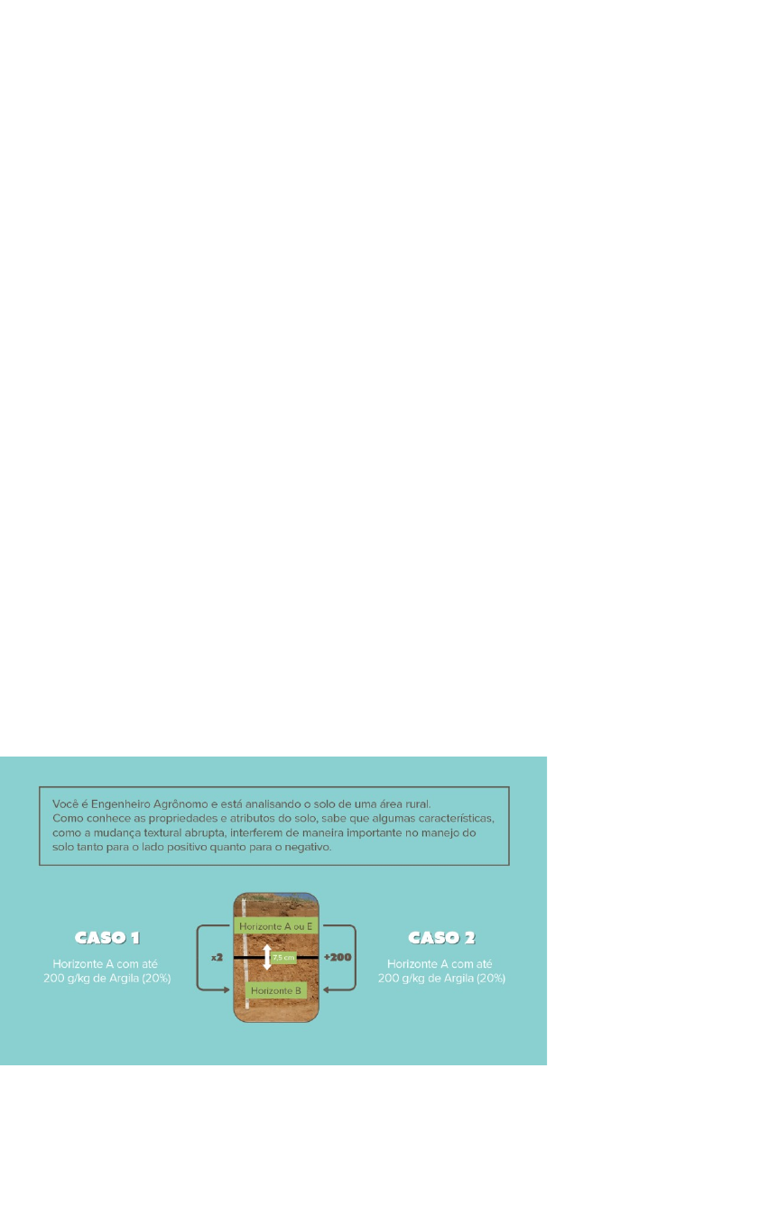 Sistema Brasileiro de Classificação de Solos (SiBCS) 1.Levando em conta as propriedades: cor, estrutura e textura, respectivamente, qual das alternativas abaixo representa o solo mais promissor para a exploração agrícola? C. Cor escura, estrutura em blocos angulares e textura argilosa. 2. Qual dos horizontes superficiais são mais interessantes para a exploração agrícola? B.Chernozêmico. 3. Quais as condições mais adequadas para o desenvolvimento do horizonte hístico? B. Excesso de água e frio. 4. Qual a principal diferença entre as argilas de alta e baixa atividade? A. A quantidade de cargas que elas apresentam. 5. O caráter ácrico não é desejável, pois: D. tem pouca quantidade de bases trocáveis (Ca, Mg e K). Desafio Alguns solos apresentam diferenças significativas na textura entre os horizontes superficiais e subsuperficiais. Na classificação de solos, é adotado um critério que define quando essa diferença é significativa; nesse caso, o critério é denominado mudança textural abrupta. A presença dessa mudança textural abrupta traz potencialidades e limitação aos solos que apresentam essa característica. Geralmente os solos com mudança textural abrupta são conhecidos como solos com gradiente textural. Veja a seguinte situação: Seu desafio é, levando em conta aspectos de fertilidade e da dinâmica da água, indicar quais as potencialidades e limitações que um solo com gradiente textural apresenta em relação a um solo com perfil mais uniforme e homogêneo em textura. Padrão de resposta esperado A mudança abrupta da textura faz com que ocorra o acúmulo de argila em subsuperfície. Como potencialidade, esse acúmulo de argila pode ser um importante reservatório de água, principalmente em temporadas de estiagem, pois a argila promove a estruturação do solo e o incremento de microporos que contribuem para o armazenamento de água. Como limitações, devido a esse contraste marcante de textura entre os horizontes superfical e susbsuperficial, a velocidade de infiltração ao longo do perfil ocorre de maneira distinta. Mais rápida no horizonte superficial e perde velocidade quando encontra o horizonte mais argiloso. Dessa forma, em épocas de chuvas de forte intensidade, é provável que a velocidade de infiltração de água no horizonte argiloso não seja suficiente para drenar toda a chuva, fazendo com que ocorra escoamento superficial da água, ou seja, o erodimento do horizonte superficial. Já em solos de perfis homogênios em relação à textura, não existe a potencialidade do reservatório em subsuperfície; no entanto, a drenagem e infiltração é mais livre e tem velocidade homogênea, o que faz com que seja reduzida a probabilidade de erosão. Atributos físico-químicos do solo: cor, textura, agregação e porosidade 1. A cor predominante de um solo reflete quais dos seus atributos? A. A sua umidade, composição mineralógica e processos pedogenéticos. 2. As partículas sólidas e minerais do solo são divididas de acordo com seu tamanho (diâmetro). Qual alternativa apresenta uma afirmação correta em relação a esse tópico? E. Todas as anteriores. 3. Você está visitando um campo para definir seu potencial para uso agrícola. Você se recorda desta unidade de aprendizagem e coleta uma pequena amostra de solo para estimar qual a classe textural do solo presente na área. A sua sensação tátil é de uma amostra sem aspereza e você consegue modelar o solo, formando rolinhos que se quebram com facilidade. Qual fração do solo predomina nesta amostra e por quê? E. Silte, que permite a modelagem da amostra e formação de rolinhos que não possuem, entretanto, a durabilidade da argila, quebrando-se facilmente. 4. Um solo de cor avermelhada possui qual mineral em grande quantidade? E. Nenhuma das respostas acima. 5. A porosidade de um solo está relacionada a sua fertilidade e estrutura. De que maneira a perda de porosidade afeta o crescimento de plantas e que nome se dá a esse fenômeno comum em solos agrícolas? E. Alternativas A, B e C. Desafio A determinação da classe textural de um solo e de suas camadas (ou horizontes) é atividade corriqueira, porém de fundamental importância para que se determine seu potencial de uso. Conhecendo todos os dados expostos, responda: 1: Qual o percentual de areia, silte e argila em cada uma destas amostras (Área 1 e Área 2)? 2: Utilizando o triângulo textural, identifique qual a classe textural de cada uma das amostras (Área 1 e Área 2). Atenção: esse desafio exige o uso de calculadora para realização de diversas operações. Padrão de resposta esperado 1: É importante notar que a massa total coletada em cada solo é de 20 g, que equivale ao valor de 100%. ÁREA 1: estimar quantidades por kg (g/kg) 8 g de areia em 20 g = 400 g em 1.000 g (1 kg) ou 400 g/kg 4 g de argila em 20 g = 200 g/kg A cada kilo de solo, tem-se 400 g de areia e 200 g de argila. Portanto, o restante necesário para se completar 1 kg é silte. 1000 - (400+200) = 1000 - 600 = 400 g/kg de silte Assim, é possível concluir que o solo da área 1 possui as seguintes proporções entre suas partículas: 40% em areia, 20% em argila e 40% em silte. ÁREA 2: estimar quantidades por kg (g/kg) 3 g de areia em 20 g = 150 g em 1.000 g (1 kg) ou 150 g/kg 12,5 g de argila em 20 g = 625 g/kg A cada kilo de solo, tem-se 150 g de areia e 165 g de argila. Portanto, o restante necessário para se completar 1 kg é silte. 1000 - (150+625) = 1000 - 775 = 225 g/kg de silte O solo da área 2 possui as seguintes proporções entre suas partículas: 15% em areia, 62,5% em argila e 22,5% em silte. 2: O triângulo textural é uma figura bastante simples à primeira vista mas seu uso exige atenção e prática. Área 1: É preciso localizar no eixo % de areia (base) o percentual corresponde ao calculado na questão 1, de 40%. Utilizando uma regra, traça-se uma reta paralela ao eixo do silte, á direita, até tocar no eixo da 