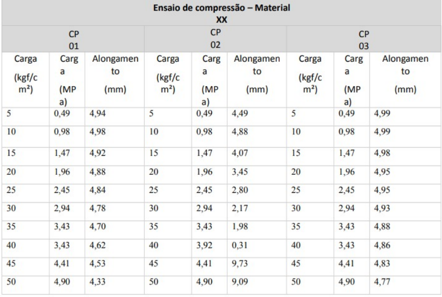 ROTEIRO 1. Crie uma tabela semelhante à apresentada abaixo para cada um dos materiais. Anote os valores da carga e alongamento sofrido pelo corpo, para intervalos de 5 kgf/cm². Note que a carga é dada pelo manômetro em kgf/cm² e a unidade requerida para a análise dos dados é MPa. Converta os valores obtidos no experimento utilizando a relação abaixo. 1kgf/cm² = 0.098067 Mpa 2. Utilizando os dados das tabelas criadas, construa o gráfico “Tensão (MPa) x Deformação” para o material ensaiado. 3. Com base nos gráficos construídos, realize os cálculos do módulo de elasticidade e tensão de compressão para os materiais ensaiados. AVALIAÇÃO DOS RESULTADOS 1. Durante a realização do ensaio de compressão, a carga aplicada sobre o corpo de prova proporciona ao material uma taxa de redução em seu comprimento inicial, até que deformação recomendada para o ensaio seja atingida. Qual porcentagem de redução no comprimento do corpo de prova após a realização do experimento? 50% 2. Qual das descrições abaixo melhor exprime o conceito de “Ductilidade” em materiais metálicos? Capacidade do material de deformar-se plasticamente antes da ruptura; 3. Qual o valor do módulo de elasticidade de latão vermelho que sofreu uma deformação no seu regime elástico de 0,00198 m e 200 MPa? 101 GPa. 4. Com base no experimento que você realizou pode-se afirmar que: Os materiais que mais se deformaram foram os que apresentaram menores índices de dureza; 5. Por que aplicar a pré-carga no material antes de realizar o ensaio de compressão de materiais metálicos? Para ajustar o sistema, eliminando as folgas inerentes à montagem; image1.png image2.png image3.png