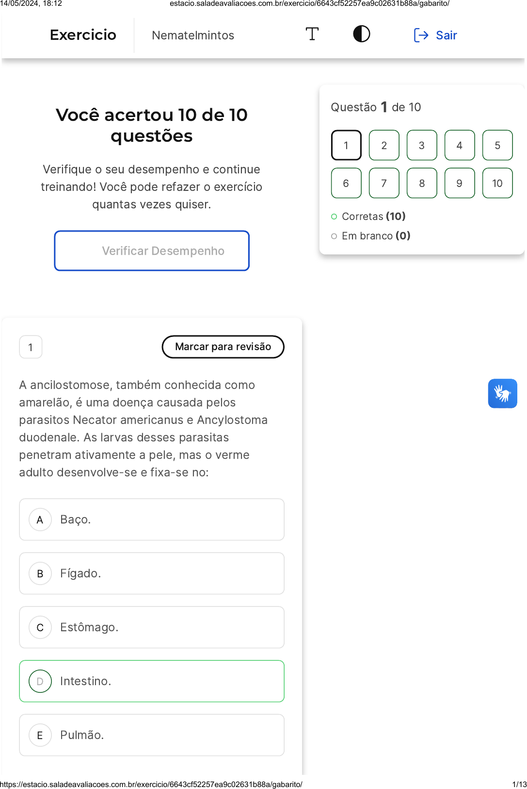 Você acertou 10 de 10 questões Verifique o seu desempenho e continue treinando! Você pode refazer o exercício quantas vezes quiser. Verificar Desempenho A B C D E 1 Marcar para revisão A ancilostomose, também conhecida como amarelão, é uma doença causada pelos parasitos Necator americanus e Ancylostoma duodenale. As larvas desses parasitas penetram ativamente a pele, mas o verme adulto desenvolve-se e fixa-se no: Baço. Fígado. Estômago. Intestino. Pulmão. Questão 1 de 10 Corretas �10� Em branco �0� 1 2 3 4 5 6 7 8 9 10 Exercicio Nematelmintos Sair 14/05/2024, 18:12 estacio.saladeavaliacoes.com.br/exercicio/6643cf52257ea9c02631b88a/gabarito/ https://estacio.saladeavaliacoes.com.br/exercicio/6643cf52257ea9c02631b88a/gabarito/ 1/13 Resposta correta Parabéns, você selecionou a alternativa correta. Confira o gabarito comentado! Gabarito Comentado Os parasitas Necator americanus e Ancylostoma duodenale, causadores da ancilostomose, têm um ciclo de vida complexo. Após a penetração ativa das larvas na pele do hospedeiro, elas viajam através da corrente sanguínea até os pulmões, de onde são tossidas e engolidas, chegando ao sistema digestivo. É no intestino que o verme adulto se desenvolve e se fixa, alimentando-se do sangue do hospedeiro. Portanto, a alternativa correta é o intestino. 2 Marcar para revisão A filariose linfática é uma doença parasitária crônica, considerada uma das maiores causas mundiais de incapacidades permanentes ou de longo prazo. Com relação ao parasita Wuchereria bancrofti, considere as afirmações: I. São vermes que habitam o intestino humano, podendo migrar para os vasos sanguíneos e linfáticos; II. São transmitidos por meio de picada dos mosquitos do gênero Culex, o popular pernilongo; III. A ocorrência da filariose bancroftiana é importante na região Nordeste brasileira. Está correto o que está contido apenas em: 14/05/2024, 18:12 estacio.saladeavaliacoes.com.br/exercicio/6643cf52257ea9c02631b88a/gabarito/ https://estacio.saladeavaliacoes.com.br/exercicio/6643cf52257ea9c02631b88a/gabarito/ 2/13 A B C D E I. II. III. I e II. II e III. Resposta correta Parabéns, você selecionou a alternativa correta. Confira o gabarito comentado! Gabarito Comentado As afirmações corretas são a II e a III. A afirmação II está correta porque o parasita Wuchereria bancrofti é de fato transmitido por meio da picada de mosquitos do gênero Culex, conhecido popularmente como pernilongo. A afirmação III também está correta, pois a filariose bancroftiana é uma doença de grande relevância na região Nordeste do Brasil. No entanto, a afirmação I está incorreta, pois o Wuchereria bancrofti não habita o intestino humano, mas sim o sistema linfático. 3 Marcar para revisão 14/05/2024, 18:12 estacio.saladeavaliacoes.com.br/exercicio/6643cf52257ea9c02631b88a/gabarito/ https://estacio.saladeavaliacoes.com.br/exercicio/6643cf52257ea9c02631b88a/gabarito/ 3/13 A B C D E Além da filariose linfática, causada pelo parasito Wuchereria bancrofti, existem outras espécies de filárias associadas a doenças em humanos. Qual espécie de filária também infecta humanos na América do Sul, em especial populações ribeirinhas e indígenas? Mansonella ozzardi. Wuchereria amazonensis. Loa loa. Trichinella spiralis. Angiostrongylus costaricensis. Resposta correta Parabéns, você selecionou a alternativa correta. Confira o gabarito comentado! Gabarito Comentado A espécie de filária que também infecta humanos na América do Sul, especialmente populações ribeirinhas e indígenas, é a Mansonella ozzardi. Esta espécie é um parasita que causa a doença conhecida como mansonelose, que é transmitida por mosquitos e é comum em áreas tropicais e subtropicais, incluindo partes da América do Sul. 14/05/2024, 18:12 estacio.saladeavaliacoes.com.br/exercicio/6643cf52257ea9c02631b88a/gabarito/ https://estacio.saladeavaliacoes.com.br/exercicio/6643cf52257ea9c02631b88a/gabarito/ 4/13 A B C D E 4 Marcar para revisão A ancilostomose (ou amarelão, opilação ou ainda "doença do Jeca Tatu") é uma doença ainda muito disseminada em nosso país, tendo como agentes patogênicos o Necator americanus e o Ancylostoma duodenale. Com relação ao ciclo de vida desses helmintos e à doença causada por eles, podemos afirmar que: Seu ciclo de vida é heteroxeno, porque possui dois hospedeiros: o homem (hospedeiro intermediário), e o mosquito Culex fatigans (como hospedeiro definitivo). Esses vermes são parasitas intestinais, porém alimentam-se de sangue, causando uma anemia profunda, típica da doença. A principal forma de contaminação no meio rural faz-se pela ingestão de seus ovos embrionados, que foram eliminados pelas fezes de seus hospedeiros. Além da higiene alimentar e do uso de calçado, a vacinação da população também é uma importante medida profilática para se evitar a ocorrência dessa doença. Os vermes adultos localizam-se preferencialmente no estômago humano e são transmitidos pela picada do mosquito Culex. 14/05/2024, 18:12 estacio.saladeavaliacoes.com.br/exercicio/6643cf52257ea9c02631b88a/gabarito/ https://estacio.saladeavaliacoes.com.br/exercicio/6643cf52257ea9c02631b88a/gabarito/ 5/13 A B Resposta correta Parabéns, você selecionou a alternativa correta. Confira o gabarito comentado! Gabarito Comentado A alternativa correta é a B, que afirma que os vermes Necator americanus e Ancylostoma duodenale, causadores da ancilostomose, são parasitas intestinais que se alimentam de sangue, provocando uma anemia profunda, característica da doença. Esses helmintos se fixam na parede do intestino do hospedeiro e se alimentam do sangue que circula na região, levando à perda de sangue e, consequentemente, à anemia. A anemia causada pela ancilostomose é muitas vezes grave e pode levar a complicações sérias se não for tratada adequadamente. 5 Marcar para revisão Em países tropicais, muitas doenças importantes são transmiti