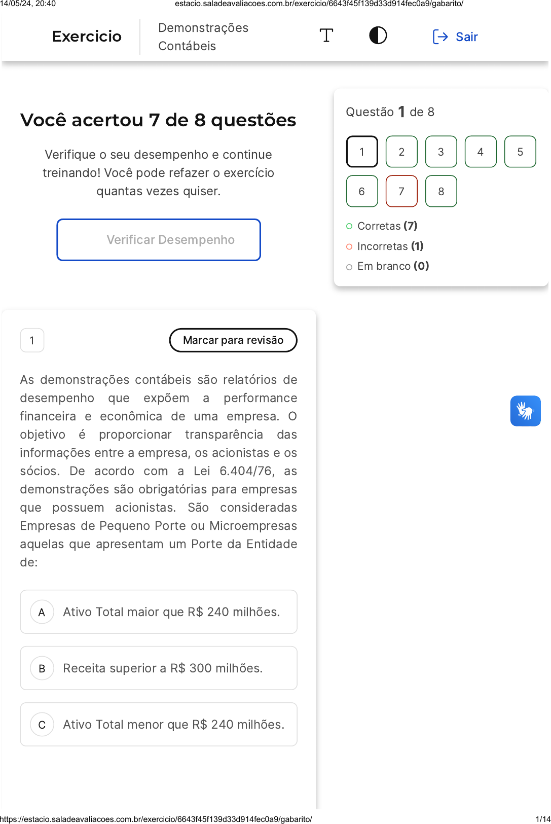 Você acertou 7 de 8 questões Verifique o seu desempenho e continue treinando! Você pode refazer o exercício quantas vezes quiser. Verificar Desempenho A B C 1 Marcar para revisão As demonstrações contábeis são relatórios de desempenho que expõem a performance financeira e econômica de uma empresa. O objetivo é proporcionar transparência das informações entre a empresa, os acionistas e os sócios. De acordo com a Lei 6.404/76, as demonstrações são obrigatórias para empresas que possuem acionistas. São consideradas Empresas de Pequeno Porte ou Microempresas aquelas que apresentam um Porte da Entidade de: Ativo Total maior que R$ 240 milhões. Receita superior a R$ 300 milhões. Ativo Total menor que R$ 240 milhões. Questão 1 de 8 Corretas �7� Incorretas �1� Em branco �0� 1 2 3 4 5 6 7 8 Exercicio Demonstrações Contábeis Sair 14/05/24, 20:40 estacio.saladeavaliacoes.com.br/exercicio/6643f45f139d33d914fec0a9/gabarito/ https://estacio.saladeavaliacoes.com.br/exercicio/6643f45f139d33d914fec0a9/gabarito/ 1/14 D E Receita entre R$ 3,6 milhões e R$ 300 milhões. Receita menor que R$ 3,6 milhões. Resposta correta Parabéns, você selecionou a alternativa correta. Confira o gabarito comentado! Gabarito Comentado Para serem classificadas como Empresas de Pequeno Porte ou Microempresas, as entidades devem apresentar uma receita anual inferior a R$ 3,6 milhões. Essa classificação é importante para determinar o regime tributário e as obrigações contábeis que a empresa deve seguir. Portanto, a alternativa correta é a "E", que afirma que a receita deve ser menor que R$ 3,6 milhões. 2 Marcar para revisão Ativo circulante é um bem ou direito que pode ser convertido em dinheiro em um curto prazo de tempo, dentro do ano fiscal da empresa (no máximo 12 meses). O ativo deve ser classificado como circulante quando satisfizer qualquer um dos seguintes critérios, a exceção de: 14/05/24, 20:40 estacio.saladeavaliacoes.com.br/exercicio/6643f45f139d33d914fec0a9/gabarito/ https://estacio.saladeavaliacoes.com.br/exercicio/6643f45f139d33d914fec0a9/gabarito/ 2/14 A B C D E Espera-se que seja realizado, ou pretende-se que seja vendido ou consumido no decurso normal do ciclo operacional da entidade. Está mantido essencialmente com o propósito de ser negociado. Espera-se que seja realizado até doze meses após a data do balanço. É caixa ou equivalente de caixa, a menos que sua troca ou uso para liquidação de passivo se encontre vedada durante pelo menos doze meses após a data do balanço. Espera-se que seja liquidado durante o ciclo operacional normal da entidade. Resposta correta Parabéns, você selecionou a alternativa correta. Confira o gabarito comentado! Gabarito Comentado O ativo deve ser classificado como circulante quando satisfizer qualquer um dos seguintes critérios: Espera-se que seja realizado, ou pretende-se que seja vendido ou consumido no decurso normal do ciclo operacional da entidade; Está mantido essencialmente com o propósito de ser negociado; 14/05/24, 20:40 estacio.saladeavaliacoes.com.br/exercicio/6643f45f139d33d914fec0a9/gabarito/ https://estacio.saladeavaliacoes.com.br/exercicio/6643f45f139d33d914fec0a9/gabarito/ 3/14 A B Espera-se que seja realizado até doze meses após a data do balanço; É caixa ou equivalente de caixa, a menos que sua troca ou uso para liquidação de passivo se encontre vedada durante pelo menos doze meses após a data do balanço. O passivo deve ser classificado como circulante quando satisfizer qualquer um dos seguintes critérios: Espera-se que seja liquidado durante o ciclo operacional normal da entidade; Está mantido essencialmente para a finalidade de ser negociado; Deve ser liquidado no período de até doze meses após a data do balanço; A entidade não tem direito incondicional de diferir a liquidação do passivo durante pelo menos doze meses após a data do balanço. 3 Marcar para revisão O passivo circulante é qualquer dívida que precise ser quitada em no máximo 12 meses. O passivo deve ser classificado como circulante quando satisfizer qualquer um dos seguintes critérios, à exceção de: Espera-se que seja liquidado durante o ciclo operacional normal da entidade. Está mantido essencialmente para a finalidade de ser negociado. 14/05/24, 20:40 estacio.saladeavaliacoes.com.br/exercicio/6643f45f139d33d914fec0a9/gabarito/ https://estacio.saladeavaliacoes.com.br/exercicio/6643f45f139d33d914fec0a9/gabarito/ 4/14 C D E Deve ser liquidado no período de até doze meses após a data do balanço. A entidade não tem direito incondicional de diferir a liquidação do passivo durante pelo menos doze meses após a data do balanço. Está mantido essencialmente com o propósito de ser negociado. Resposta correta Parabéns, você selecionou a alternativa correta. Confira o gabarito comentado! Gabarito Comentado O conceito de passivo circulante engloba todas as dívidas que devem ser quitadas em até 12 meses. Para que um passivo seja classificado como circulante, ele deve atender a pelo menos um dos seguintes critérios: Espera-se que seja liquidado durante o ciclo operacional normal da entidade; Está mantido essencialmente para a finalidade de ser negociado; Deve ser liquidado no período de até doze meses após a data do balanço; A entidade não tem direito incondicional de diferir a liquidação do passivo durante pelo menos doze meses após a data do balanço. A alternativa E, que afirma que o passivo "está mantido essencialmente com o propósito de ser negociado", é a única que não se encaixa nos critérios para classificação de um passivo como circulante. Isso porque a negociação de um 14/05/24, 20:40 estacio.saladeavaliacoes.com.br/exercicio/6643f45f139d33d914fec0a9/gabarito/ https://estacio.saladeavaliacoes.com.br/exercicio/6643f45f139d33d914fec0a9/gabarito/ 5/14 A B C D E passivo não implica necessariamente em sua liquidação dentro do prazo de 12 meses, que é o critério fundamen