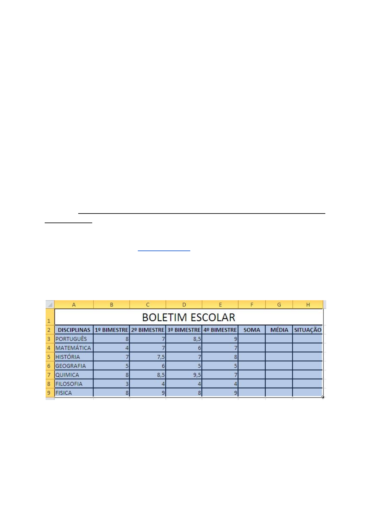 de exercícios ficará no MESMO arquivo​ já criado .xls ou .xlsx.