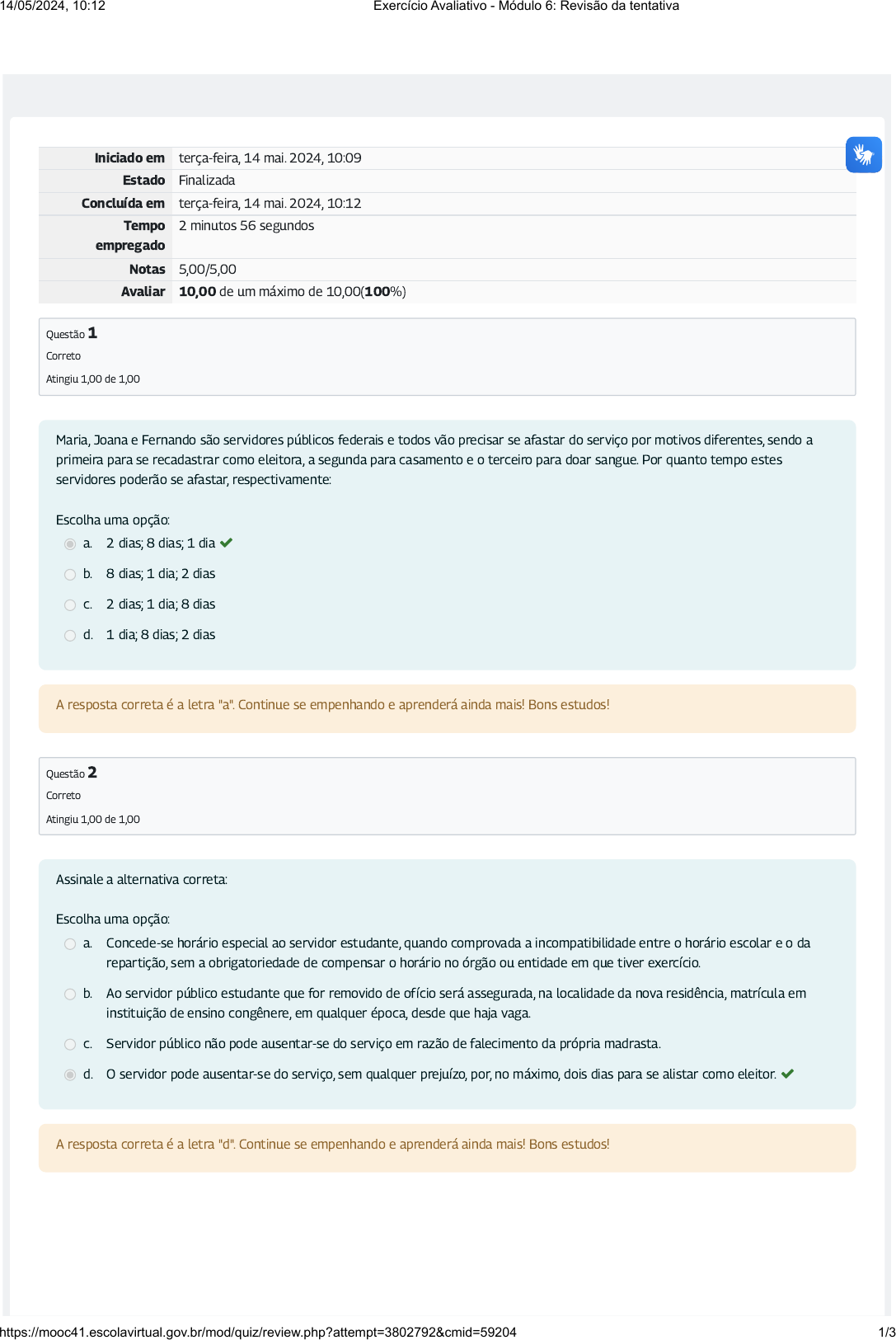 Iniciado em terça-feira, 14 mai. 2024, 10:09 Estado Finalizada Concluída em terça-feira, 14 mai. 2024, 10:12 Tempo empregado 2 minutos 56 segundos Notas 5,00/5,00 Avaliar 10,00 de um máximo de 10,00(100%) Questão 1 Correto Atingiu 1,00 de 1,00 Questão 2 Correto Atingiu 1,00 de 1,00 Maria, Joana e Fernando são servidores públicos federais e todos vão precisar se afastar do serviço por motivos diferentes, sendo a primeira para se recadastrar como eleitora, a segunda para casamento e o terceiro para doar sangue. Por quanto tempo estes servidores poderão se afastar, respectivamente: Escolha uma opção: a. 2 dias; 8 dias; 1 dia b. 8 dias; 1 dia; 2 dias c. 2 dias; 1 dia; 8 dias d. 1 dia; 8 dias; 2 dias A resposta correta é a letra "a". Continue se empenhando e aprenderá ainda mais! Bons estudos! Assinale a alternativa correta: Escolha uma opção: a. Concede-se horário especial ao servidor estudante, quando comprovada a incompatibilidade entre o horário escolar e o da repartição, sem a obrigatoriedade de compensar o horário no órgão ou entidade em que tiver exercício. b. Ao servidor público estudante que for removido de ofício será assegurada, na localidade da nova residência, matrícula em instituição de ensino congênere, em qualquer época, desde que haja vaga. c. Servidor público não pode ausentar-se do serviço em razão de falecimento da própria madrasta. d. O servidor pode ausentar-se do serviço, sem qualquer prejuízo, por, no máximo, dois dias para se alistar como eleitor. A resposta correta é a letra "d". Continue se empenhando e aprenderá ainda mais! Bons estudos! 14/05/2024, 10:12 Exercício Avaliativo - Módulo 6: Revisão da tentativa https://mooc41.escolavirtual.gov.br/mod/quiz/review.php?attempt=3802792&cmid=59204 1/3 Questão 3 Correto Atingiu 1,00 de 1,00 Questão 4 Correto Atingiu 1,00 de 1,00 Das a�rmativas abaixo, selecione aquela em que o tempo é contabilizado para efeitos de aposentadoria e disponibilidade: Escolha uma opção: a. O tempo de serviço público prestado aos Estados, Municípios e Distrito Federal somente será considerado para �ns de aposentadoria b. O tempo de missão ou estudo no exterior, quando autorizado o afastamento, conforme dispuser o regulamento c. O tempo de serviço em atividade privada, vinculada à Previdência Social. d. O tempo de serviço relativo a tiro de guerra será considerado para disponibilidade. A resposta correta é a letra "c". Continue se empenhando e aprenderá ainda mais! Bons estudos! Quanto ao direito de petição garantido ao servidor público na Lei nº 8.112/90, considere a alternativa correta: Escolha uma opção: a. O recurso contra o deferimento ou indeferimento do pedido de reconsideração deverá ser recebido pela autoridade julgadora, que suspenderá, em qualquer hipótese, os efeitos da decisão recorrida. b. O requerimento e o pedido de reconsideração deverão ser despachados no prazo de cinco dias e decididos dentro de trinta dias. c. A prescrição é de ordem interna, podendo ser relevada pela administração, observado o prazo de cento e oitenta dias contados a partir da ciência, pelo interessado, da decisão recorrida. d. O recurso contra o deferimento ou indeferimento do pedido de reconsideração será julgado por intermédio da autoridade a que estiver subordinado o requerente, considerado o prazo de quinze dias a contar da baixa da decisão impugnada. A resposta correta é a letra "b". Continue se empenhando e aprenderá ainda mais! Bons estudos! 14/05/2024, 10:12 Exercício Avaliativo - Módulo 6: Revisão da tentativa https://mooc41.escolavirtual.gov.br/mod/quiz/review.php?attempt=3802792&cmid=59204 2/3 Questão 5 Correto Atingiu 1,00 de 1,00 Ao servidor é garantido o direito de requerer, pedir reconsideração e recorrer de decisões, salvo previsão legal especí�ca, no prazo de: Escolha uma opção: a. 5 dias b. 10 dias c. 15 dias d. 30 dias A resposta correta é a letra "d". Continue se empenhando e aprenderá ainda mais! Bons estudos! 14/05/2024, 10:12 Exercício Avaliativo - Módulo 6: Revisão da tentativa https://mooc41.escolavirtual.gov.br/mod/quiz/review.php?attempt=3802792&cmid=59204 3/3