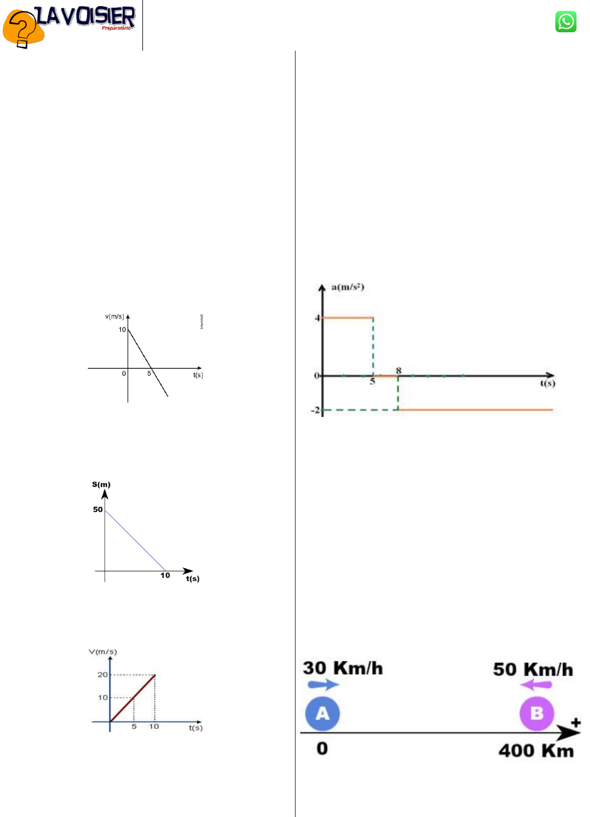 99 99165-2562 1. Uma partícula em movimento retilíneo movimenta-se de acordo com a equação v = 10 + 3t, com o espaço em metros e o tempo em segundos. Determine para essa partícula: a) A velocidade inicial b) A aceleração c) A velocidade quando t=5s e t= 10s 2. Um gato realiza um MUV em trajetória retilínea e horizontal que obedece à função horária da velocidade V= – 20 + 5t em unidades do SI. Pede-se: a) a velocidade inicial e a aceleração b) o instante em que ele muda o sentido de seu movimento c) classificar o movimento em progressivo ou retrógrado, acelerado ou retardado, orientando a trajetória para a direita. d) Qual o tipo de movimento do gato nos instantes 2s e 10s 3. Seja o gráfico da velocidade em função do tempo de um corpo em movimento retilíneo uniformemente variado representado abaixo. Considerando a posição inicial desse movimento igual a 46 m, então a posição do corpo no instante t = 8 s é: a) 54 m. b) 62 m. c) 66 m. d) 74 m. 4. A partir do gráfico abaixo, escreva a função horária da posição para o móvel que executa movimento uniforme. a) S = 50 + 5.t b) S = 50 + 15.t c) S = 50 – 5.t d) S = 50 + 10.t e) S = 50 – 8.t 5. O movimento de um objeto pode ser descrito pelo gráfico velocidade versus tempo, apresentado na figura a seguir. Podemos afirmar que: a) a aceleração do objeto é 2,0 m/s2, e a distância percorrida em 5,0 s é 10,0 m. b) a aceleração do objeto é 4,0 m/s2, e a distância percorrida em 5,0 s é 20,0 m. c) a aceleração do objeto é 2,0 m/s2, e a distância percorrida em 5,0 s é 25,0 m. d) a aceleração do objeto é 2,0 m/s2, e a distância percorrida em 5,0 s é 10,0 m. e) a aceleração do objeto é 2,0 m/s2, e a distância percorrida em 5,0 s é 20,0 m. 6. A velocidade em função do tempo de um ponto material em movimento retilíneo uniformemente variado, expressa em unidades do SI, é v = 50 – 10t. Pode-se afirmar que, no instante t = 5,0 s, esse ponto material tem a) velocidade e aceleração nulas. B) velocidade nula e daí em diante não se movimenta mais. c) velocidade nula e aceleração a = – 10 m/s2. d) velocidade nula e a sua aceleração muda de sentido. e) aceleração nula e a sua velocidade muda de sentido. A aceleração de um móvel, que parte do repouso, varia com o tempo de acordo com o gráfico abaixo. O instante, contado a partir do início do movimento, no qual o móvel pára, é: a) 5s b) 6s c) 8s d) 13s e) 18s Um móvel parte do repouso e desenvolve uma aceleração constante de 3 m/s² durante 4 segundos. O deslocamento desse móvel foi de: a) 12,0 m b) 24,0 m c) 22,0 m d) 18,0 m e) 30,0 m Determine o tempo necessário para que os móveis da figura a seguir se encontrem. a) 2h b) 3h c) 4h d) 5h e) 6h Um motorista dirige seu carro a uma velocidade de 108 km/h quando avista a placa de pare. Ao acionar os freios, ocorre uma desaceleração constante, e o carro leva um tempo de 3,0 s até parar completamente. A distância percorrida pelo automóvel até a frenagem total é de: a) 45,0 m b) 15,0 m c) 300,0 m d) 324,0 m e) 36,0 m A função horária da posição de um ponto material, dada em unidades do Sistema Internacional, que se move com aceleração constante é fornecida a seguir: S = 15 + 10.t + 2.t² Sua velocidade inicial, posição inicial e aceleração são respectivamente iguais a: a) S0 = 2 m, v0 = 15 m/s e a = 10 m/s2 b) S0 = 10 m, v0 = 15 m/s e a = 2 m/s2 c) S0 = 15 km, v0 = 10 km/h e a = 2 m/s2 d) S0 = 15 m, v0 = 10 m/s e a= 4 m/s2 e) S0 = 4 m, v0 = 10 m/s e a= 15 m/s2 Certo móvel, inicialmente na velocidade de 3 m/s, acelera constantemente a 2 m/s2 até se distanciar 4 m de sua posição inicial. O intervalo de tempo decorrido até o término desse deslocamento foi de: a) 4,0 s b) 1,0 s c) 3,0 s d) 5,0 s e) 2,5 s Um ponto material parte do repouso em movimento uniformemente variado e, após percorrer 12 m, está animado de uma velocidade escalar de 6,0 m/s. A aceleração escalar do ponto material, em m/s, vale: a) 1,5. b) 1,0. c) 2,5. d) 2,0. e) n.d.a. Rua 20, nº 15, Vila Viana, Grajaú-MA image4.jpeg image5.jpeg image1.png image2.jpeg image3.jpeg image6.png image7.png