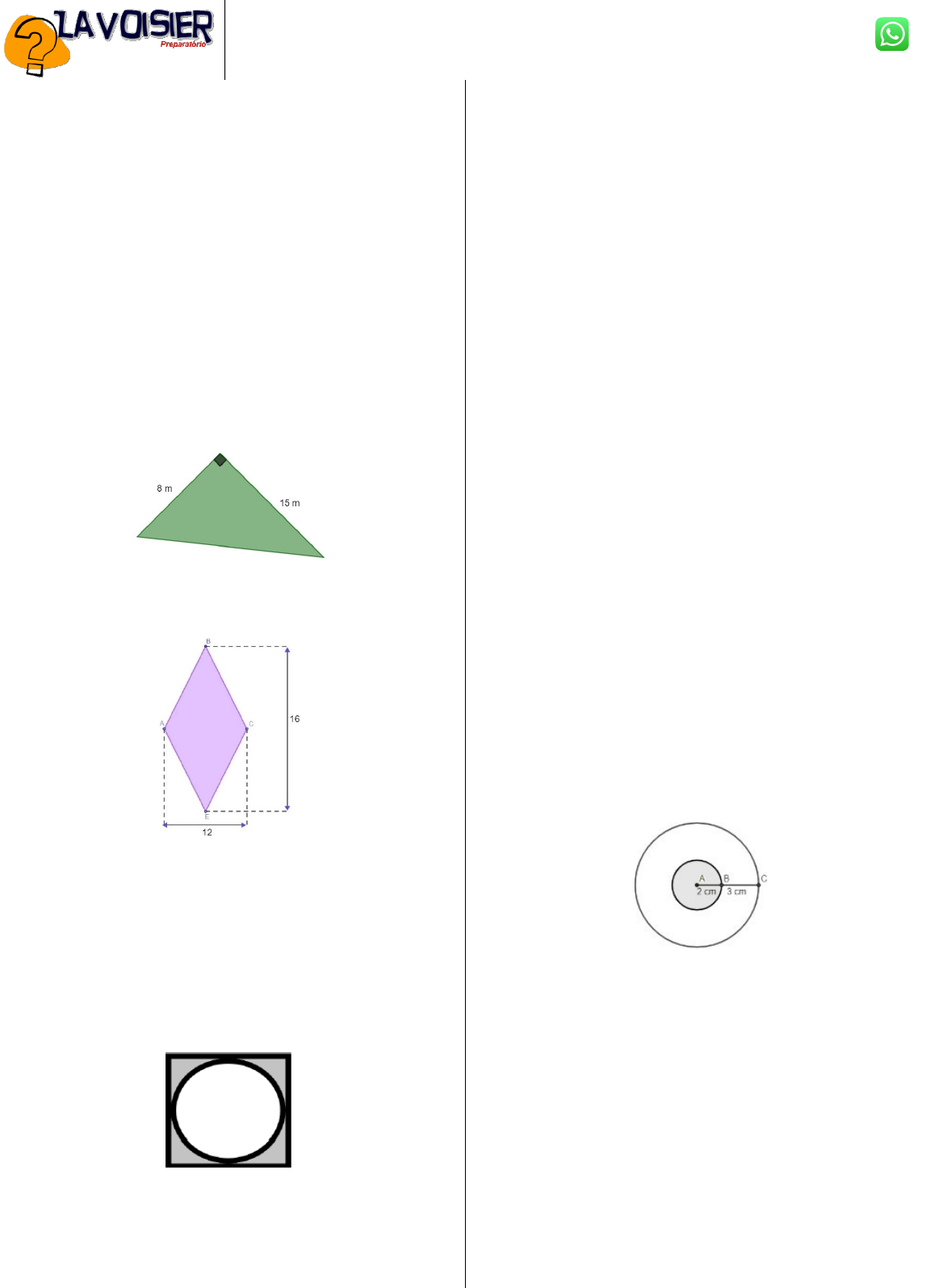 99 99165-2562 MATEMÁTICA Figuras Planas 1. Das figuras geométricas a seguir, marque a alternativa que possui somente figuras planas: A) Cubo, triângulo, pirâmide, circunferência. B) Quadrado, retângulo, cone, trapézio. C) Pentágono, círculo, quadrilátero, triângulo. D) Esfera, retângulo, hexágono, prisma. 2. A área de um quadrado é de 2,56 m². Nessas condições, podemos afirmar que a medida do seu lado é de: A) 1,28 m² B) 1,44 m² C) 1,55 m² D) 1,60 m² E) 1,80 m² 3. Um trapézio retângulo tem bases 5 e 2 e altura 4. O perímetro desse trapézio é: A) 13 B) 14 C) 15 D) 16 E) 17 4. Um terreno possui formato de triângulo retângulo. Qual é a área desse terreno? A) 40 m² B) 50 m² C) 60 m² D) 70 m² E) 80 m2 5. Analise a forma geométrica a seguir, sabendo que a medida dos lados dessa figura foi dada em centímetros. A área desse polígono é igual a: A) 80 cm² B) 96 cm² C) 144 cm² D) 192 cm² E) 216 cm² 6. A diagonal maior de um losango mede 18 cm, e a diagonal menor é 2/3 da diagonal maior, então a medida da área desse losango é de: A) 108 cm² B) 152 cm² C) 164 cm² D) 170 cm² E) 177 cm² Calcule a área hachurada na imagem abaixo sabendo que se trata de uma circunferência inscrita em um quadrado de lado 8 cm: (considere π = 3,14). A) 136,96 cm² B) 64 cm² C) 20,84 cm² D) 13,76 cm² D) 4,14 cm². 7. Marcelo e Renato herdaram de seu pai terrenos, cada um de mesma área. O terreno de Marcelo possui formato retangular com lados medindo 18 metros e 50 metros. Sabendo que o terreno de Renato é um quadrado, a medida do lado desse terreno é: A) 12 metros B) 15 metros C) 20 metros D) 25 metros E) 30 metros 8. Na fase final da construção de um ginásio, um pedreiro necessita ladrilhar o chão que representa uma base retangular, cujas dimensões são 18 metros e 32 metros. Os ladrilhos utilizados são quadrados com 24 centímetros de lado. O número de ladrilhos necessários para revestir o espaço é de A) 100.000 B) 10.000 C) 1.000 D) 100 9. Uma praça será construída no formato de um círculo de diâmetro medindo 12 metros. Para preservação da área verde da cidade, a prefeitura determinou que 60% dessa praça deve ser composta por área verde. Utilizando π= 3,1, podemos afirmar que a área verde da praça mede, em metros quadrados, aproximadamente: A) 112 B) 97 C) 82 D) 78 E) 67 10. Um objeto retangular possui área de 192 cm². Se a medida do comprimento desse objeto é de 16 cm, a medida da largura é: A) 10 cm B) 11 cm C) 12 cm D) 13 cm E) 14 cm 11. Em um terreno retangular, com 25 metros de comprimento e 36 metros de largura, será separada uma região com o formato de um quadrado de lado medindo 7 metros para a construção de um jardim. A área restante do terreno mede: A) 951 B) 949 C) 900 D) 851 E) 849 12. No projeto da casa de Kárita há o desenho de uma área de lazer no formato de um quadrado, com 8 metros de lado. Nessa área de lazer haverá uma piscina circular com 4 metros de diâmetro, e a área restante será utilizada para a construção de um espaço de confraternização. Nessas condições, a área do espaço de confraternização medirá: (Use π = 3.) A) 52 metros B) 64 metros C) 32 metros D) 26 metros E) 18 metros 13. Analise a imagem a seguir: Podemos afirmar que a área branca mede: A) 25π B) 12π C) 18π D) 20π E) 21π 14. Um terreno possui formato de um trapézio, com bases medindo 15 metros e 20 metros e a altura medindo 10 metros. Se a metade desse terreno será utilizada para a construção de uma casa, então a área construída desse terreno é de: A) 175,0 m² B) 105,5 m² C) 87,5 m² D) 82,5 m² E) 78,0 m² 15. Um fabricante recomenda que, para cada m² do ambiente a ser climatizado, são necessários 800 BTUh, desde que haja até duas pessoas no ambiente. A esse número devem ser acrescentados 600 BTUh para cada pessoa a mais, e também para cada aparelho eletrônico emissor de calor no ambiente. A seguir, encontram-se as cinco opções de aparelhos desse fabricante e suas respectivas capacidades térmicas: · Tipo I: 10 500 BTUh · Tipo II: 11 000 BTUh · Tipo III: 11 500 BTUh · Tipo IV: 12 000 BTUh · Tipo V: 12 500 BTUh O supervisor de um laboratório precisa comprar um aparelho para climatizar o ambiente. Nele ficarão duas pessoas mais uma centrífuga que emite calor. O laboratório tem forma de trapézio retângulo, com as medidas apresentadas na figura. Para economizar energia, o supervisor deverá escolher o aparelho de menor capacidade térmica que atenda às necessidades do laboratório e às recomendações do fabricante. A escolha do supervisor recairá sobre o aparelho do tipo A) I B) II C) III D) IV E) V 16. Um senhor, pai de dois filhos, deseja comprar dois terrenos, com áreas de mesma medida, um para cada filho. Um dos terrenos visitados já está demarcado e, embora não tenha um formato convencional (como se observa na Figura B), agradou ao filho mais velho e, por isso, foi comprado. O filho mais novo possui um projeto arquitetônico de uma casa que quer construir, mas, para isso, precisa de um terreno na forma retangular (como mostrado na Figura A) cujo comprimento seja 7 m maior do que a largura. Para satisfazer o filho mais novo, esse senhor precisa encontrar um terreno retangular cujas medidas, em metro, do comprimento e da largura sejam iguais, respectivamente, a A) 7,5 e 14,5 B) 9,0 e 16,0 C) 9,39,3 e 16,3 D) 10,0 e 17,0 E) 13,5 e 20,5 17. Uma administração municipal encomendou a pintura de dez placas de sinalização para colocar em seu pátio de estacionamento. O profissional contratado para o serviço inicial pintará o fundo de dez placas e cobrará um valor de acordo com a área total dessas placas. O formato de cada placa é um círculo de diâmetro d = 40 cm, que tangencia lados de um retângulo, sendo que o comprimento total da placa é h = 60 cm, conforme ilustrado na figura. Use 3,14 como aproximação para π. Qual é a soma das medidas das áreas, em centímetros q